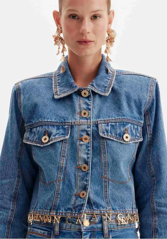 Casaco jeans em modelagem trucker, possui gola, mangas longas e fechamento por botões. O destaque da peça fica por conta dos pingentes localizados na barra da jaqueta, que assinam o nome da marca, tornando- a ainda mais personalizada. Atemporal, agrega conforto e estilo aos seus looks. Aposte!