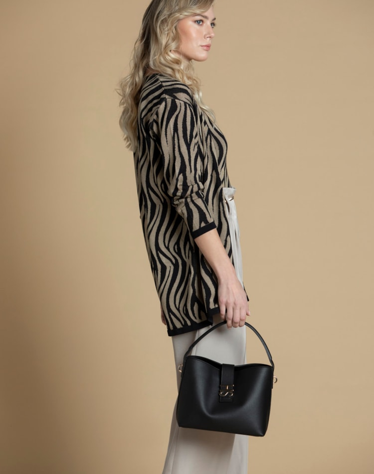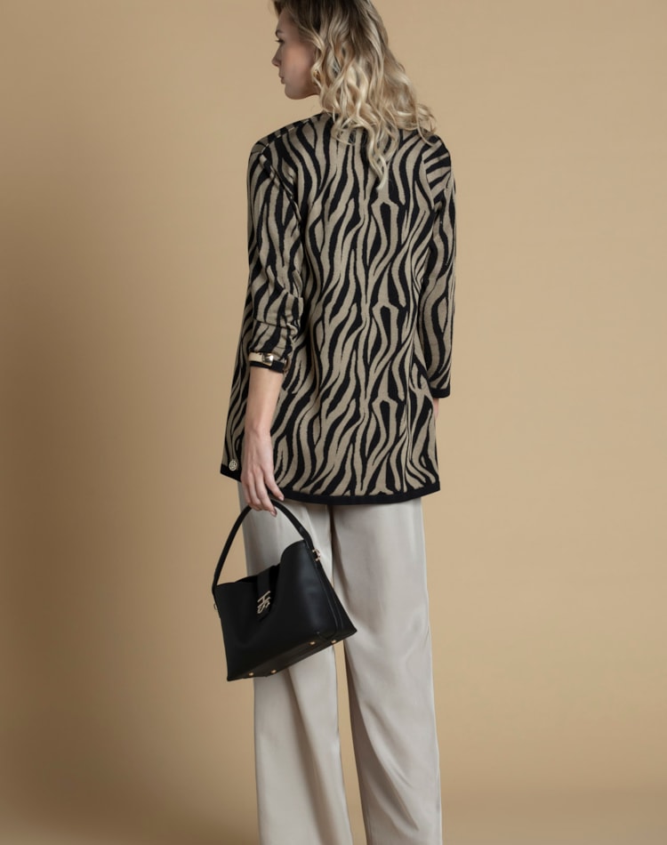Casaco com decote em bico e manga comprida. Fecho frontal com colchetes ocultos.