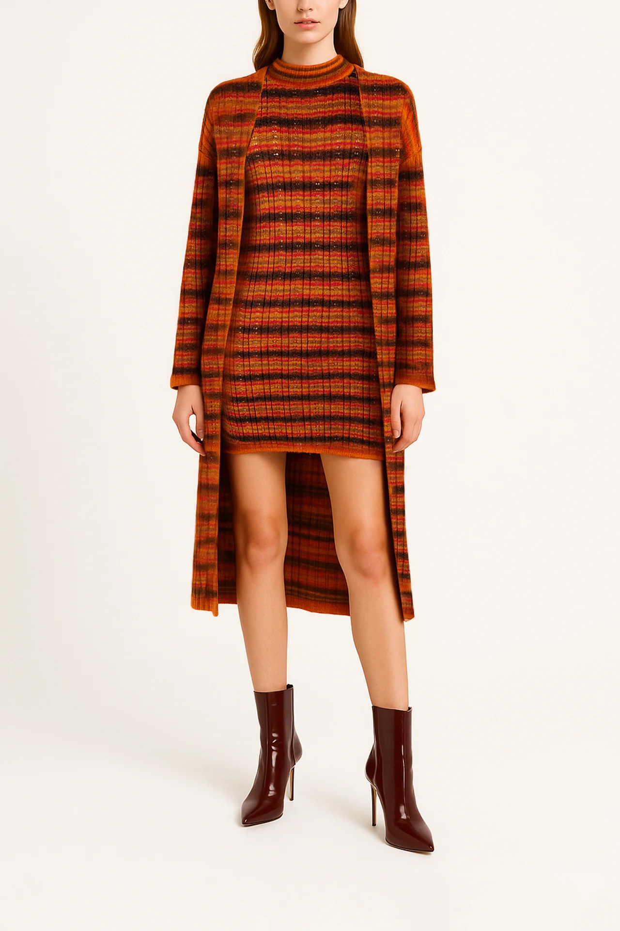 Cardigan longo em malha canelada, com queda fluida e textura acolhedora. A silhueta aberta permite criar sobreposições elegantes, enquanto o padrão de riscas acrescenta profundidade visual e modernidade. Uma peça essencial para completar coordenados monocromáticos ou combinar com o vestido e o top da mesma linha.