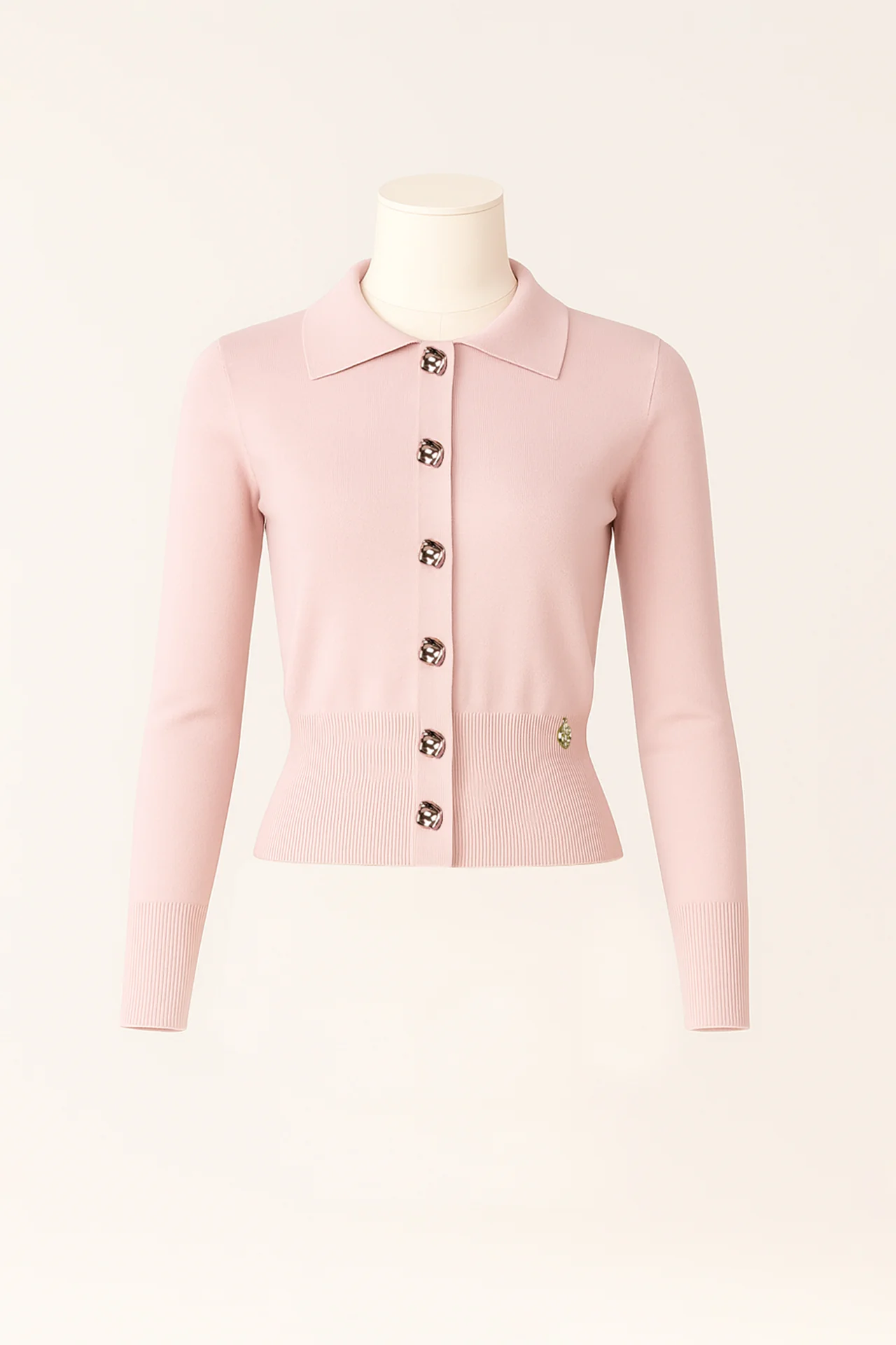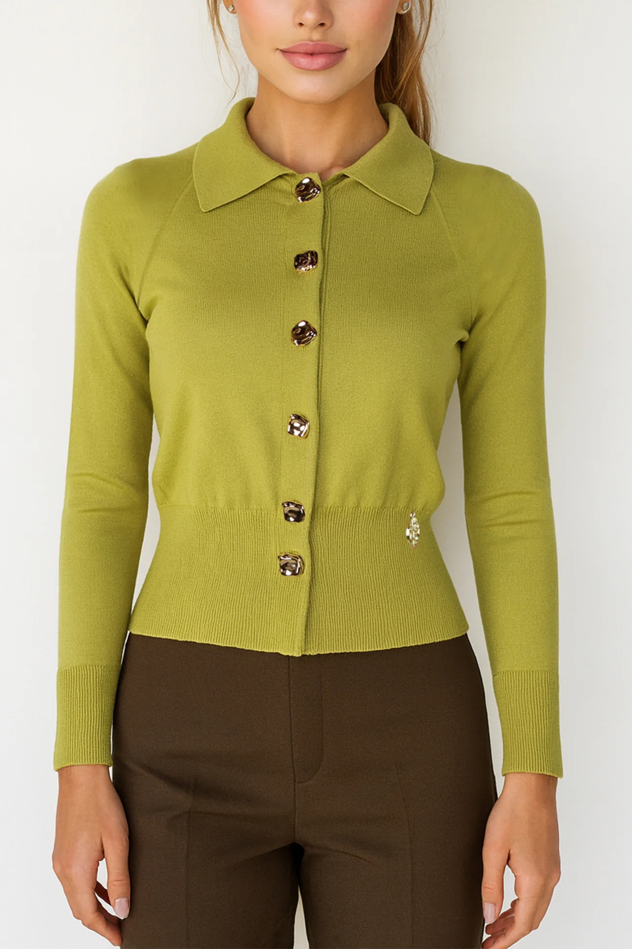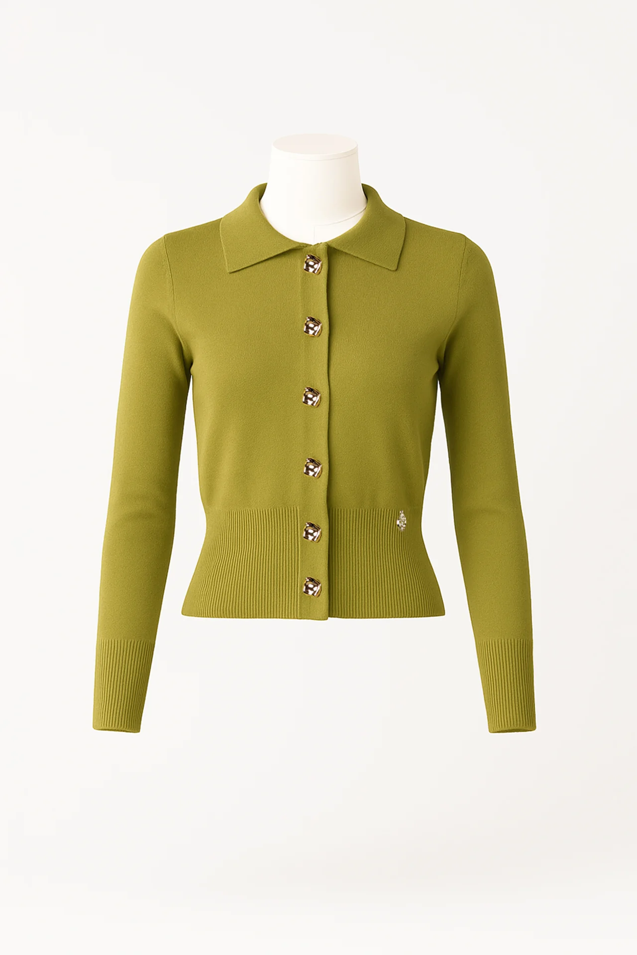 Cardigan em malha fina de toque suave e estrutura compacta. De corte curto e ajustado, apresenta gola clássica e punhos canelados que acentuam a silhueta. Os botões decorativos em tom metálico elevam a simplicidade da peça.