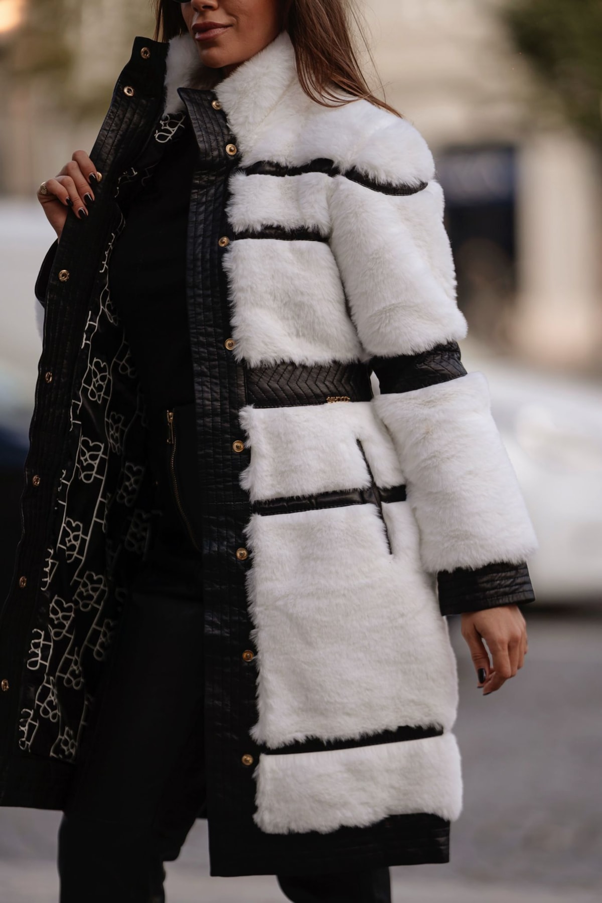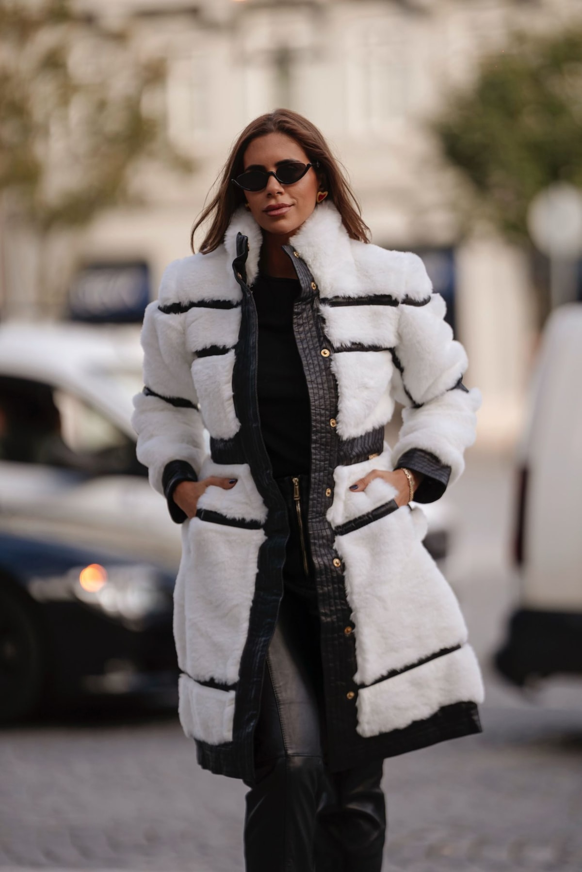 Com gola larga, fecho assimétrico e cinto ajustável na cintura, a peça redefine as linhas do icónico casaco em pele, conferindo-lhe um toque feminino e refinado.