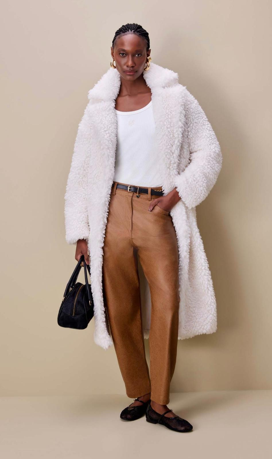 Confeccionado em tecido de pelos, o casaco de modelagem alongada conta com caimento confortável e mangas longas que envolvem o corpo com suavidade. O destaque fica por conta das maxi lapelas que reforçam o estilo imponente da peça.