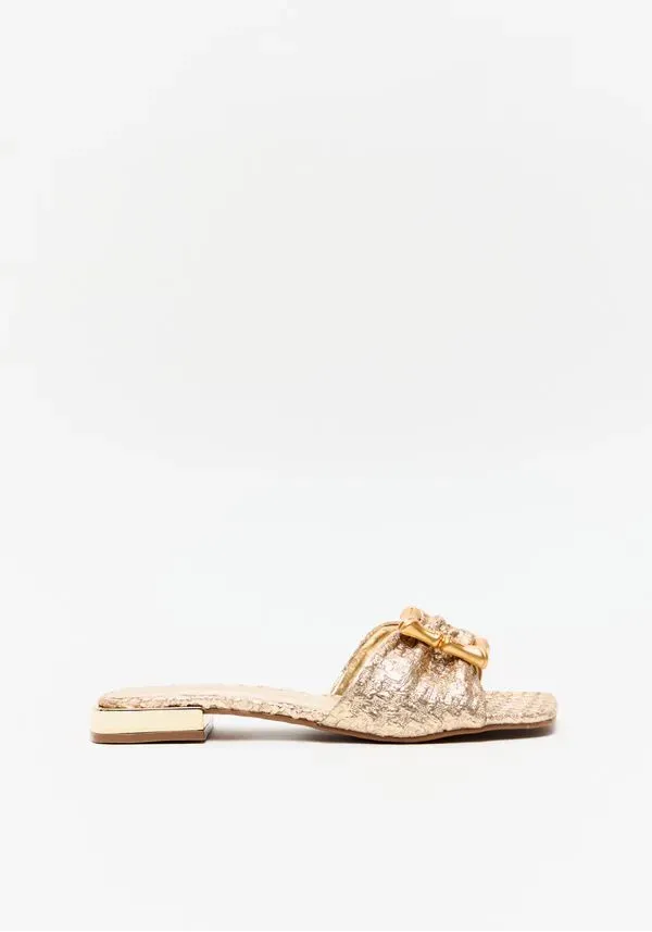 Chinelos rasteiros em palha metalizada traz sofisticação e modernidade ao clássico modelo flat. Com fivela maxi dourada como destaque, une conforto e estilo em uma peça versátil para produções do dia a dia ou looks mais elegantes de verão.