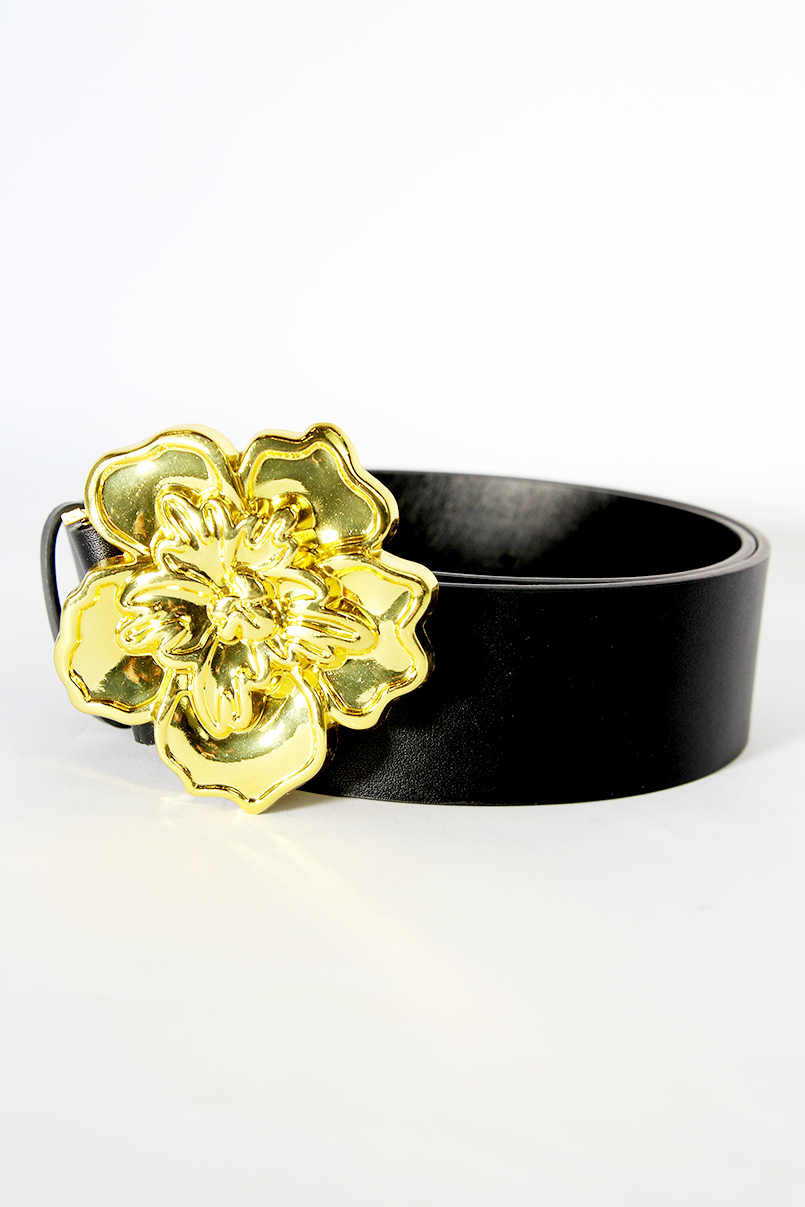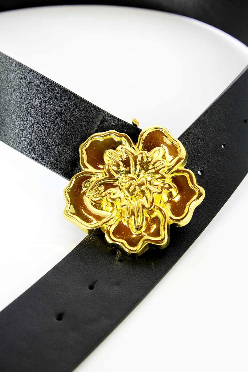 Cinto largo com fivela em forma de flor dourada.