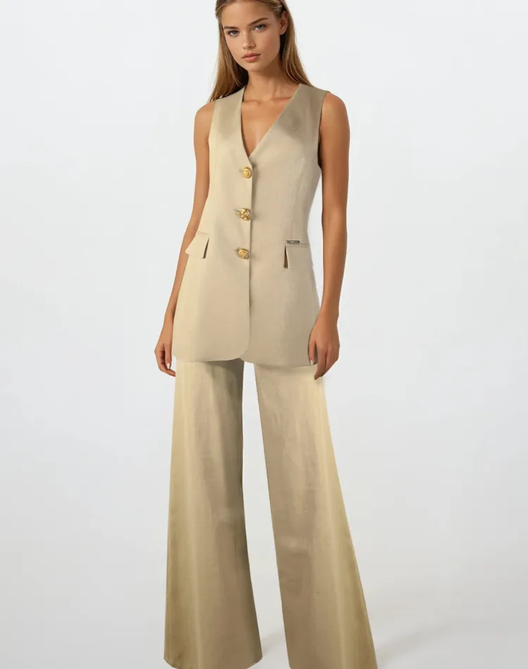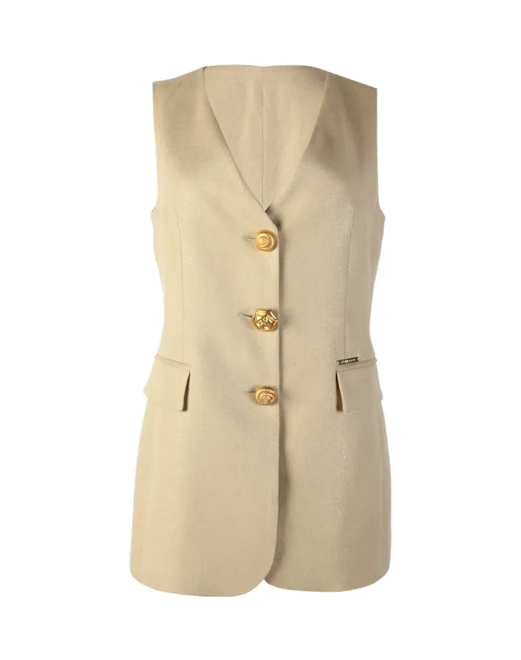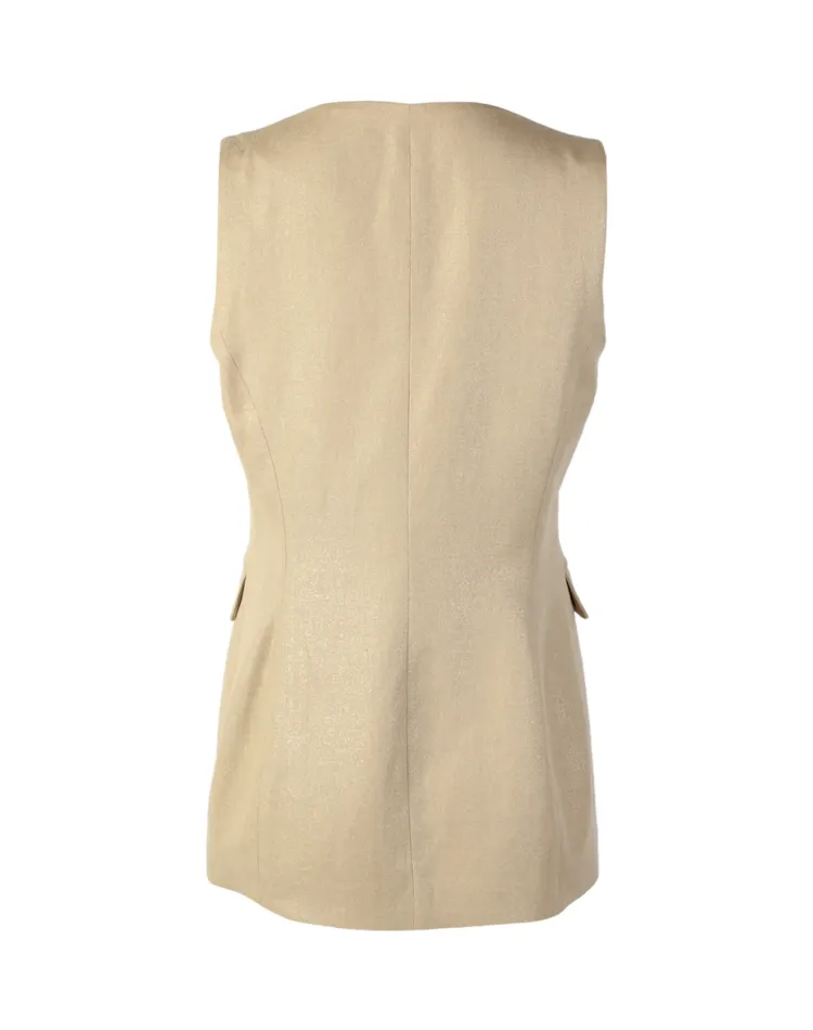 Colete justo com estrutura ajustada em linho, sem mangas. Bolsos com aba e fecho frontal com três botões dourados em forma de concha - um detalhe subtil com charme natural.