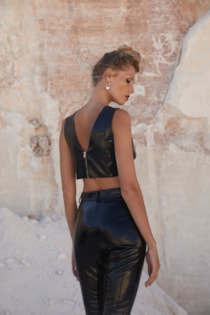 Top curto em tecido efeito vinil. Alças largas. Decote redondo. Fecho atrás com fecho de correr metálico.