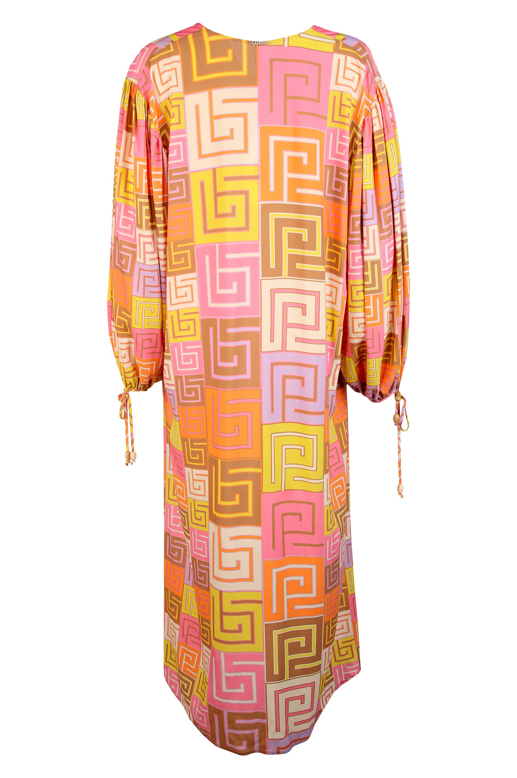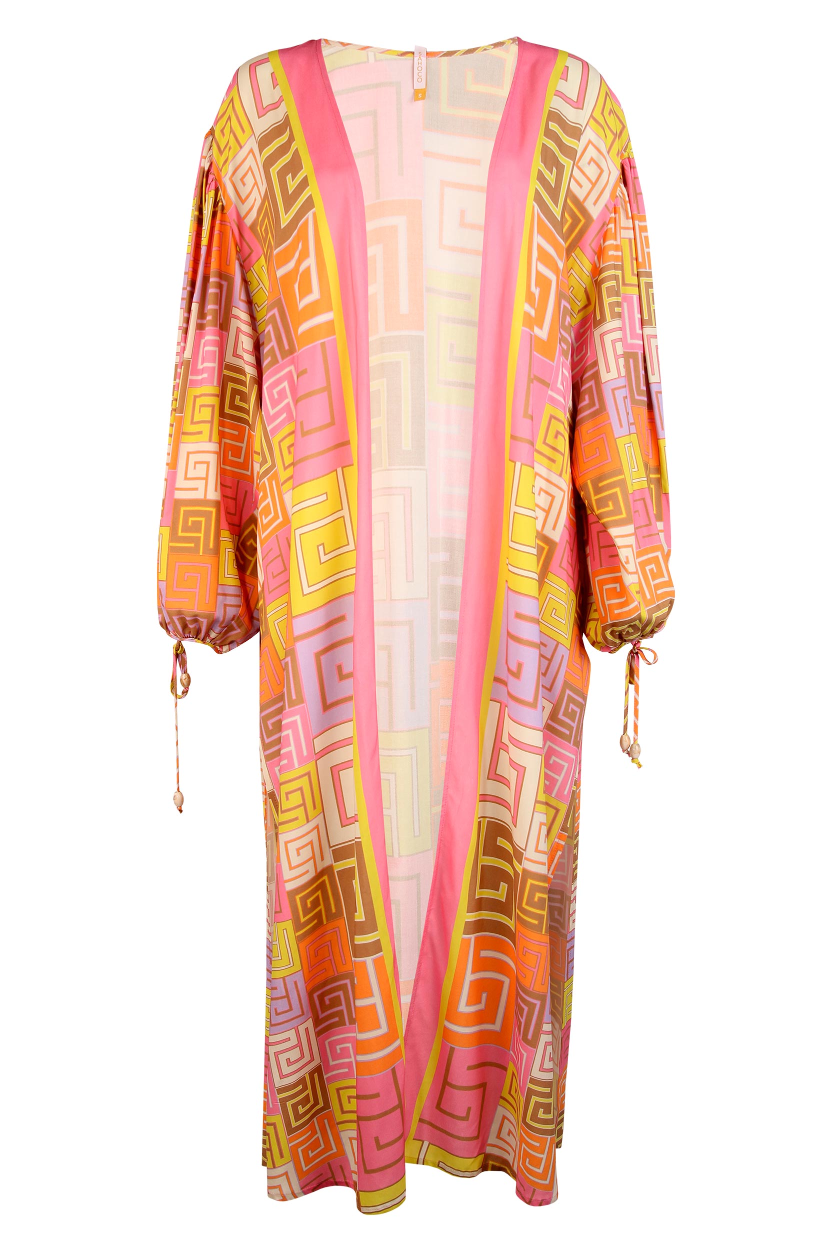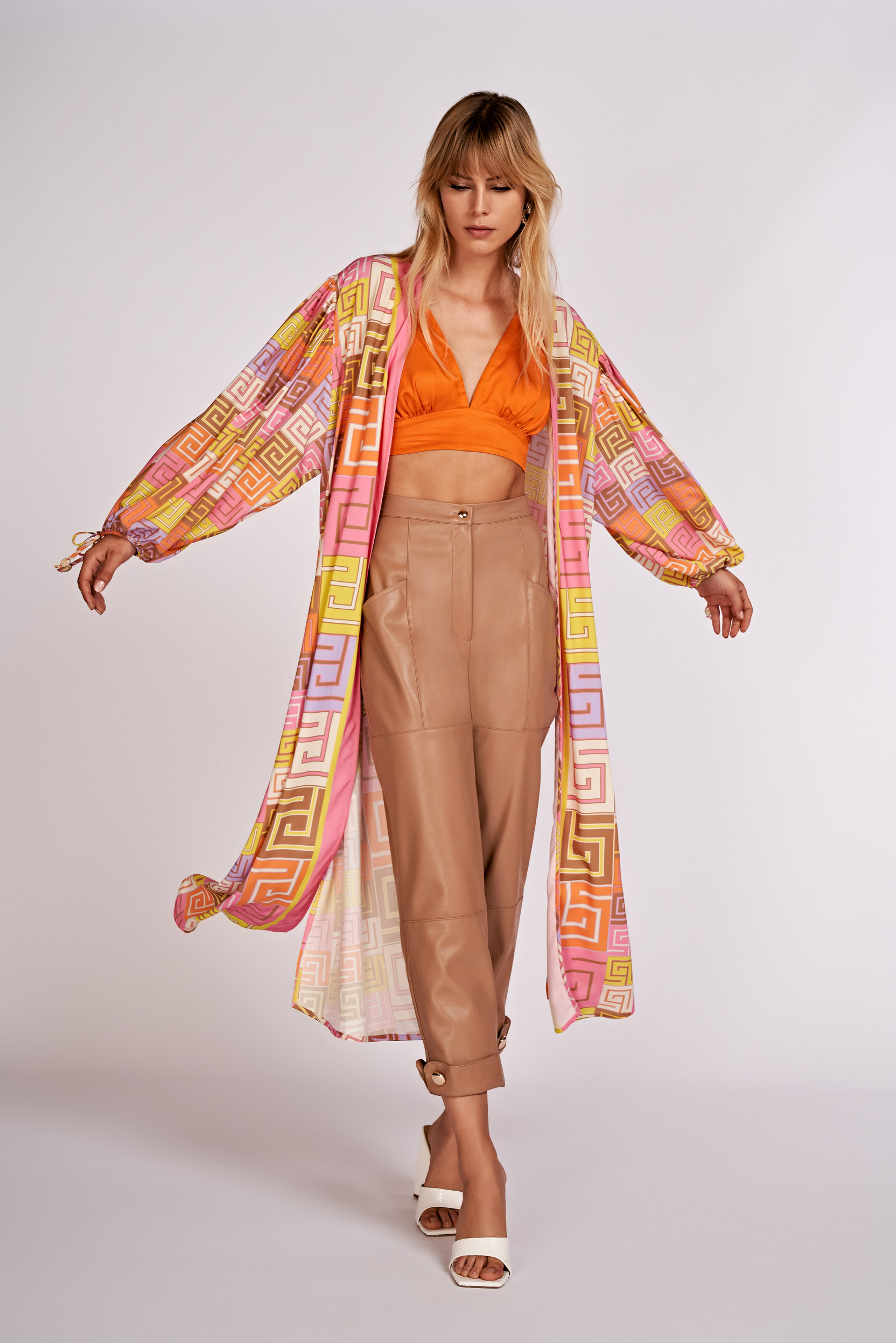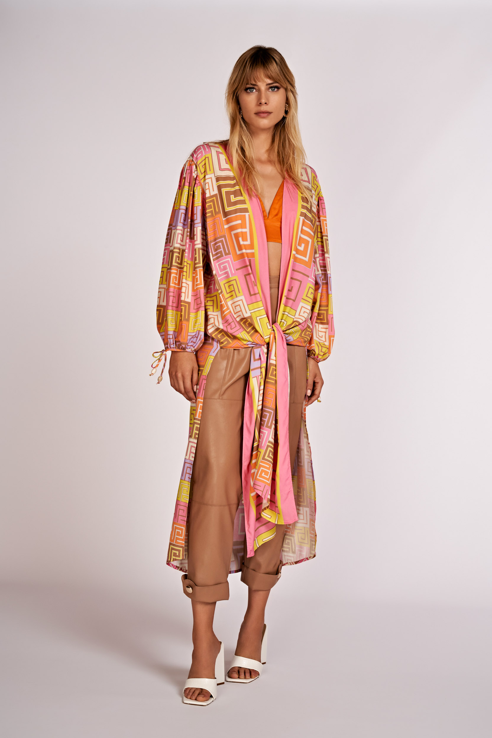 Kaftan comprido de mangas compridas com o término efeito balão e atilhos com borlas. Duas pequenas aberturas nas abas laterais.