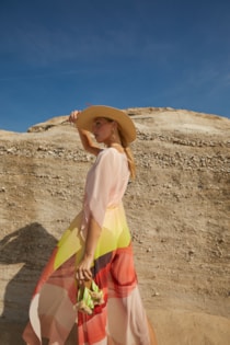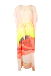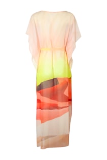 Cafetã com decote redondo e manga curta. Aberturas laterais.