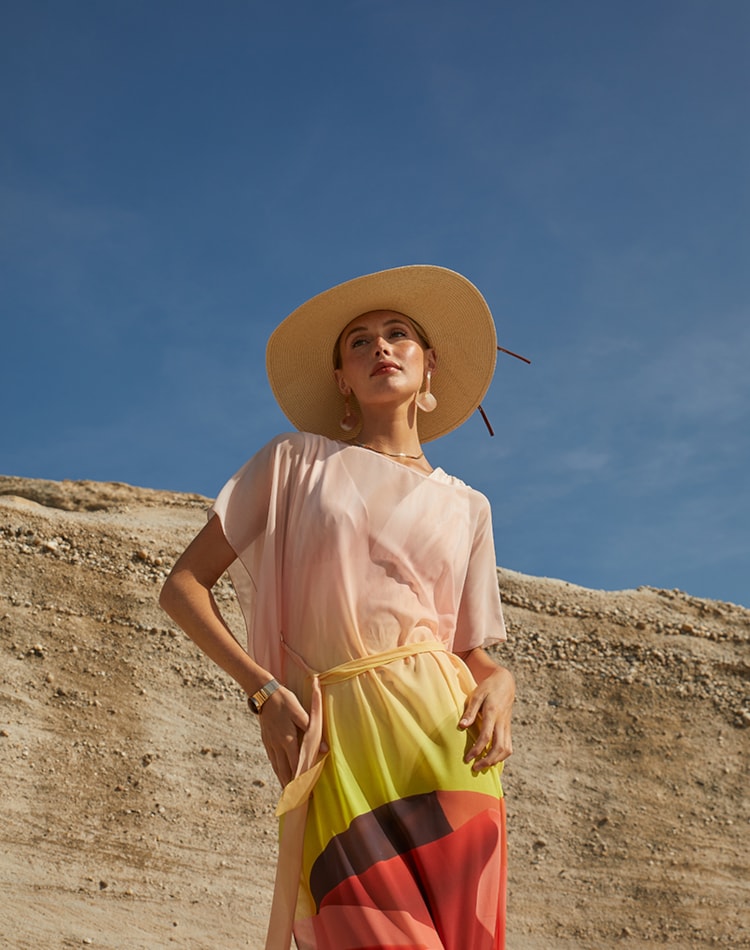 Cafetã com decote redondo e manga curta. Aberturas laterais.