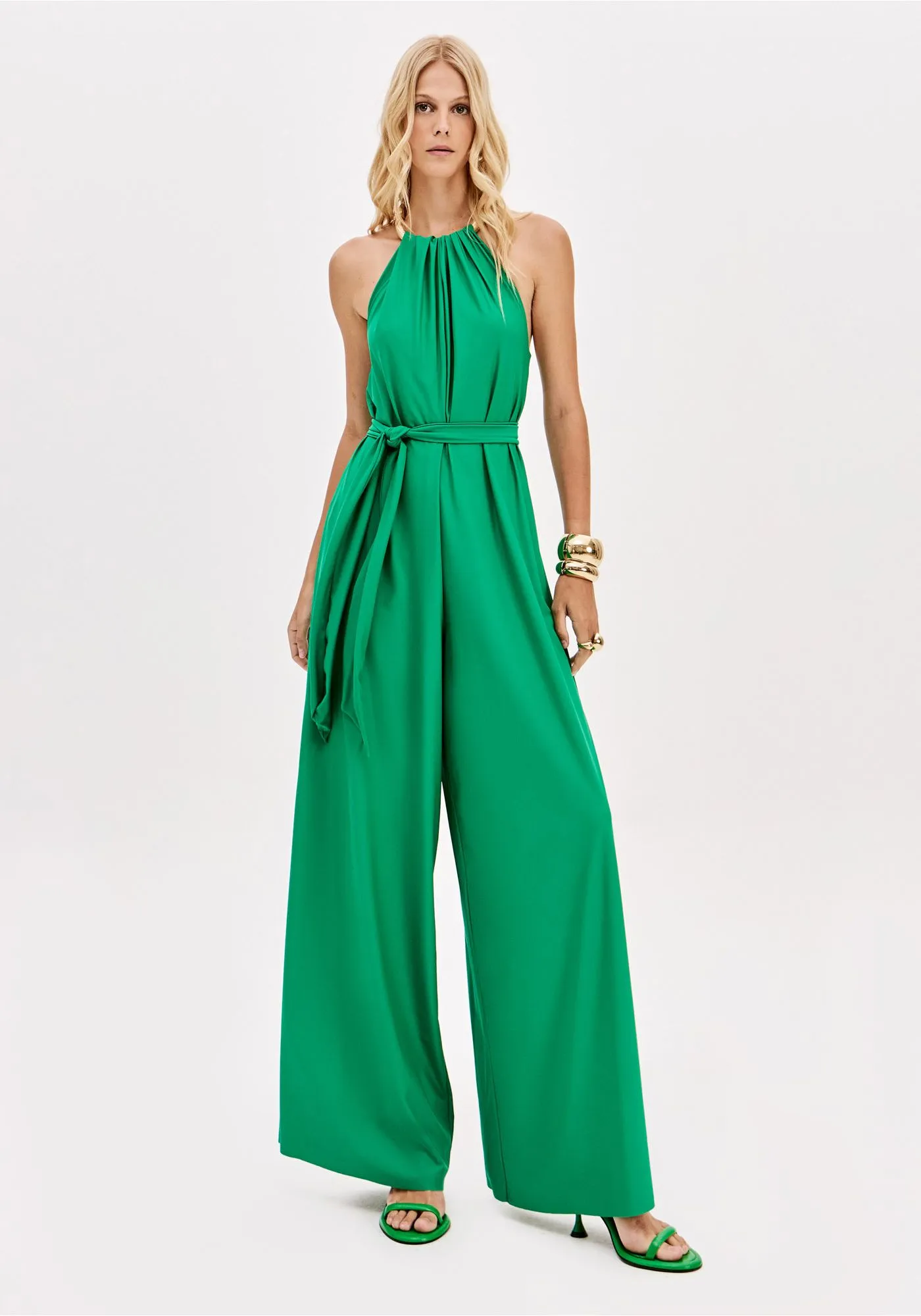 Prático e sofisticado, o macacão longo confeccionado em malha leve traz faixa para ajuste e modelagem frente única com colar de metal. As pernas amplas estilo pantalona reforçam a fluidez do look. Escolha certa para eventos e ocasiões especiais!