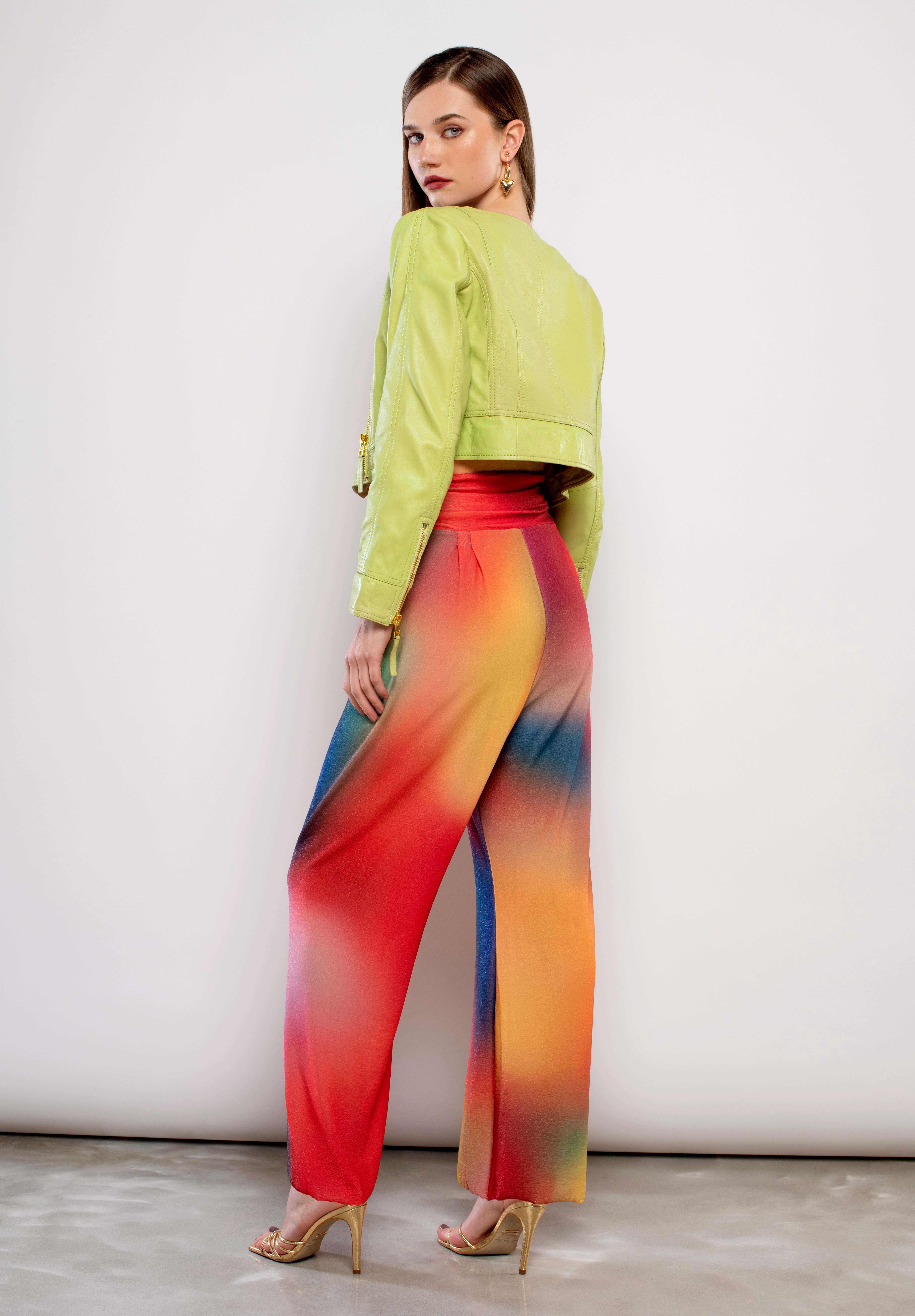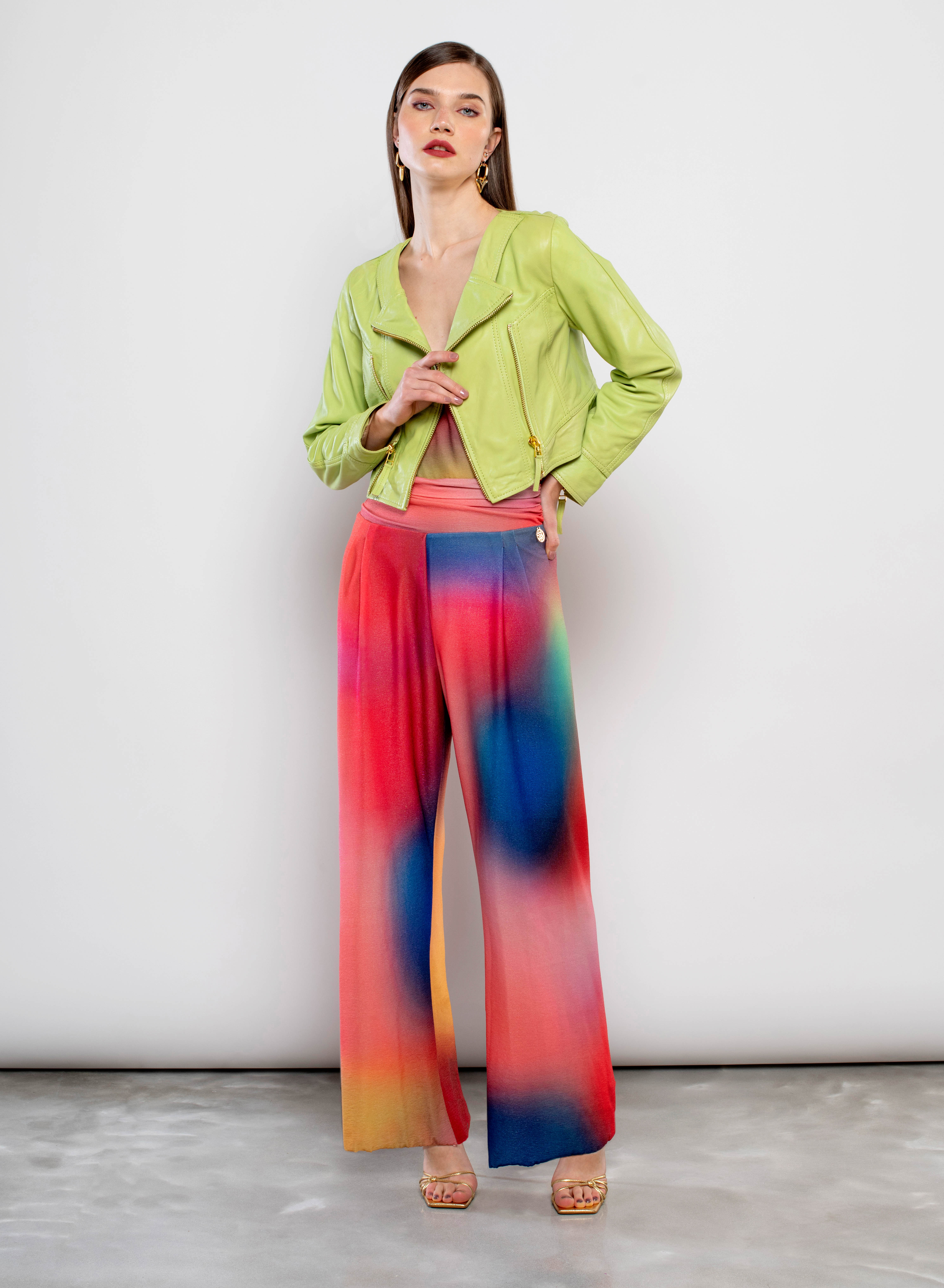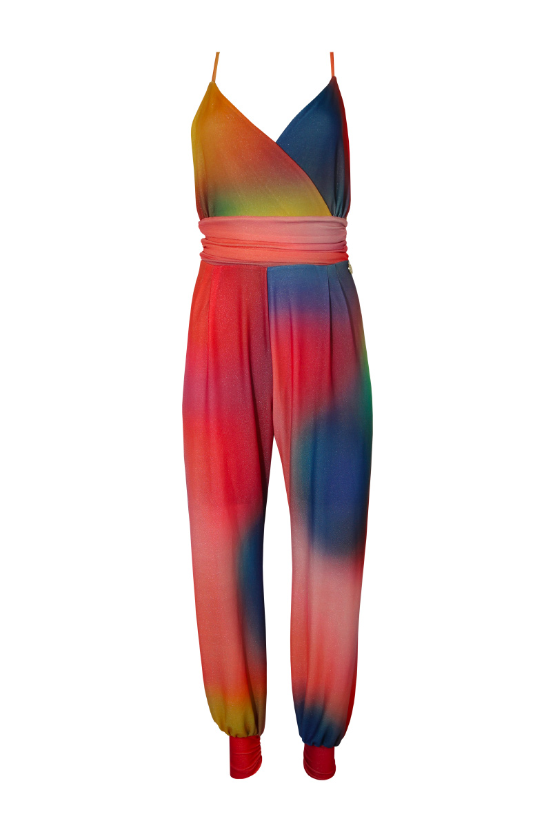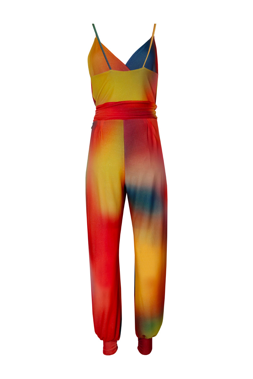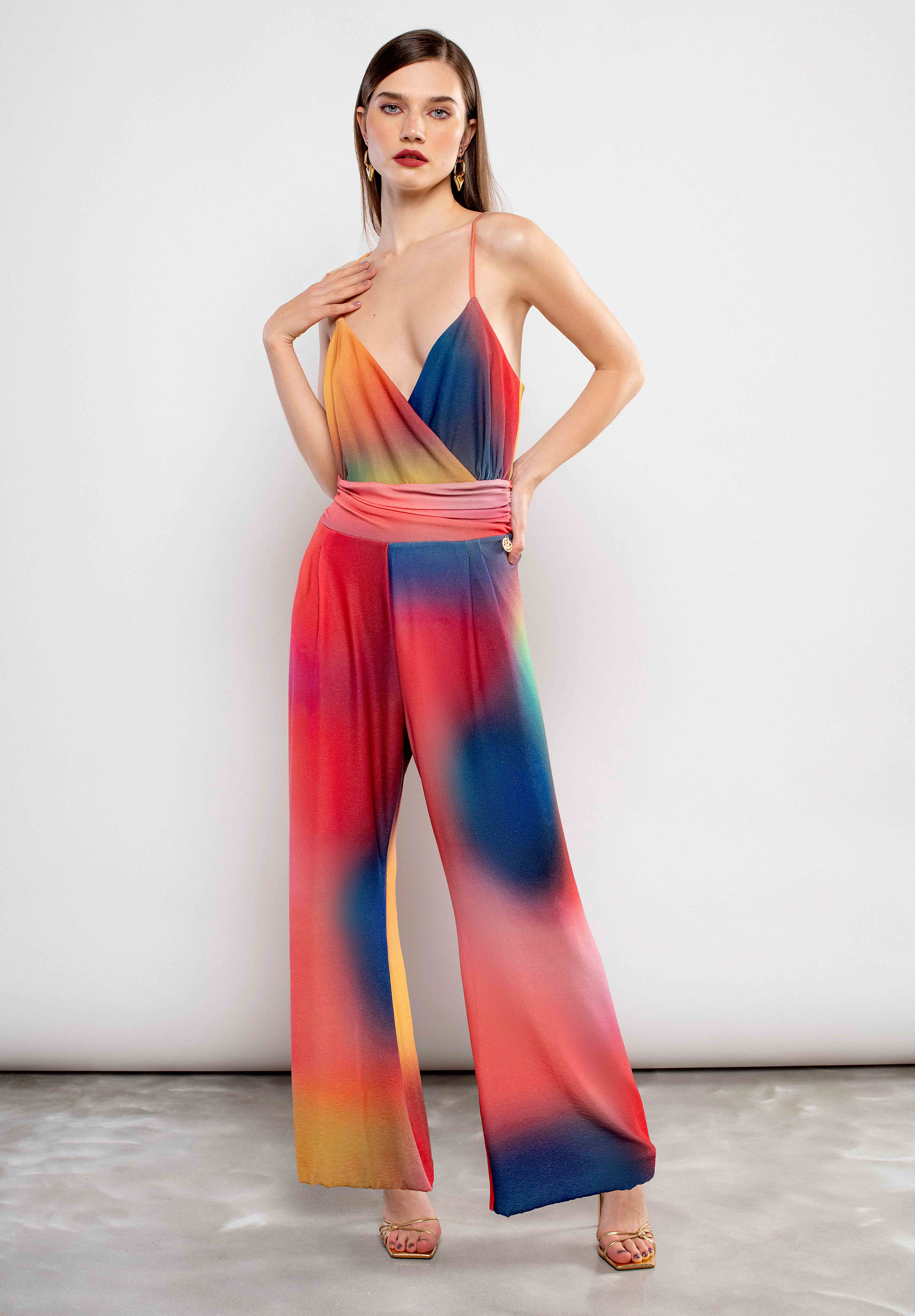 Macacão comprido de malha estampada multicolor.Efeito cintado.Decote em bico cruzado e alças finas.