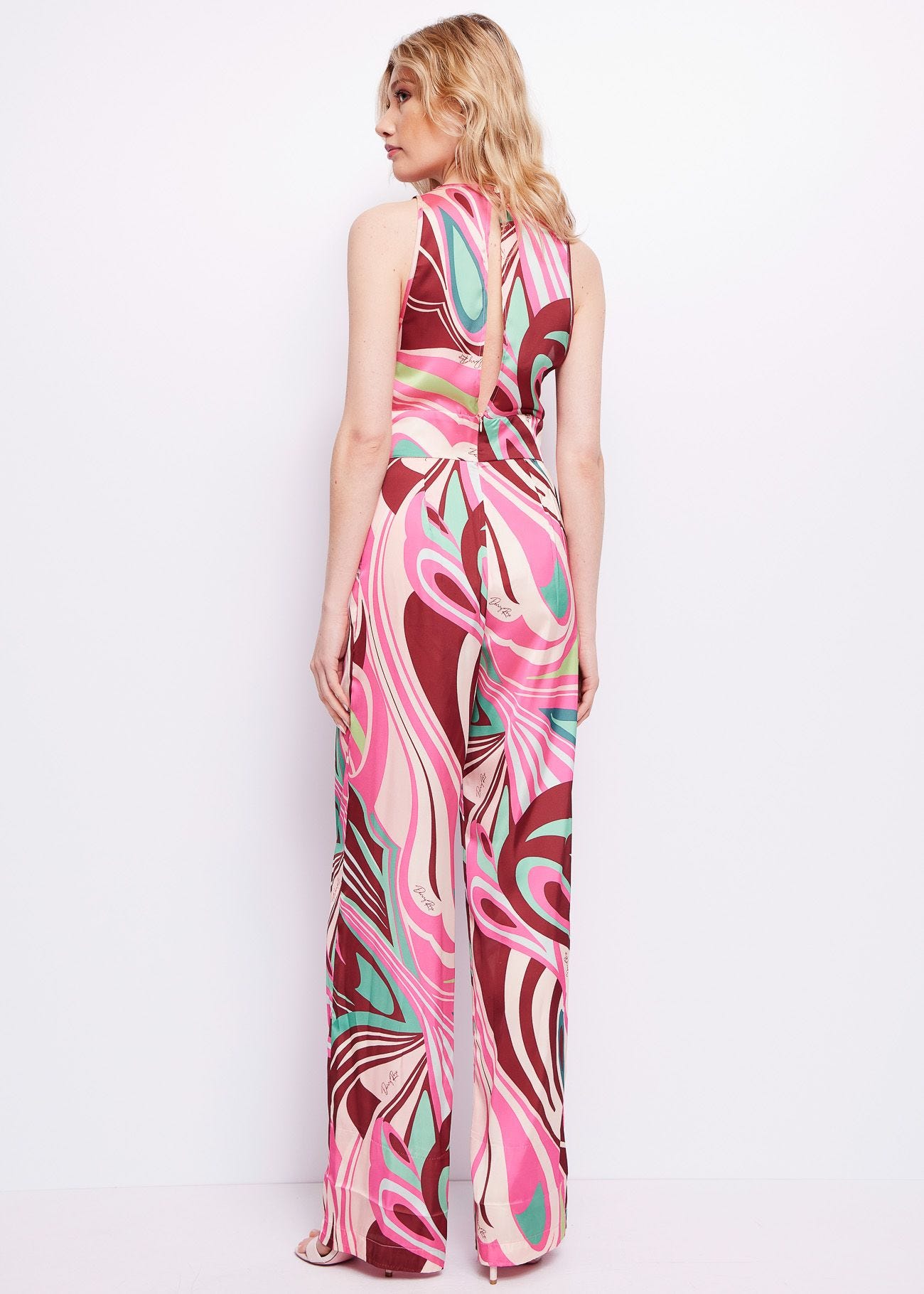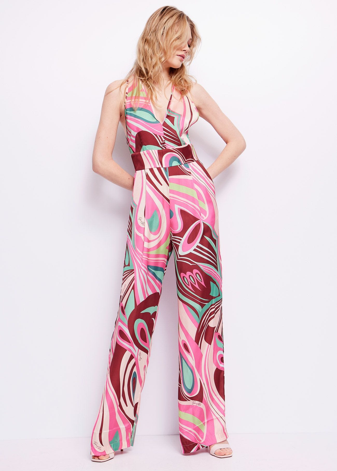 Macacão em tecido fluido com estampa all over multicolorida e decote em V.