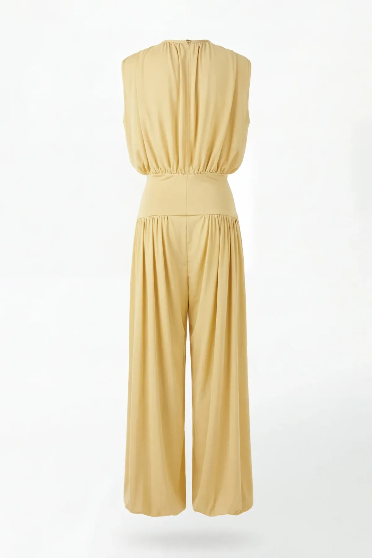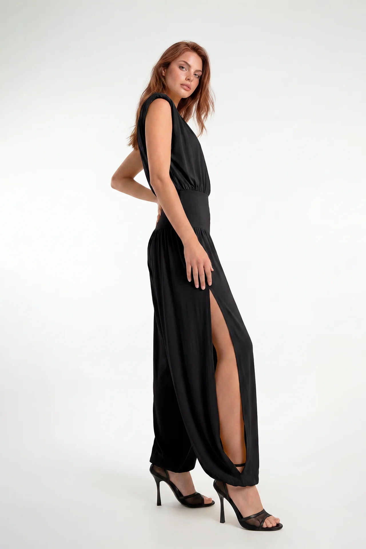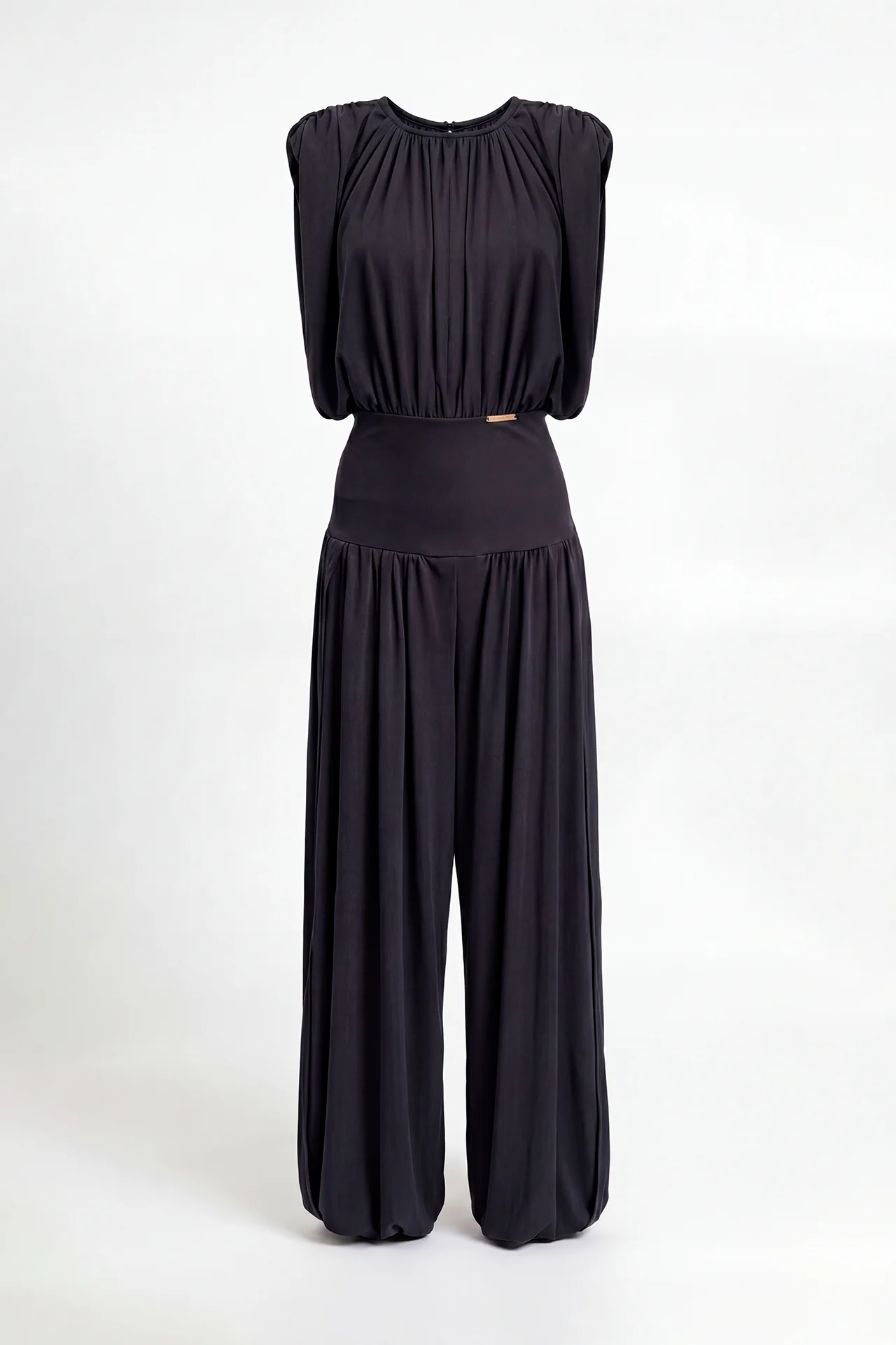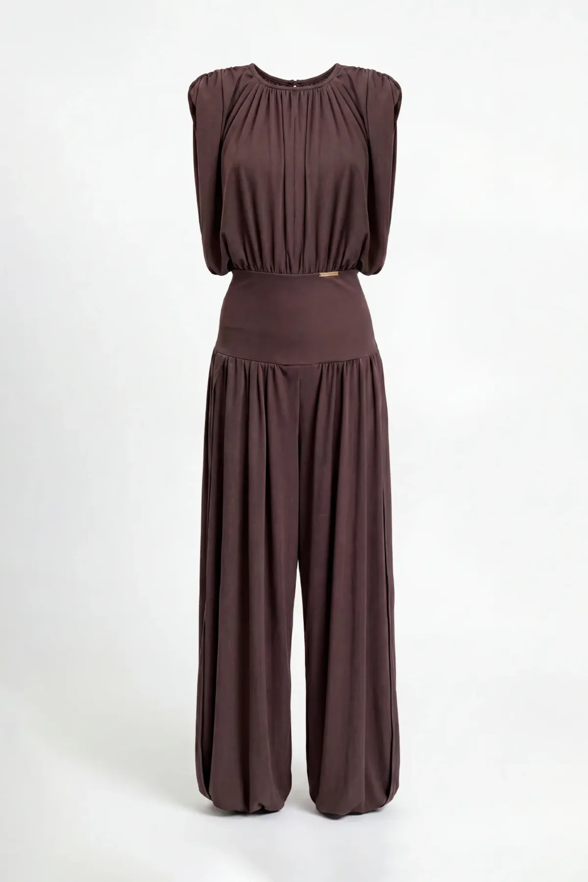 Macacão fluido que se destaca pelo drapeado suave na parte superior que cria volume e movimento, e pelo recorte estratégico na perna. O corte amplo das pernas reforça a leveza da peça, enquanto o acabamento minimalista confere um toque sofisticado.