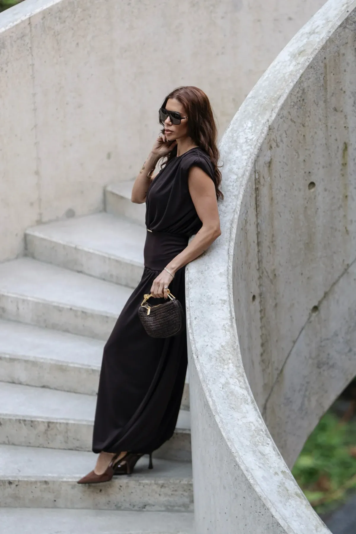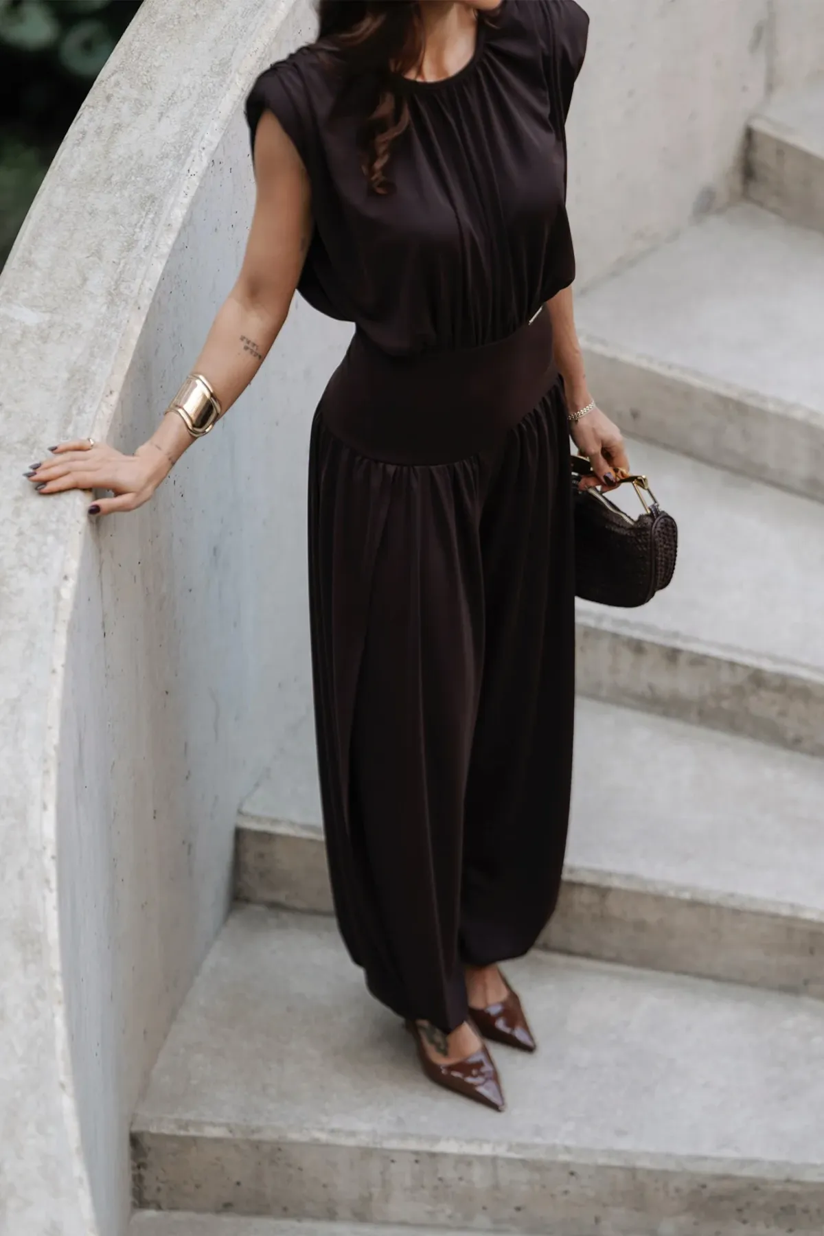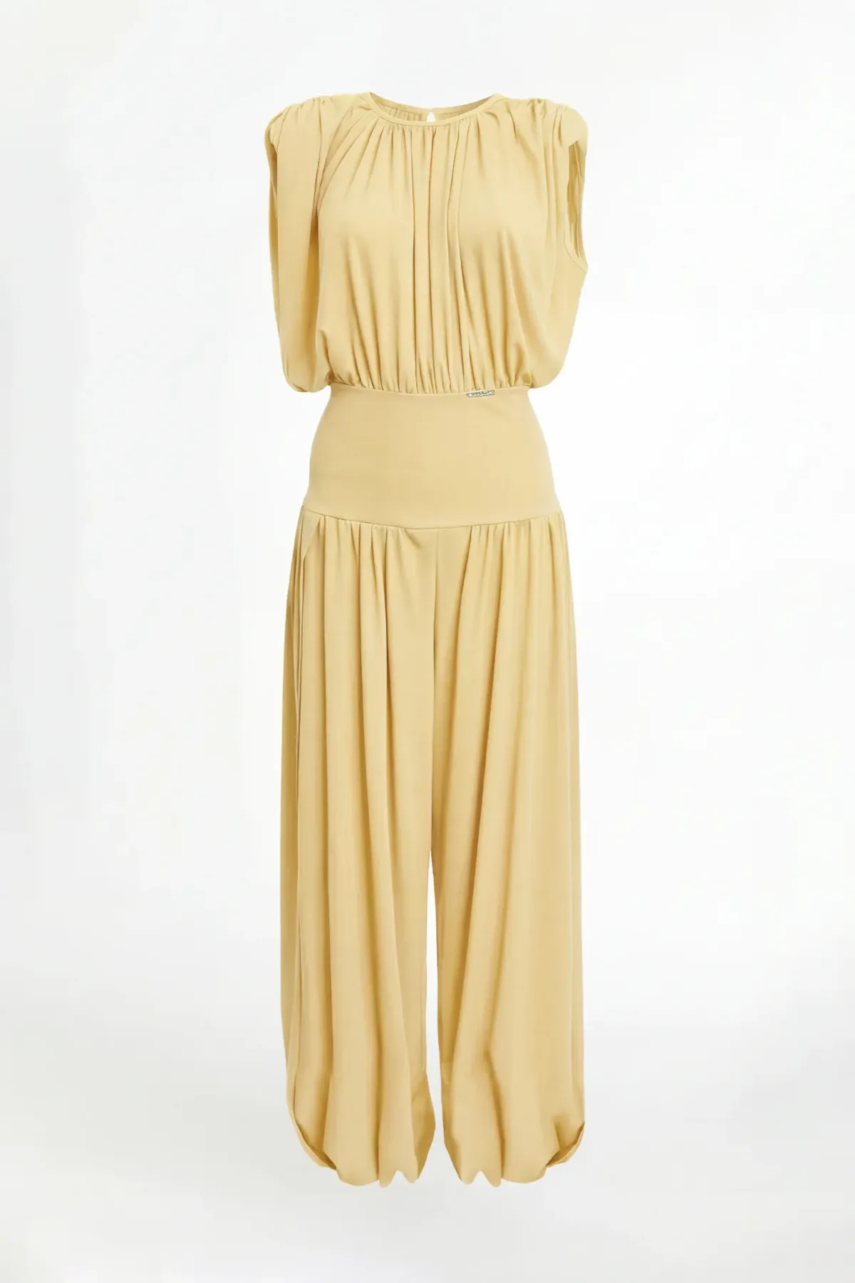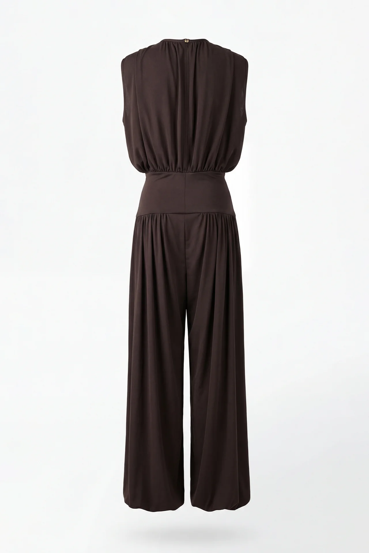 Macacão fluido que se destaca pelo drapeado suave na parte superior que cria volume e movimento, e pelo recorte estratégico na perna. O corte amplo das pernas reforça a leveza da peça, enquanto o acabamento minimalista confere um toque sofisticado.