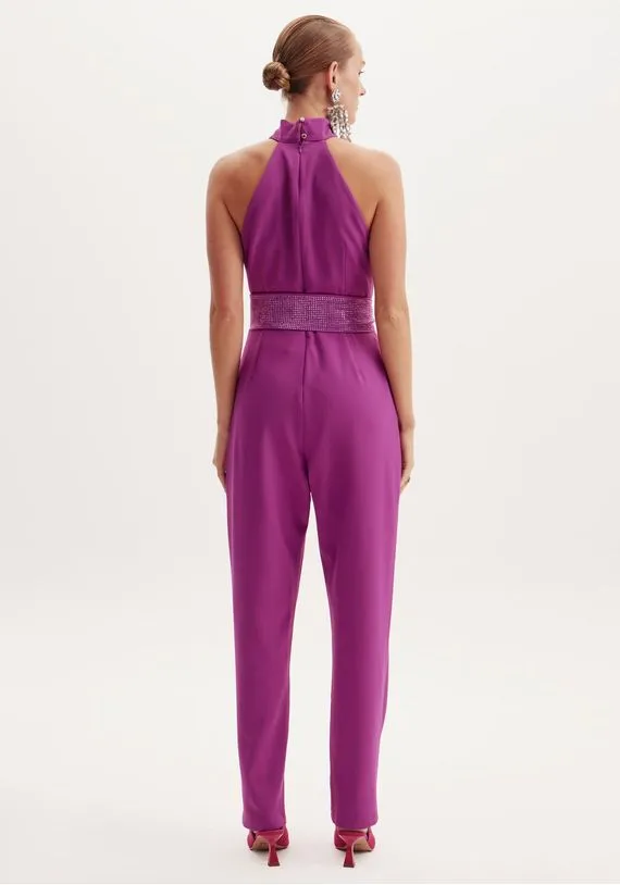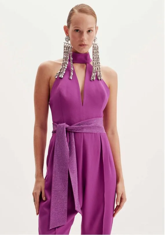 macacão longo sem mangas possui gola alta, recorte frontal e decote v. O shape estruturado garante conforto e elegância. Acompanha faixa para amarração com aplicações brilhantes que acinturam e desenham ainda mais a silhueta. Aposte!