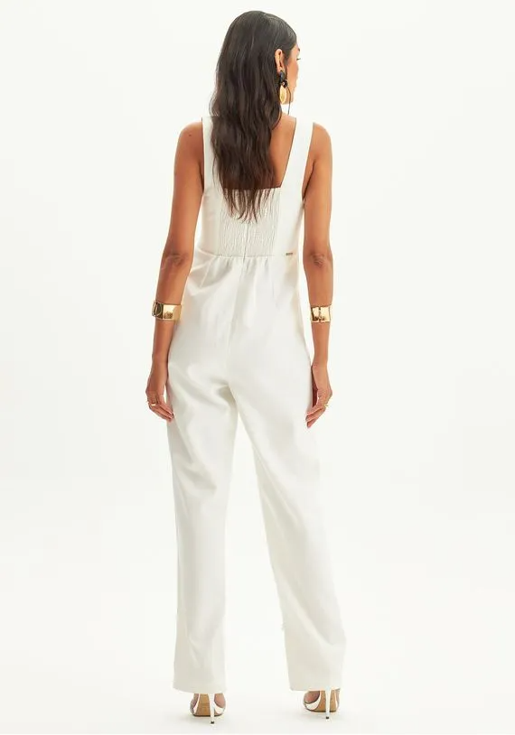 Essa peça é a definição de casual-chic! O macacão longo de alças possui recorte frontal, decote reto e aplicações com cristais que proporciona o glow na peça. As fendas na barra conferem ainda mais elegância. Aposte