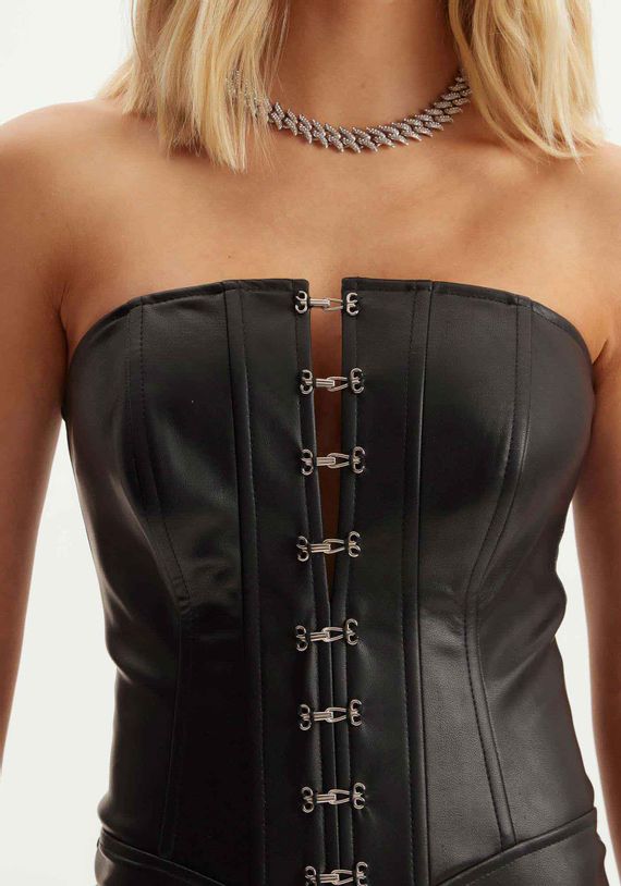 MACACÃO LONGO É CONFECCIONADA EM PU, DESTACANDO A ESTÉTICA CORSET. OS RECORTES NO TECIDO E O DETALHE EM COLCHETES NO BUSTO DESTACAM AINDA MAIS AS PRODUÇÕES. O DECOTE TOMARA QUE CAIA E O SHAPE AJUSTÁVEL AO CORPO SÃO OUTROS DESTAQUES. APOSTE NO ALL BLACK.