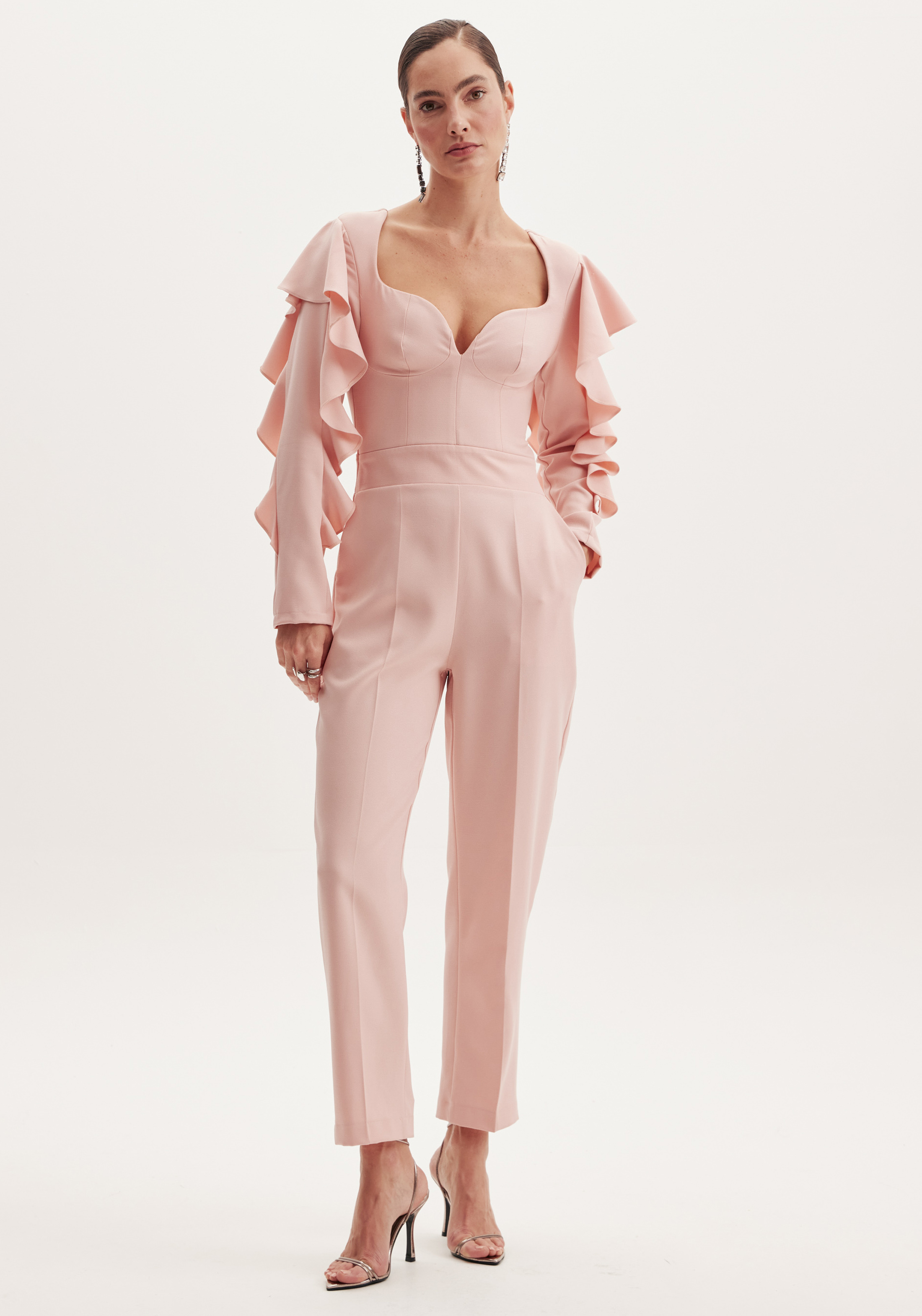 Macacão cor única com folhos