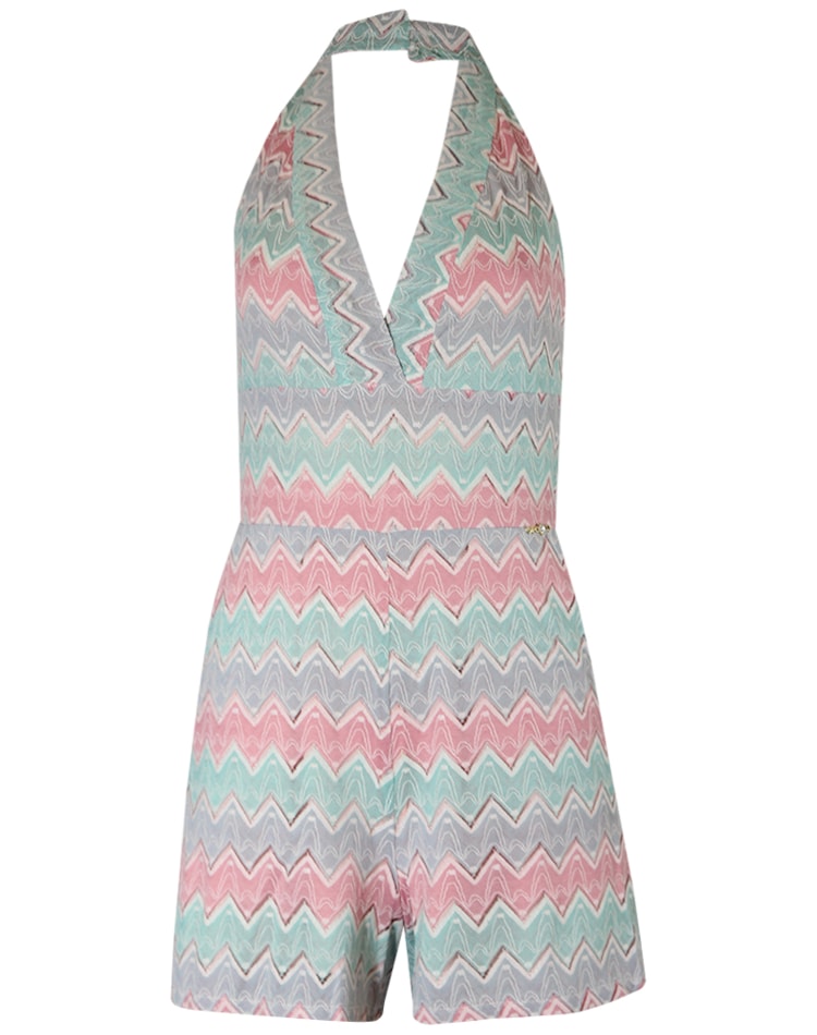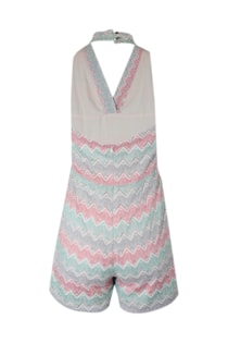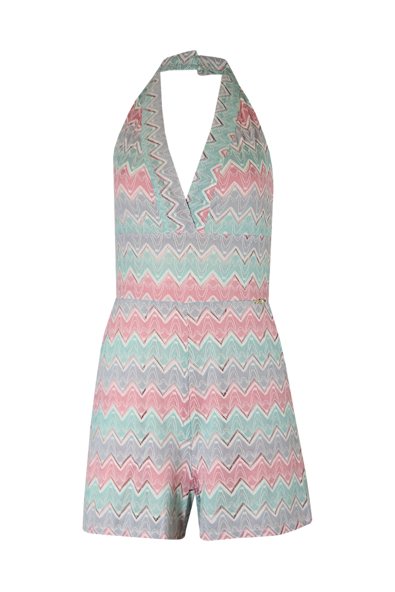 Jumpsuit curto confecionado em tecido jacquard. Bolsos laterais. Costas abertas. Fecho atrás com botão e fecho de correr. Com forro.