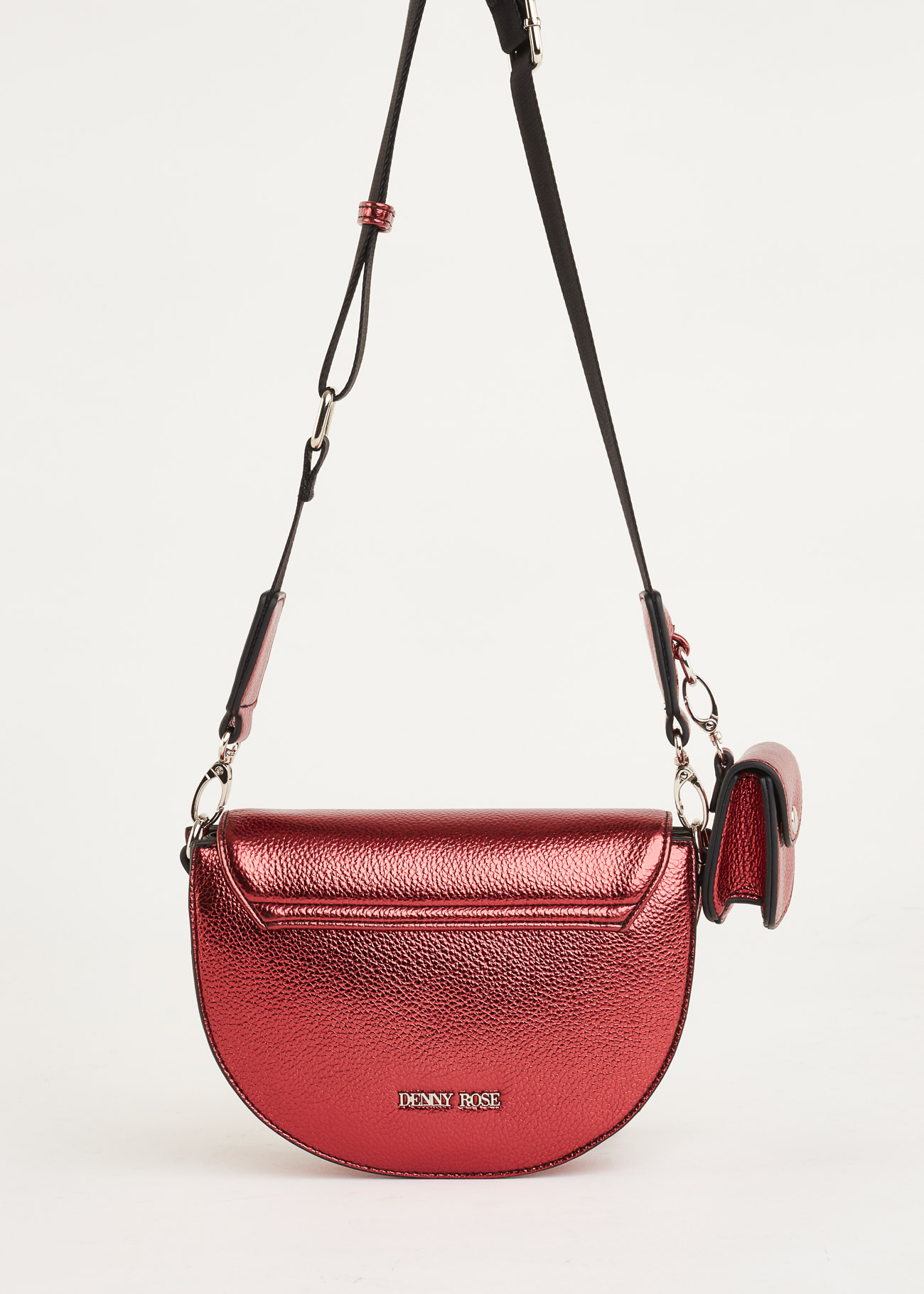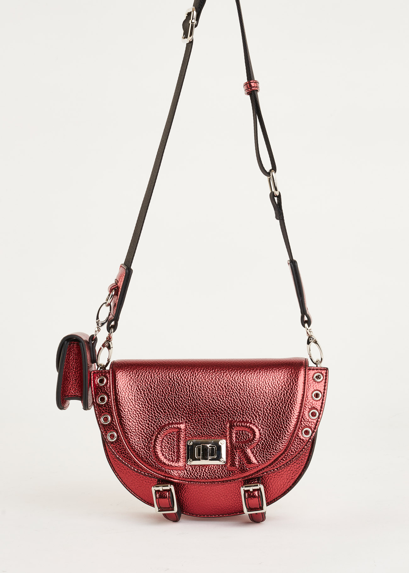 Crossbody bag in laminated faux leather decorated with embossed DR pattern. Flap and metal turn lock closure. The adjustable and removable shoulder strap is equipped with a mini coin purse.