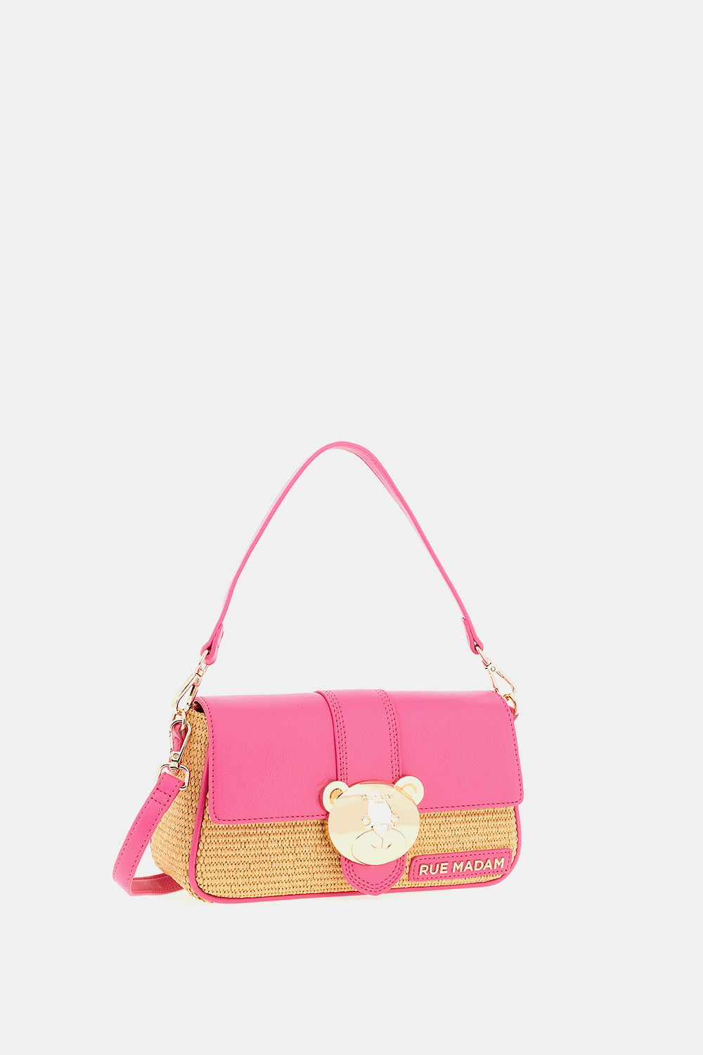 Bolsa de ombro em couro ecológico e palha com fecho de ursinho de pelúcia. Alça de mão e alça de ombro removíveis e forro interno de algodão com bolso. C 25 L 7,5 A 14,5