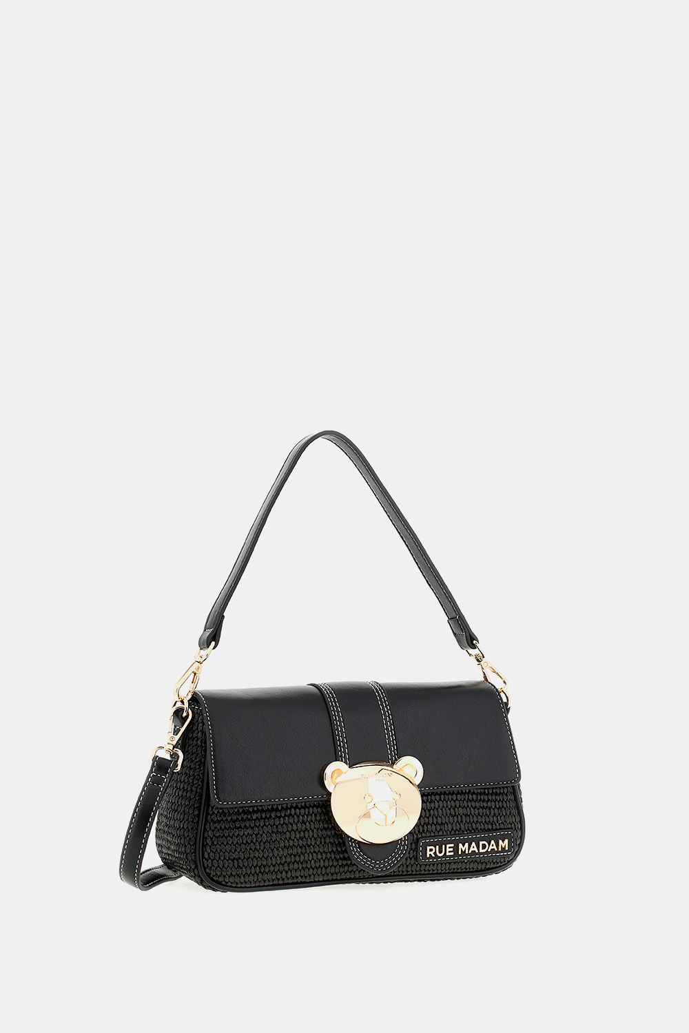 Bolsa de ombro em couro ecológico e palha com fecho de ursinho de pelúcia. Alça de mão e alça de ombro removíveis e forro interno de algodão com bolso. C 25 L 7,5 A 14,5