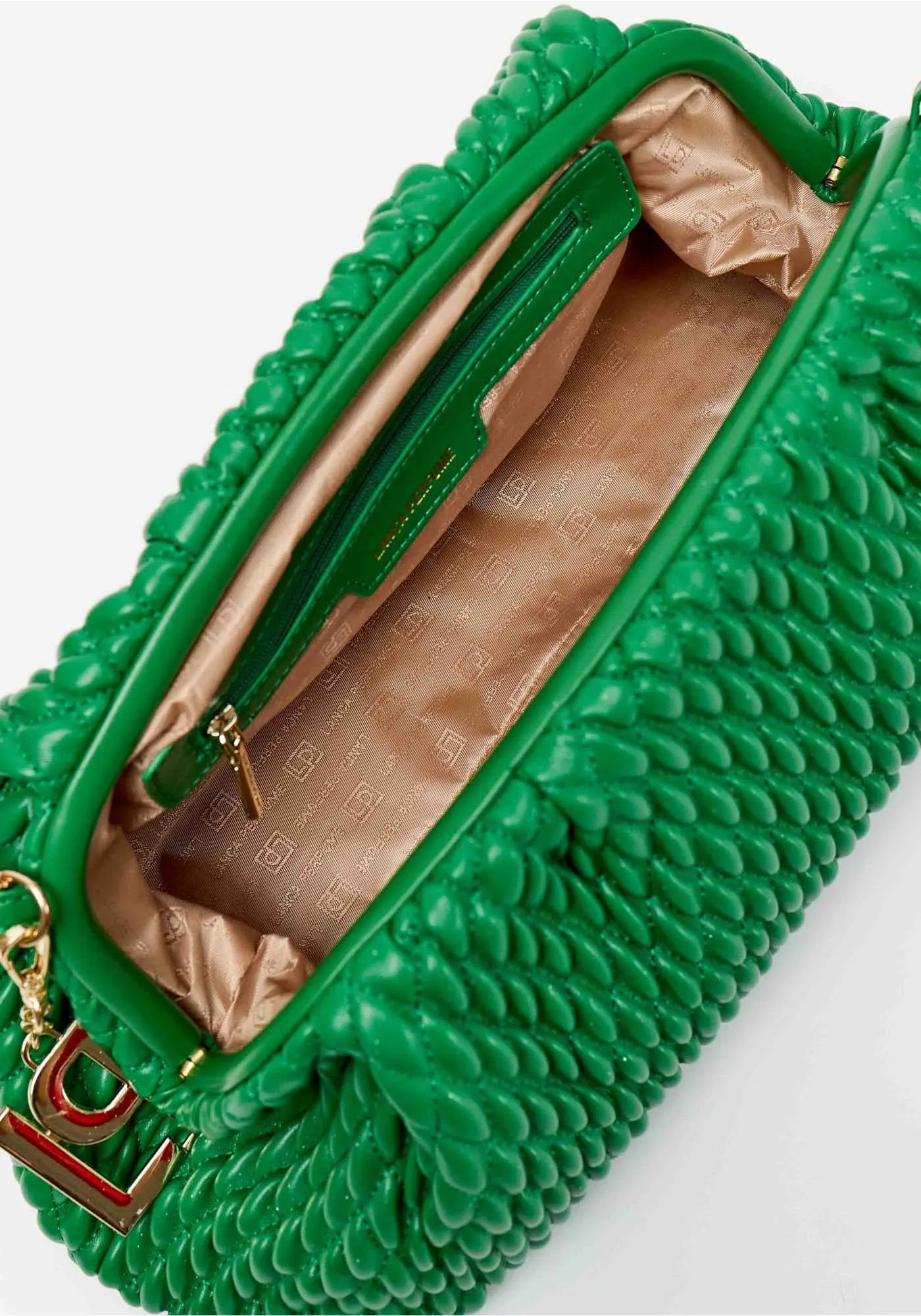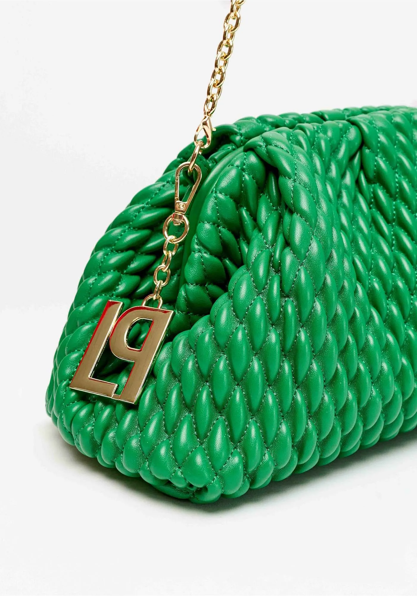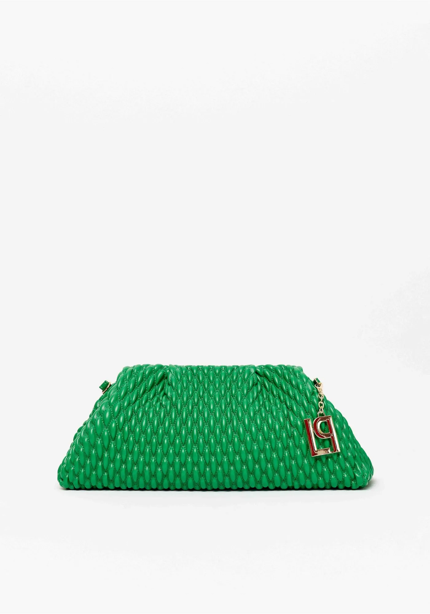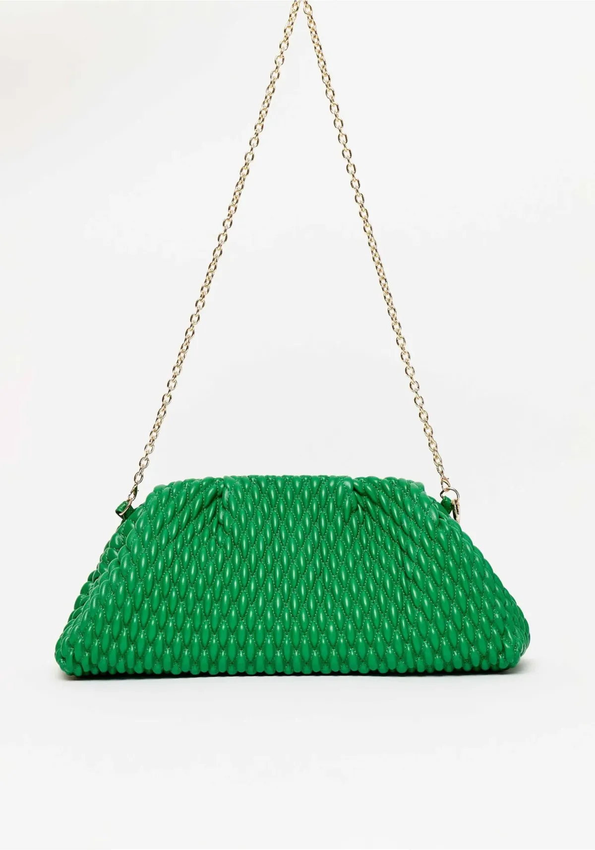 a bolsa clutch exibe matelassê texturizado com acabamento metalizado que destaca o visual com glamour. A corrente delicada permite uso no ombro, enquanto o interior com bolso organiza com praticidade. Ideal para eventos e ocasiões especiais!
