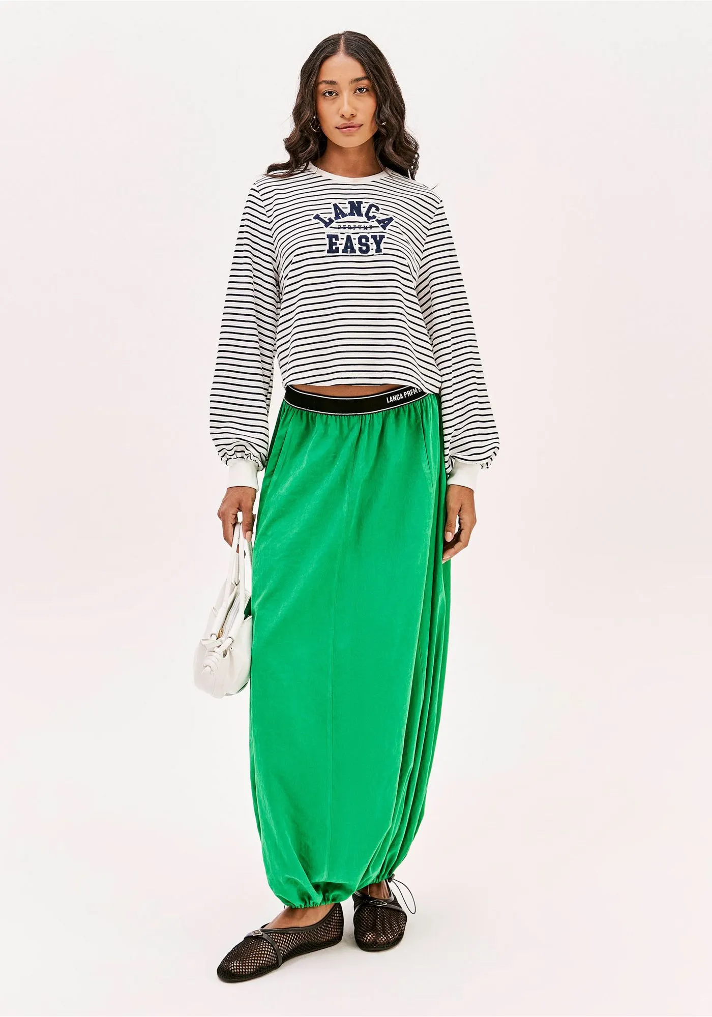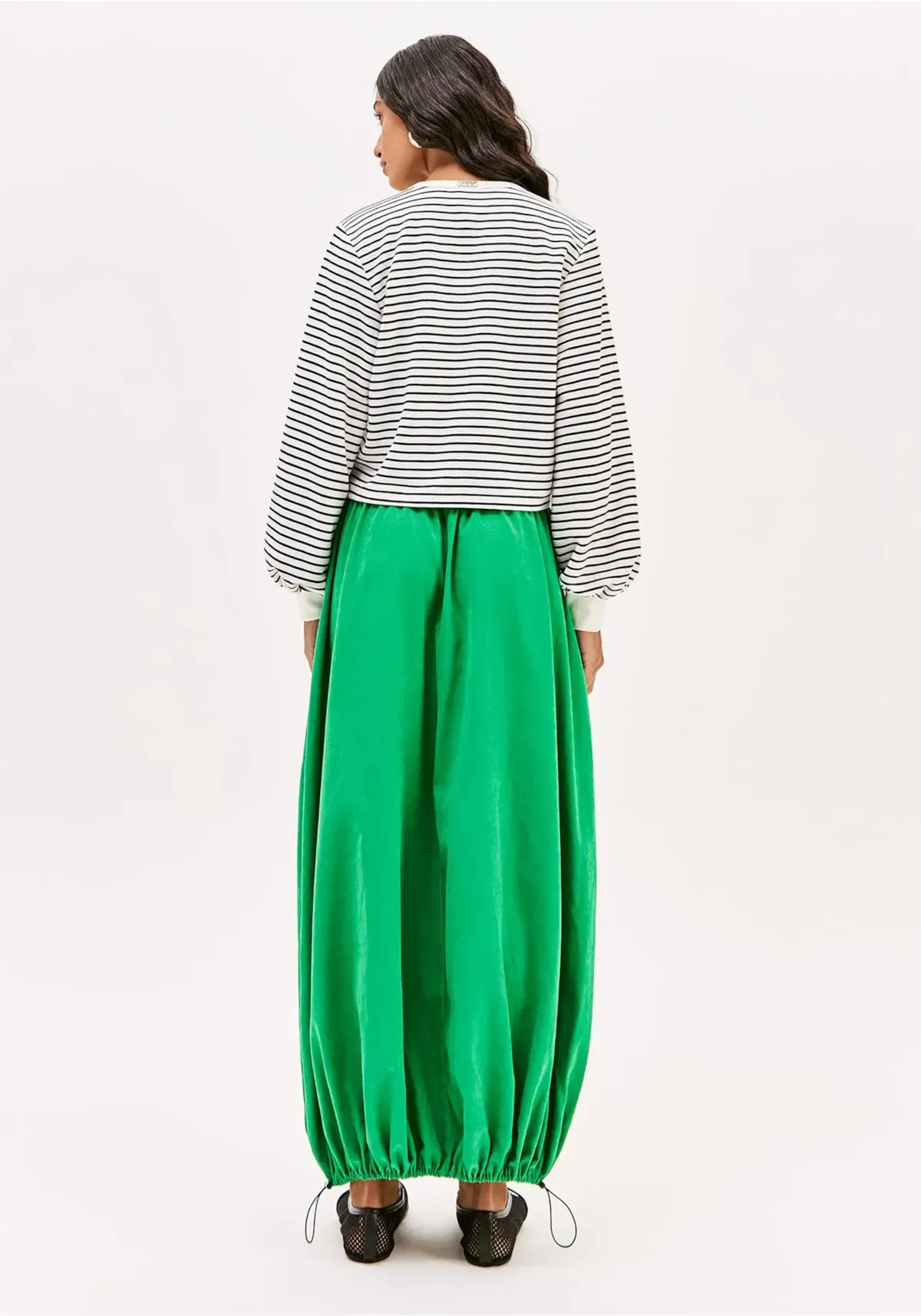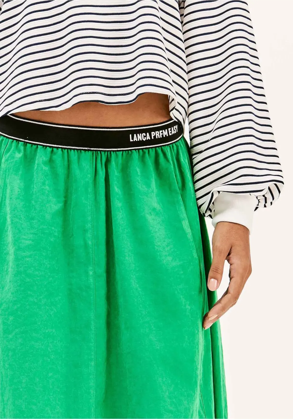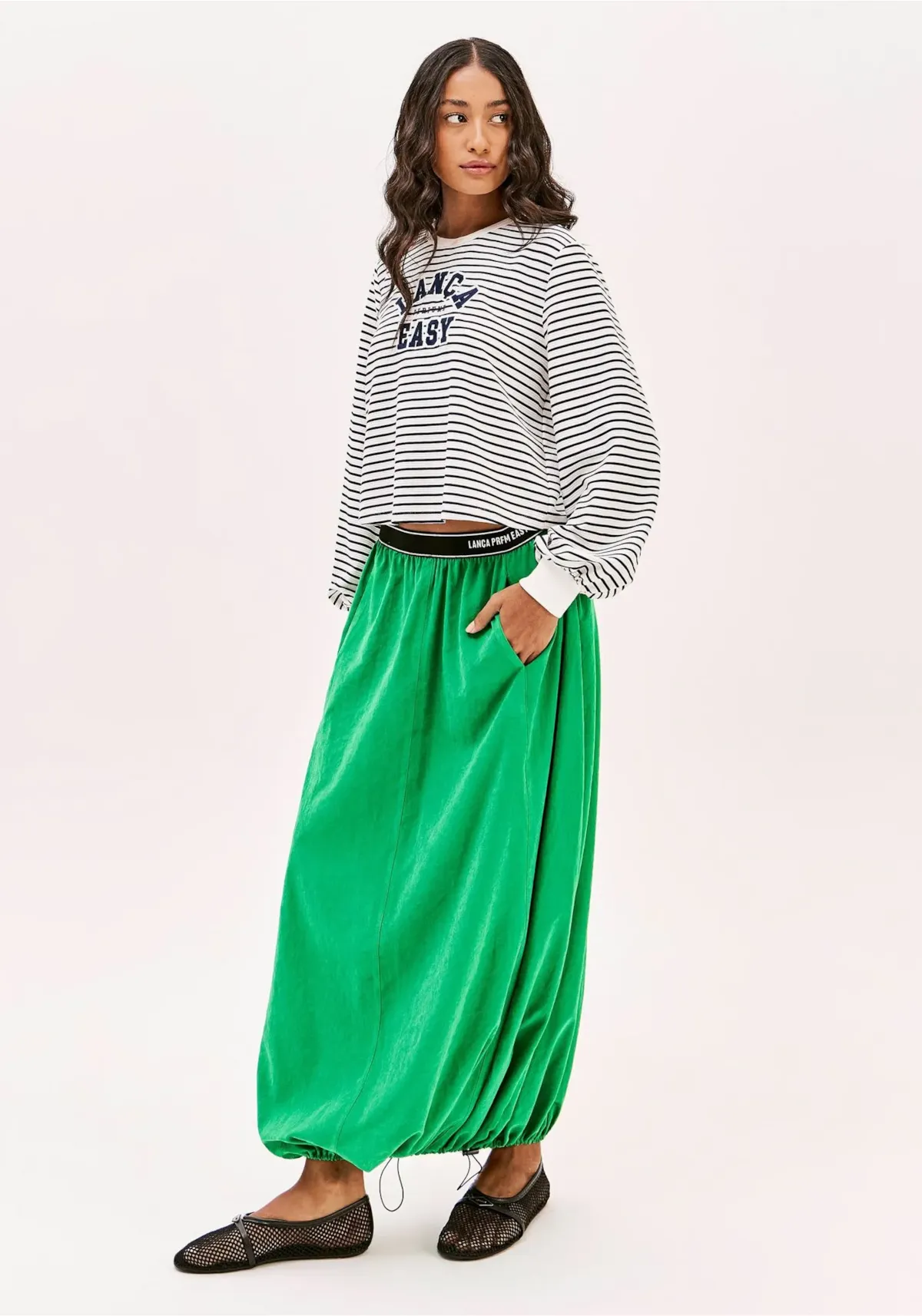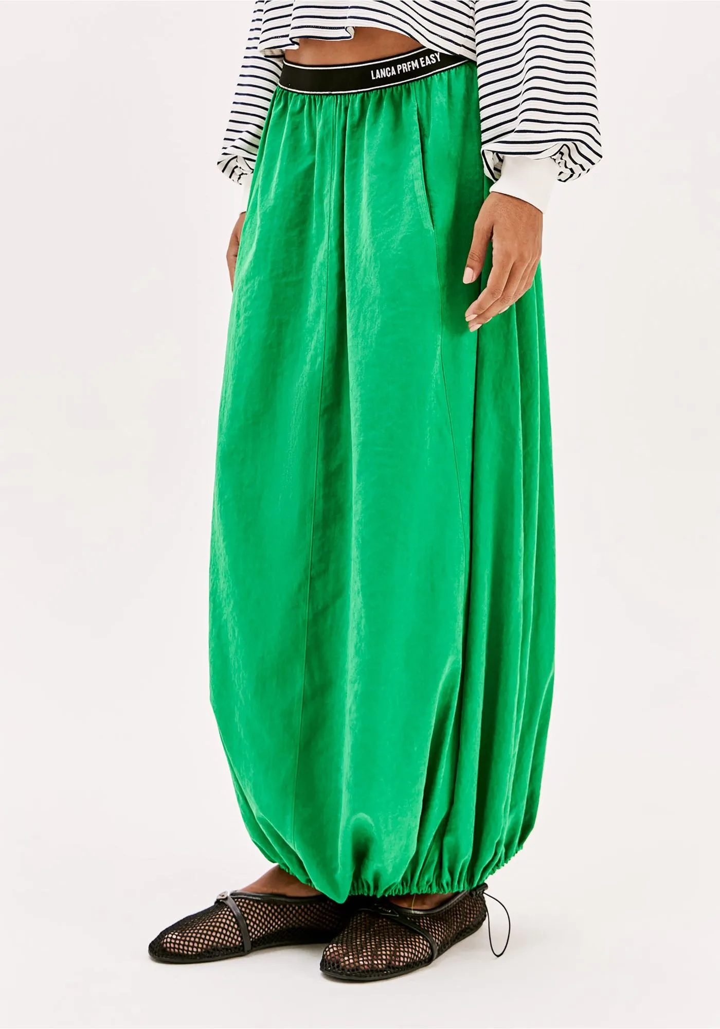 a saia super midi ganha destaque com o volume da modelagem balonê e acabamento franzido na barra. O cós elástico com assinatura adiciona um toque esportivo e moderno. Perfeita para ousar com autenticidade!