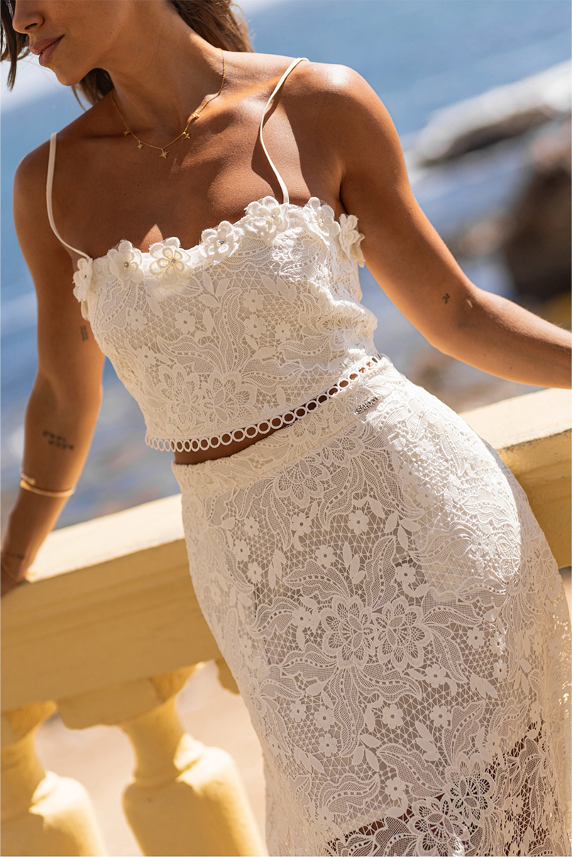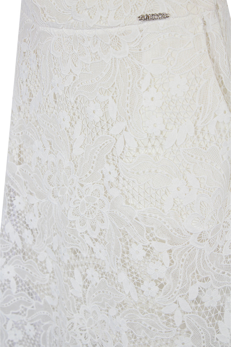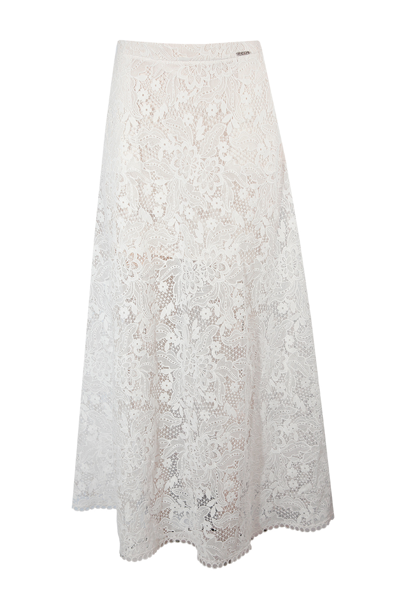 Saia comprida de renda com cós. Corte trapézio. Forro interior combinado no tom. Bolsos laterais. Fecho lateral com fecho de correr invísivel. Total look