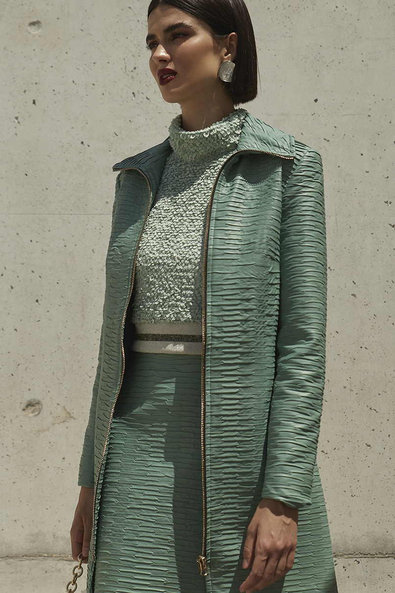 Corte direito e justo. Fecho atrás com fecho de correr invisível.
