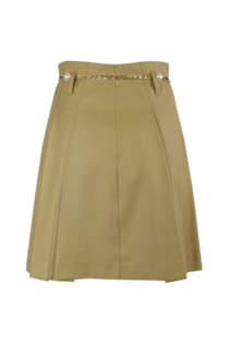Minissaia de cintura média com presilhas. Pormenor de bainha plissada. Fecho de correr e botão metálico à frente