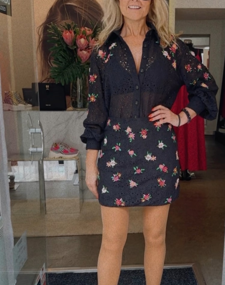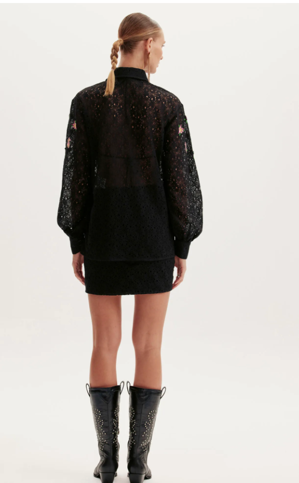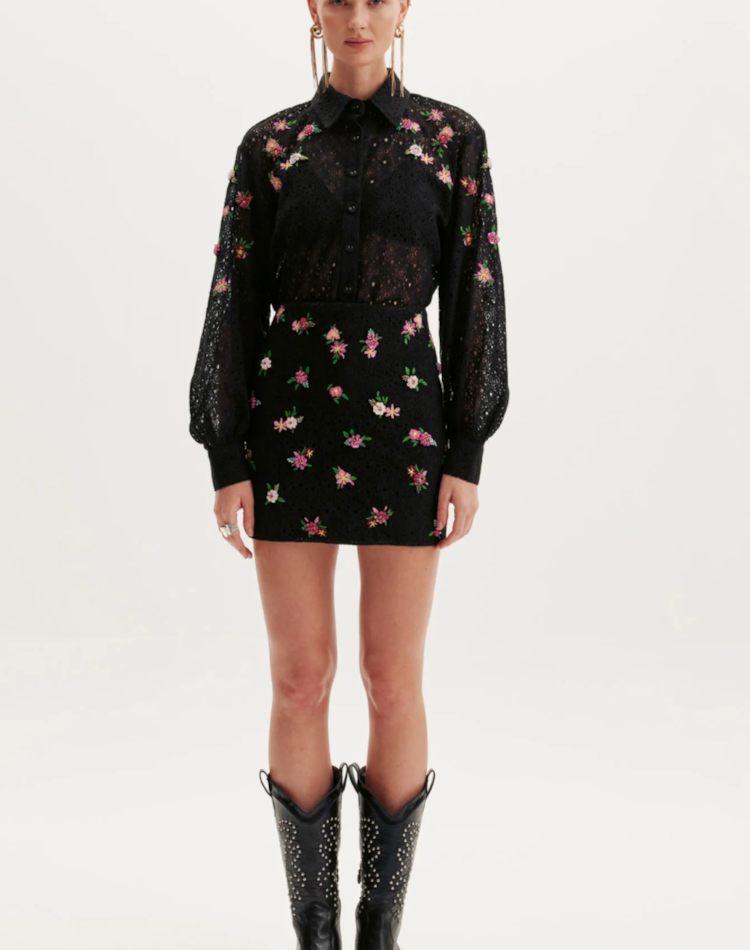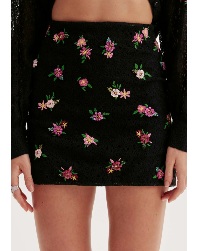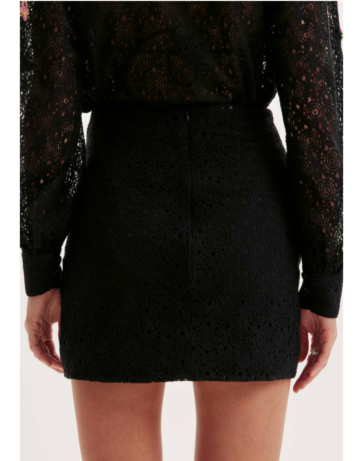 saia curta rendada possui fechamento posterior por zíper e modelagem ajustada que valoriza a silhueta. os delicados bordados florais reforçam o charme e romantismo da renda, valorizando as composições noturnas. Aposta certa para um visual único!