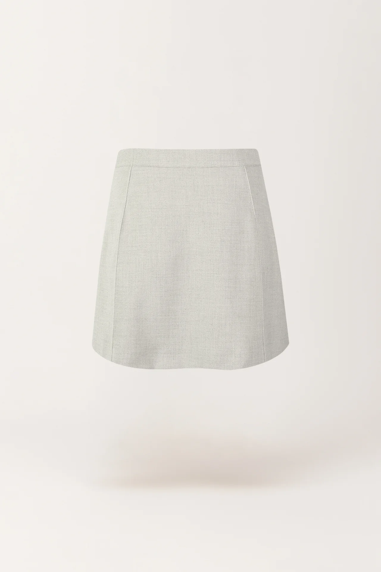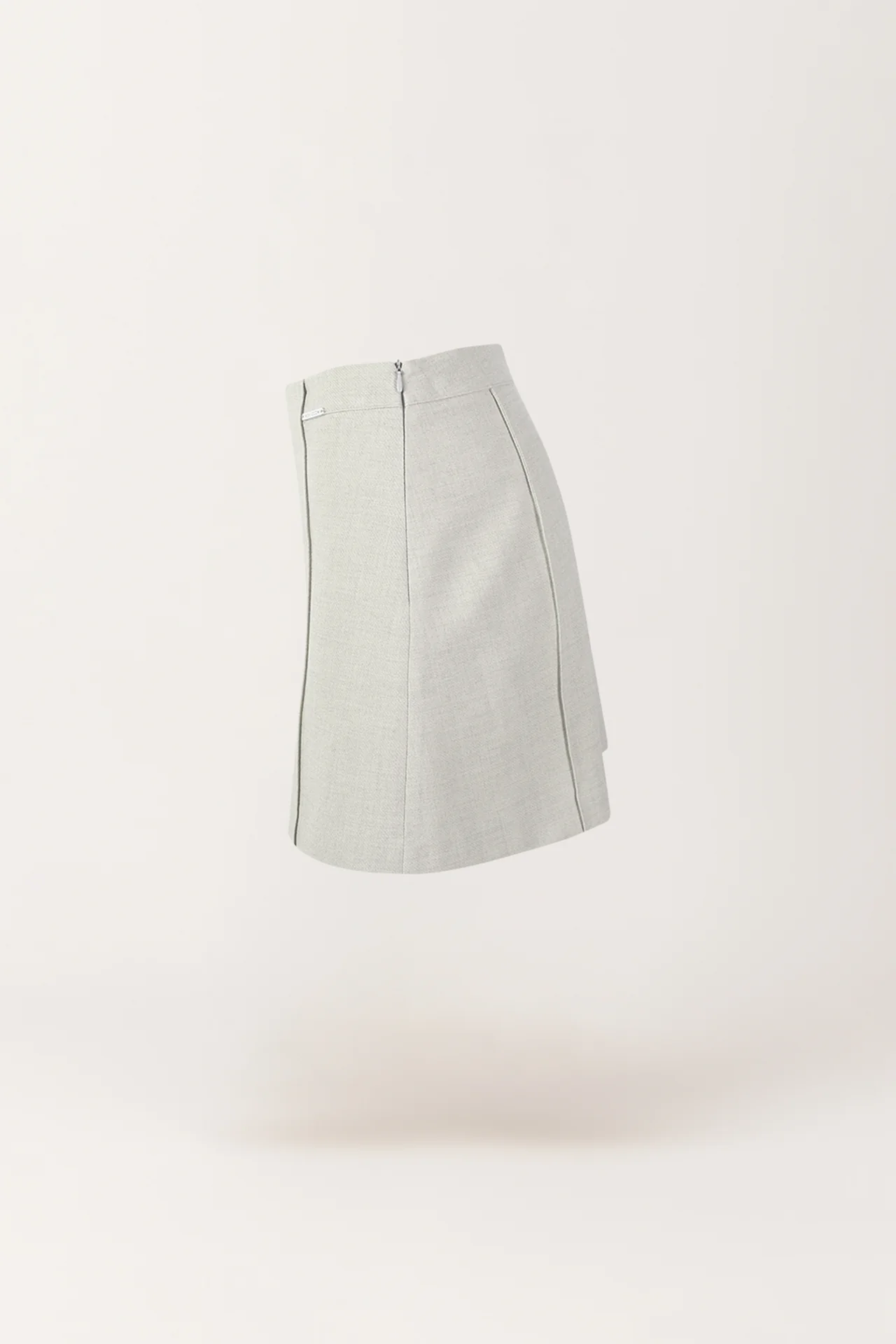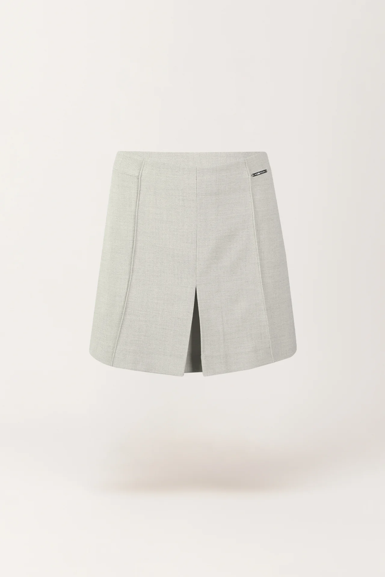 Saia-calção curta em tecido de alfaiataria com estrutura leve. Cintura média, abertura frontal e corte ligeiramente em A. O desenho limpo reforça a precisão da construção.