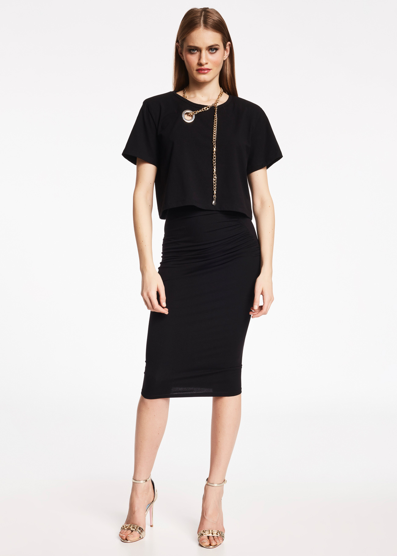 Saia midi em fleece leve de algodão stretch com letras atrás e motivo drapeado na frente. Com cós elástico.