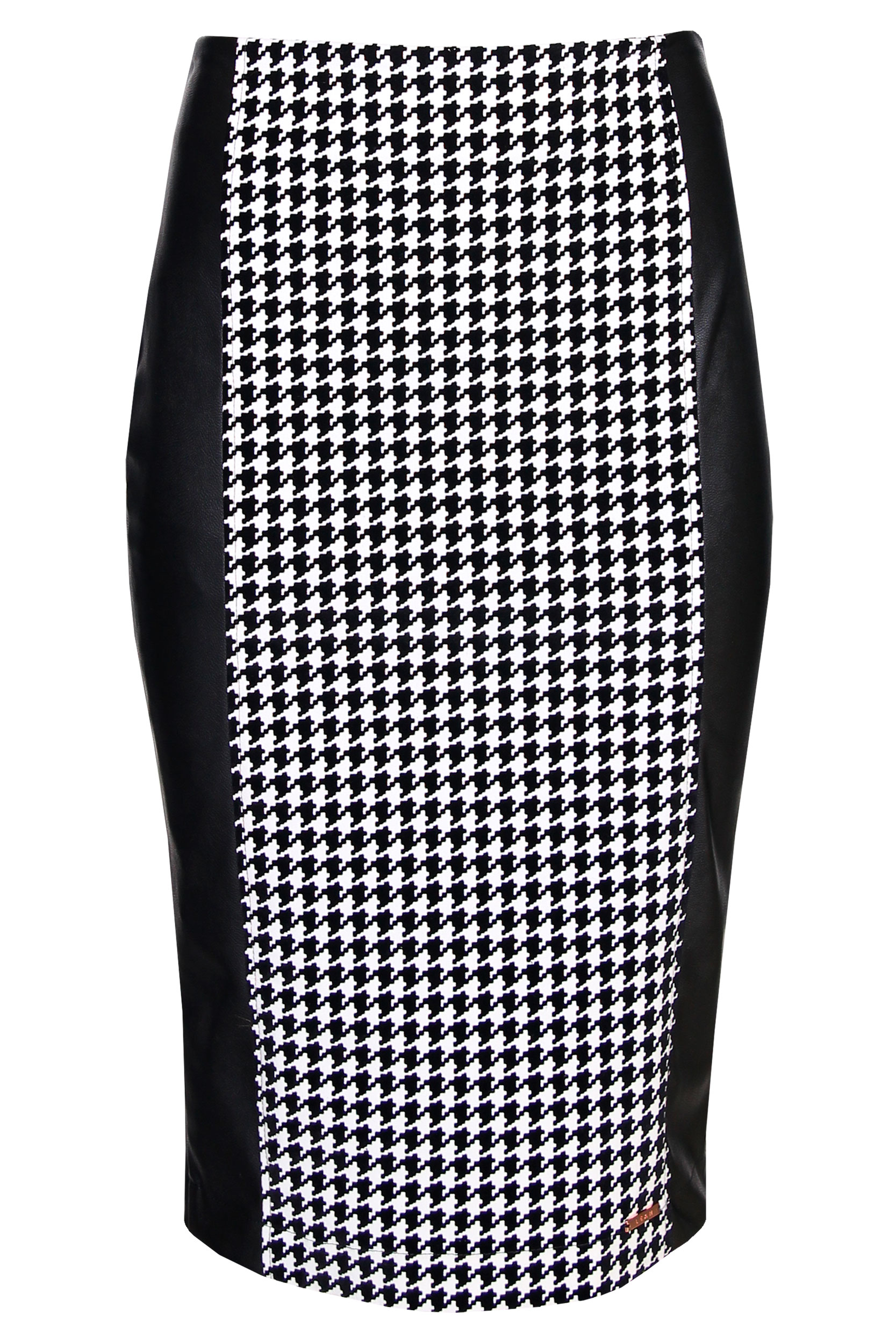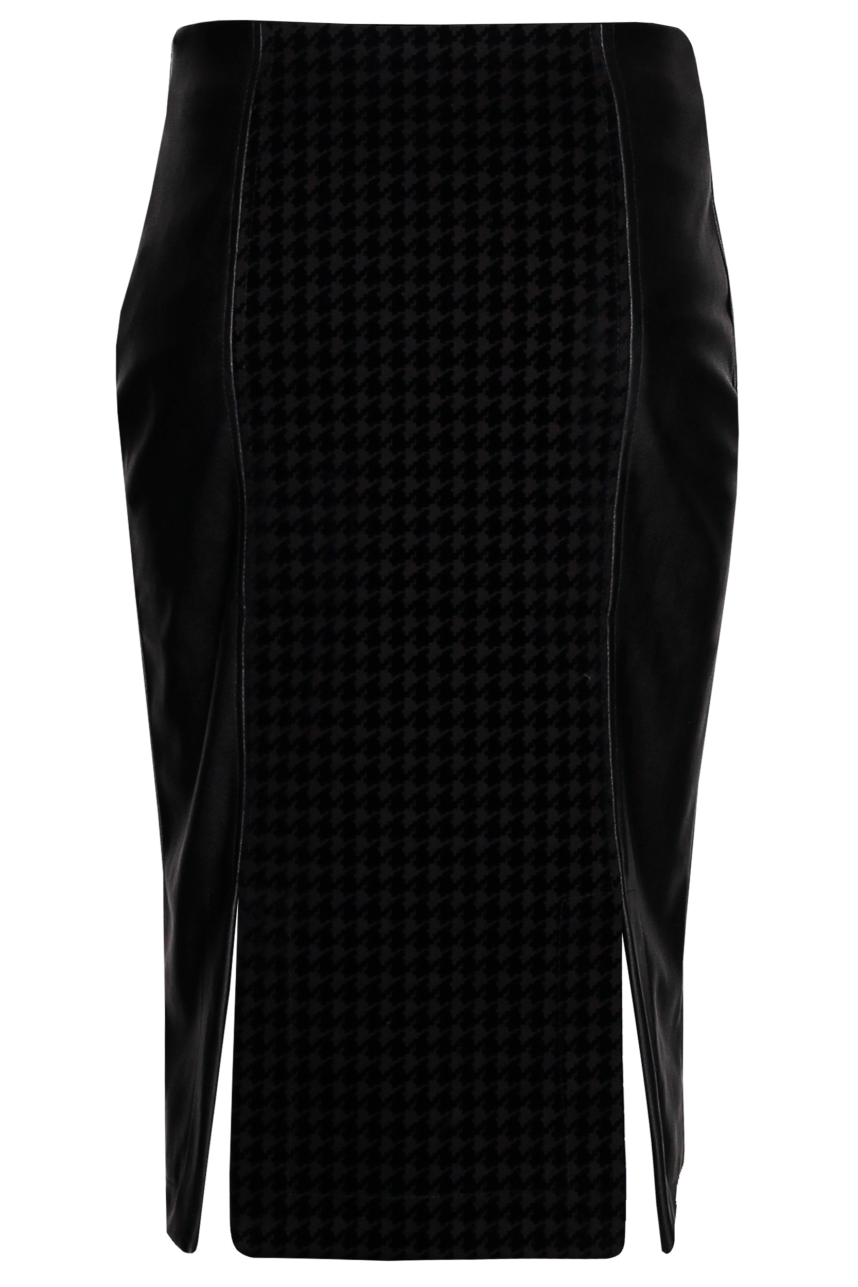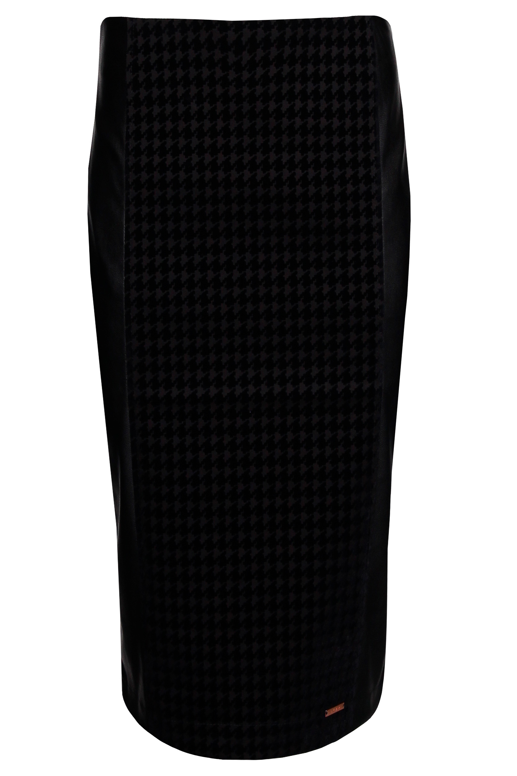 Saia midi de cintura subida. Tecido efeito pele nas laterais. Aberturas na parte inferior da costa. Fecho oculto na costura lateral.
