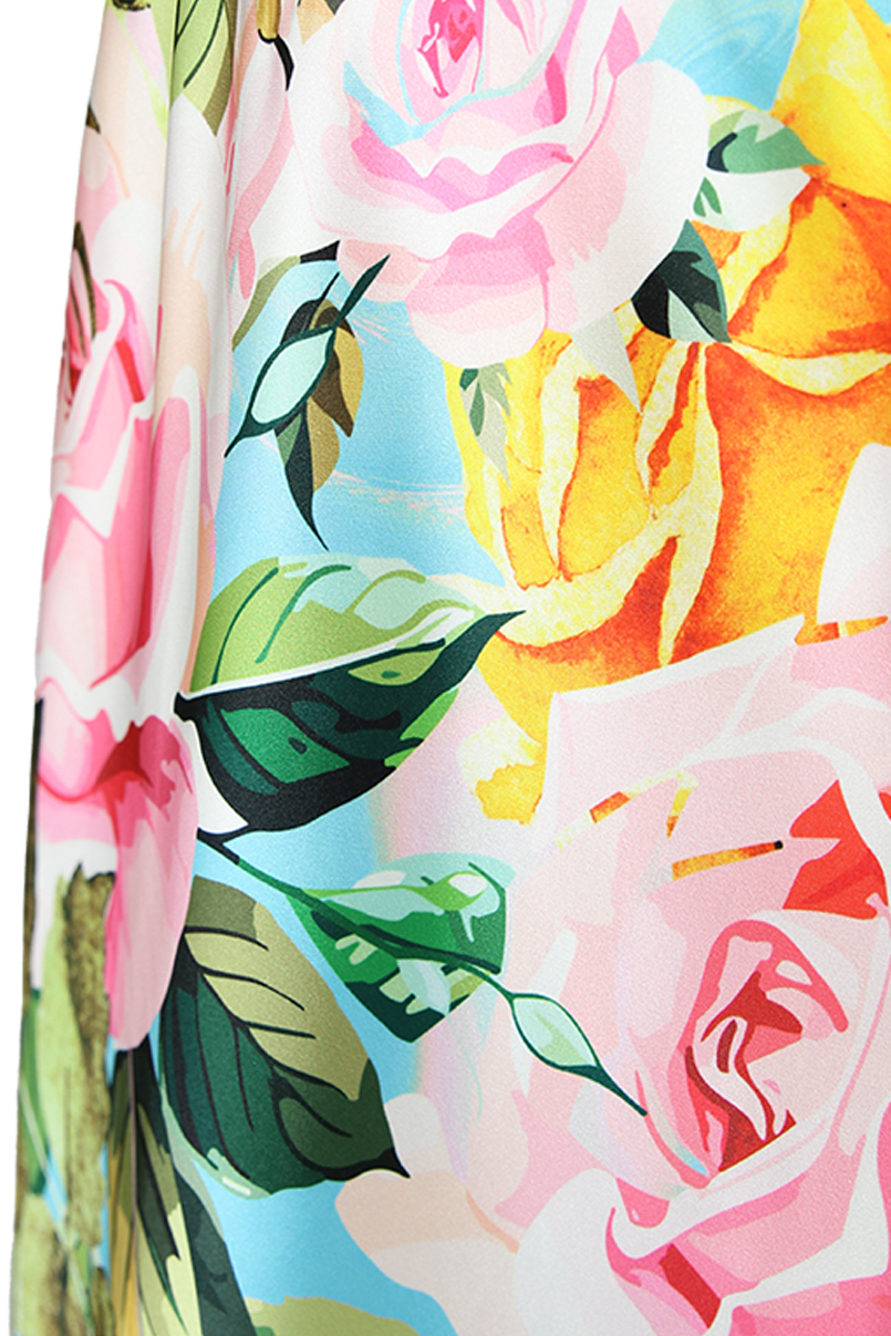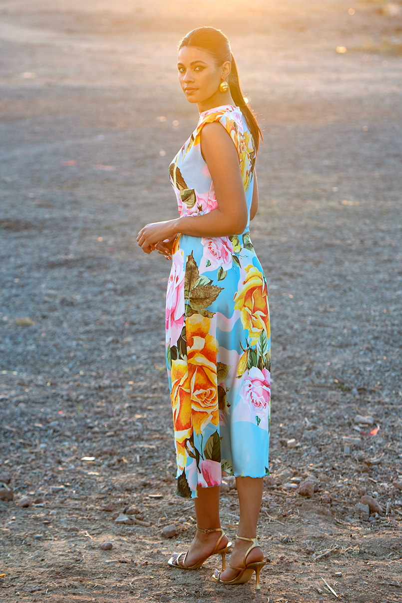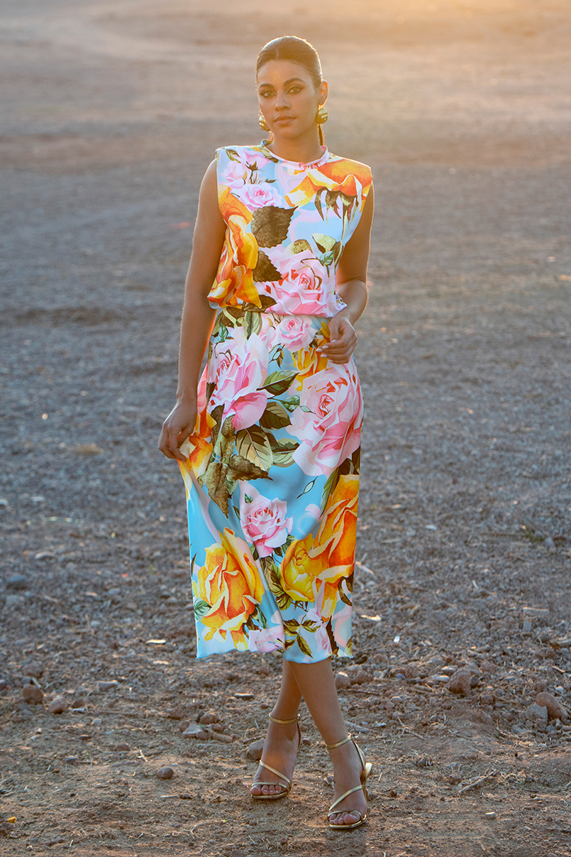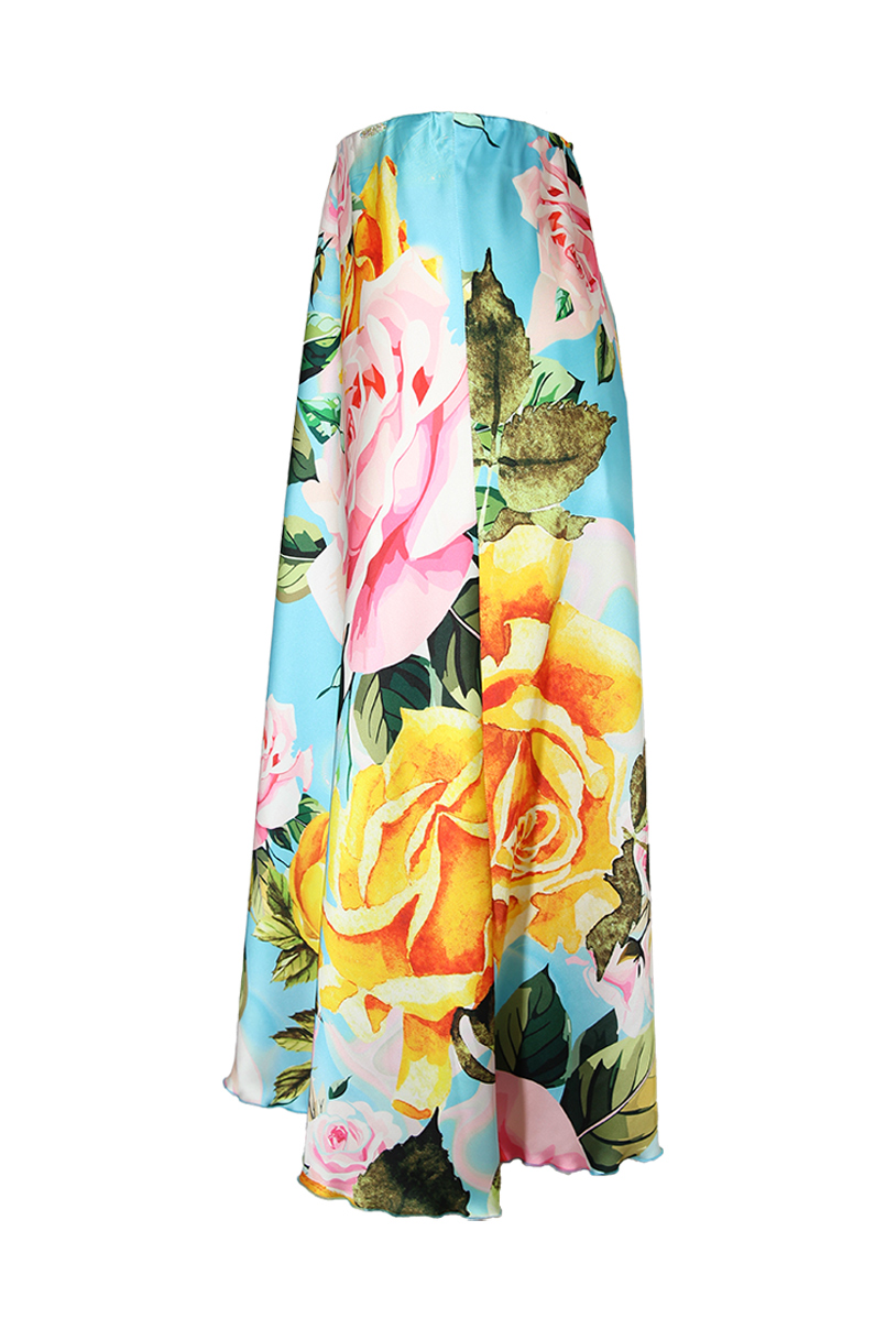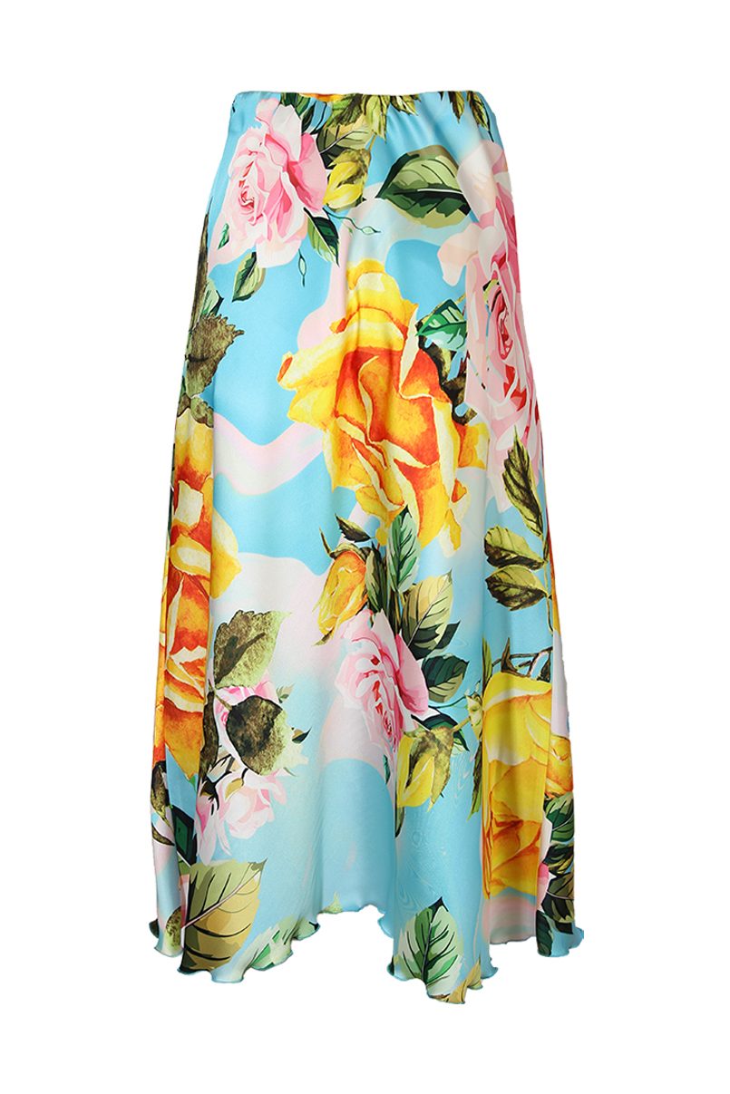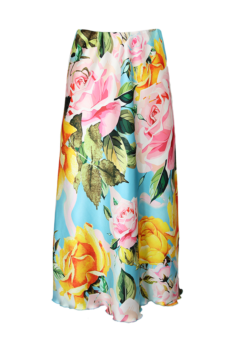 Saia de cintura subida com cós elástico. Confecionada em cetim estampado.