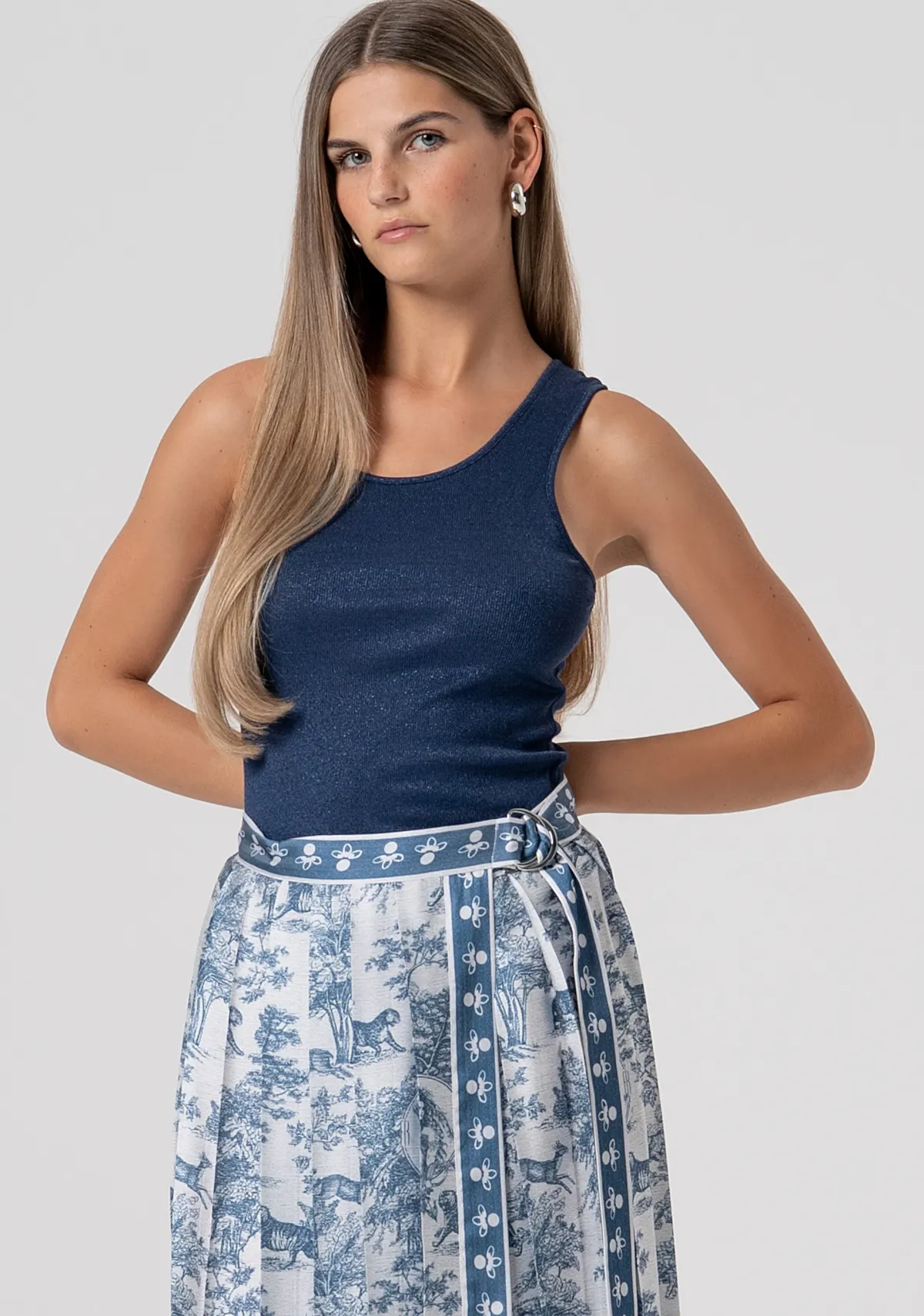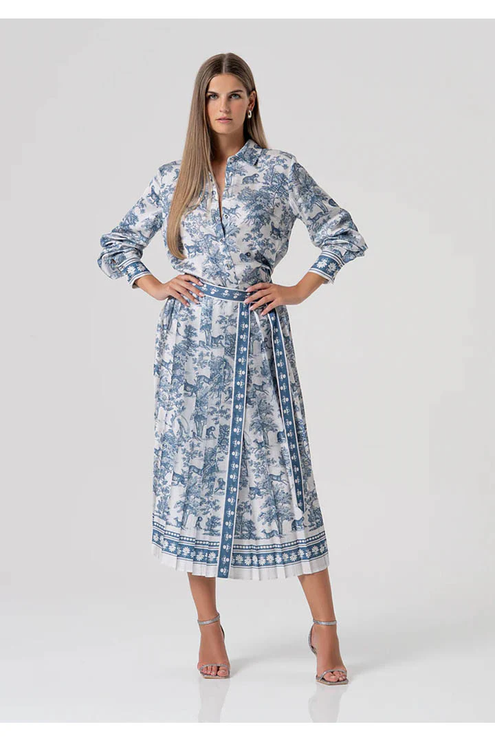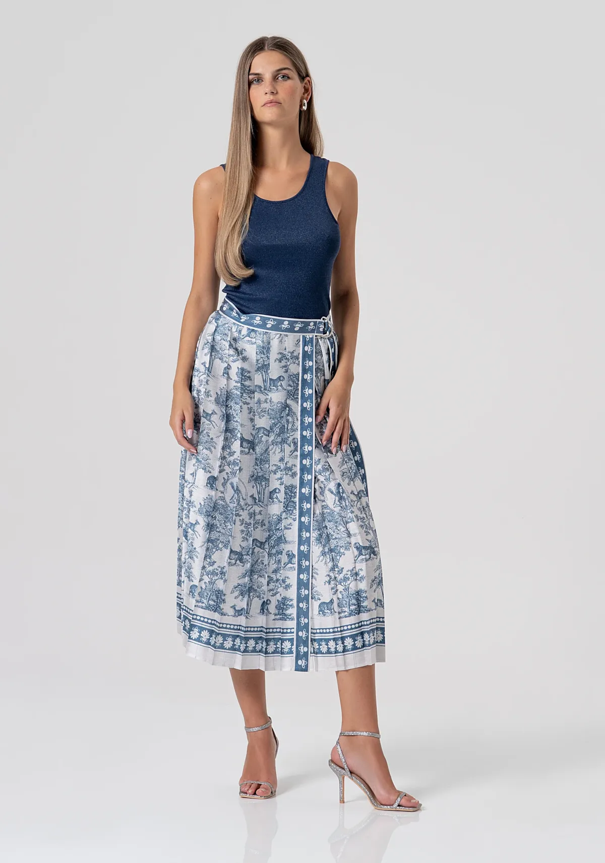 Saia midi evasê com estampa conceitual. Cintura regular com amarração lateral e tecido com efeito plissado.