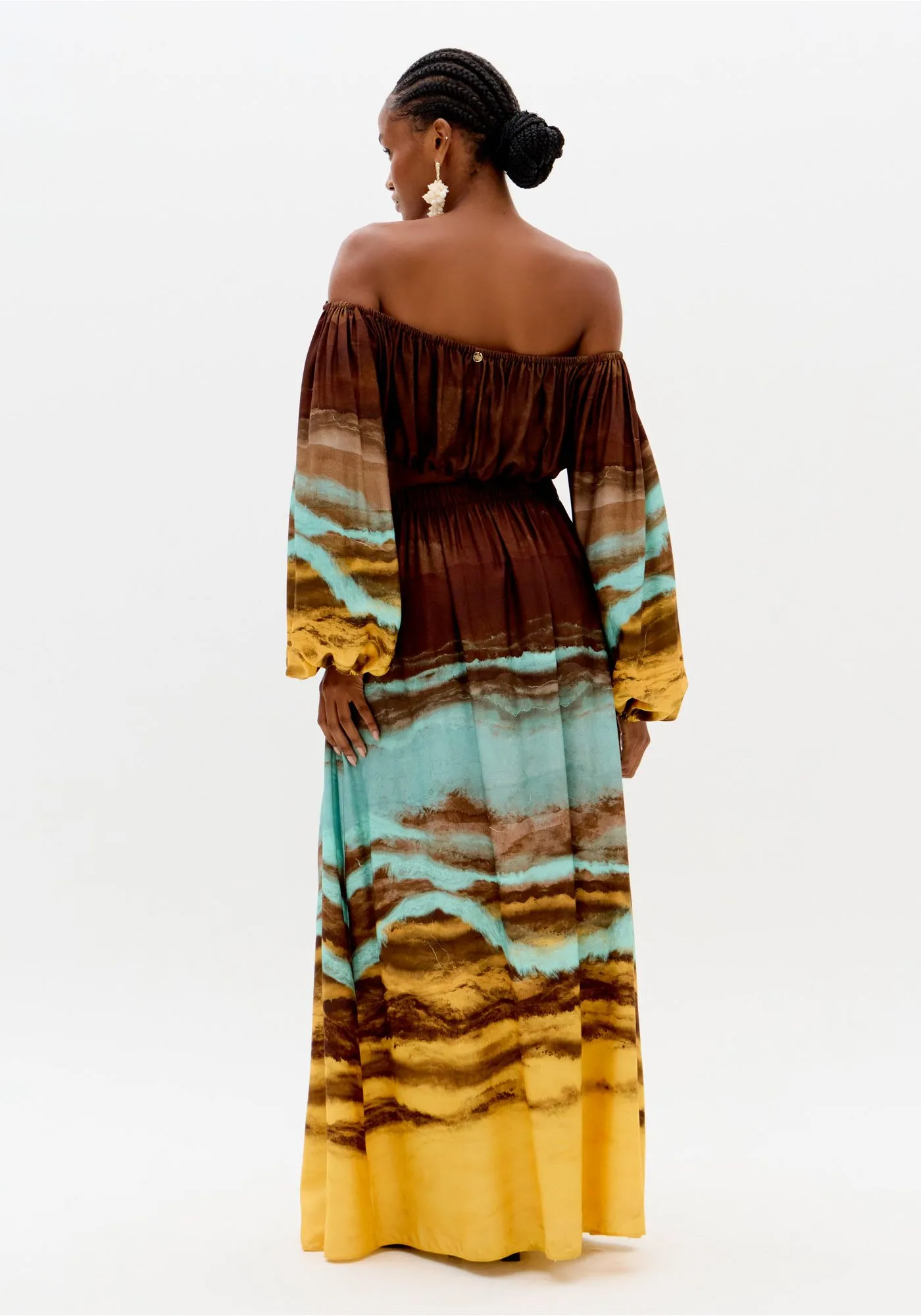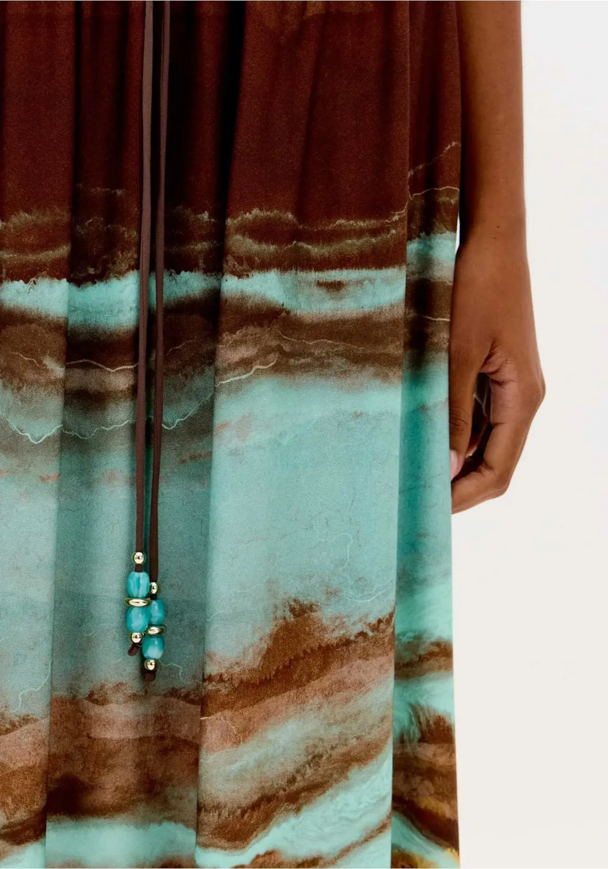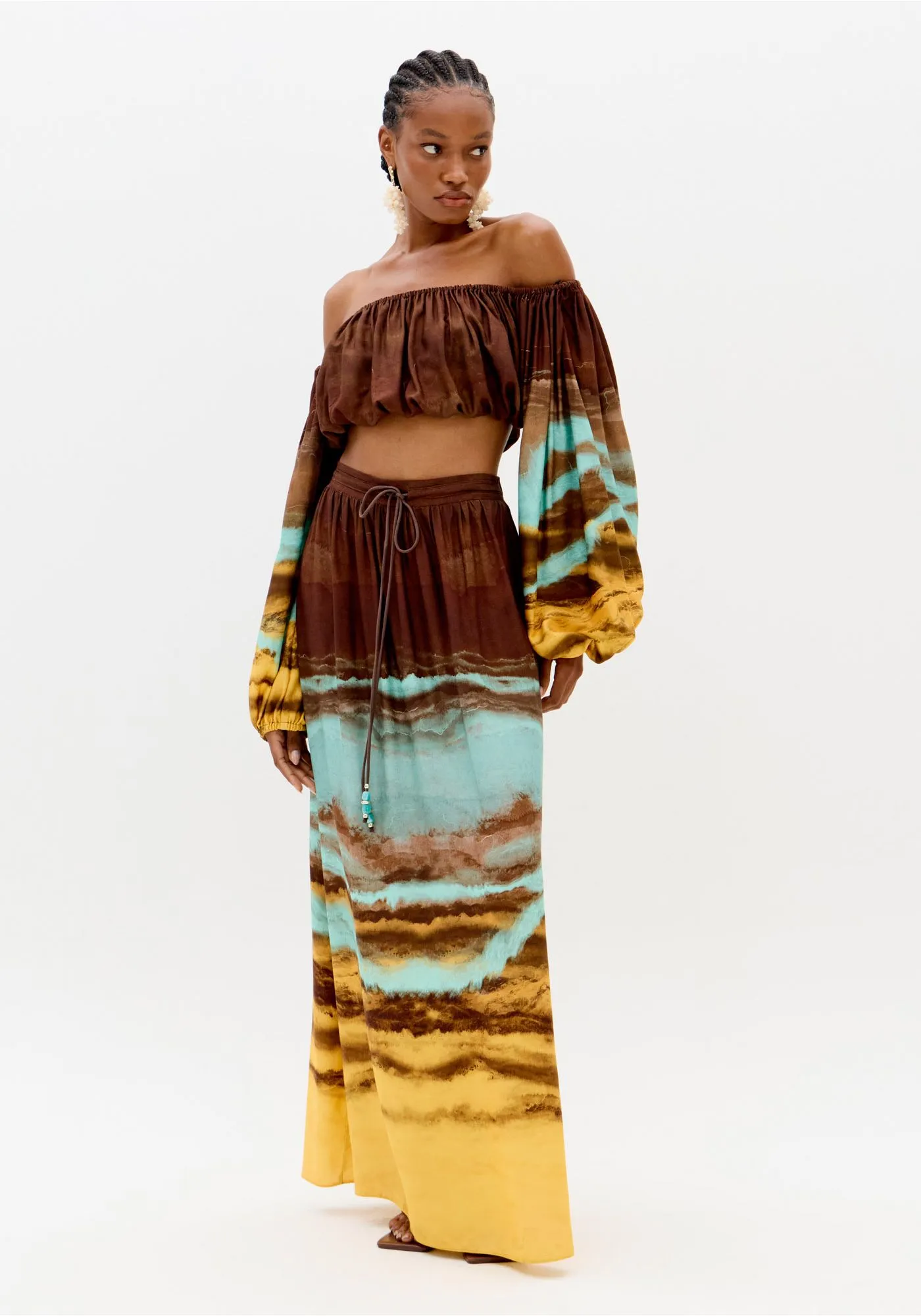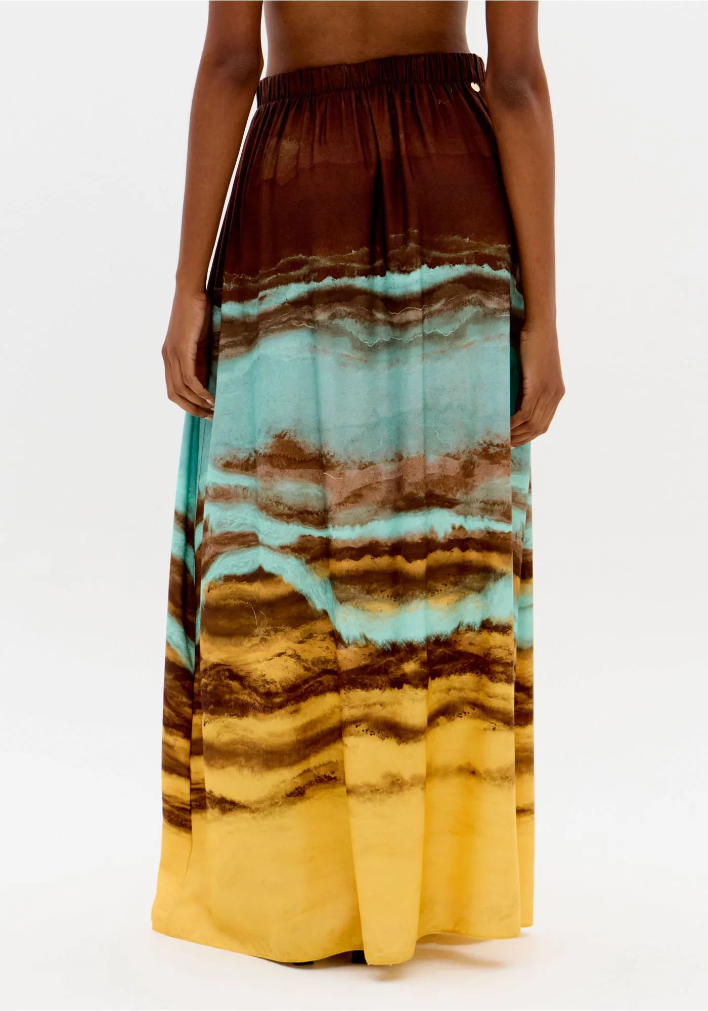 A saia super midi estampada é confeccionada em tecido plano leve com cintura alta e cós elástico posterior aliado à amarração frontal ajustável. Seu caimento amplo cria um efeito fluido e sofisticado no corpo. Use com cropped lp e eleve suas composições!