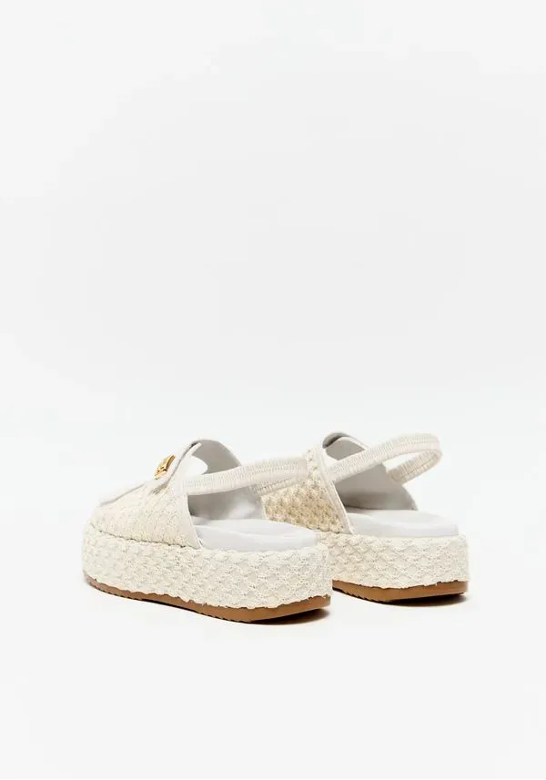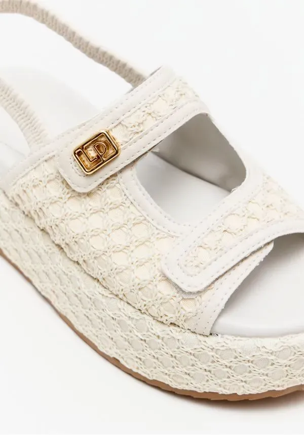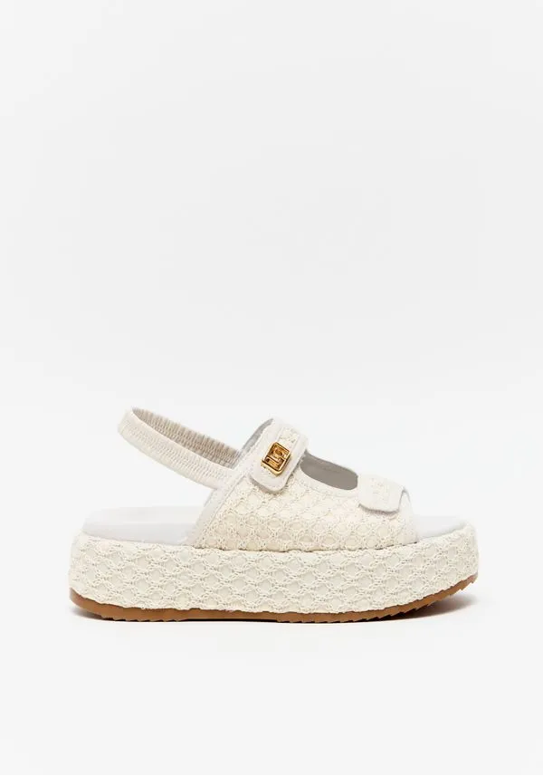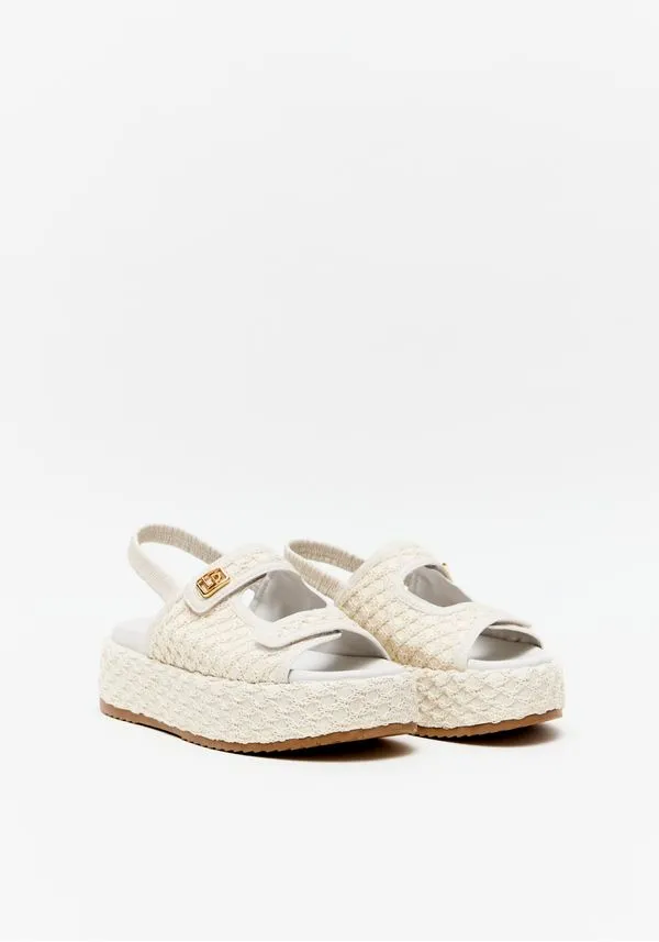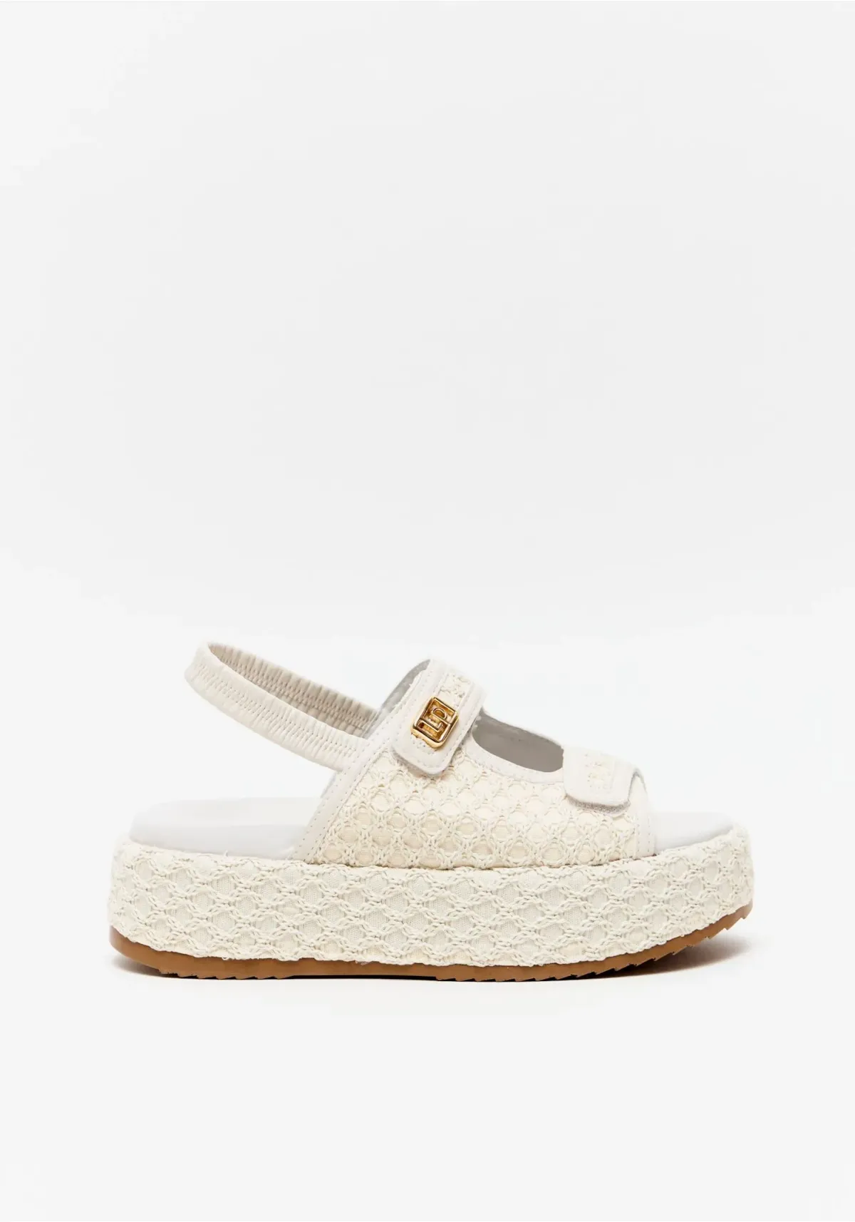 a sandália anabela em crochê traz frescor artesanal ao design contemporâneo. Seu solado robusto confere altura confortável, enquanto as tiras largas com fechamento prático garantem estabilidade. O detalhe metalizado lp adiciona sofisticação sutil ao modelo.