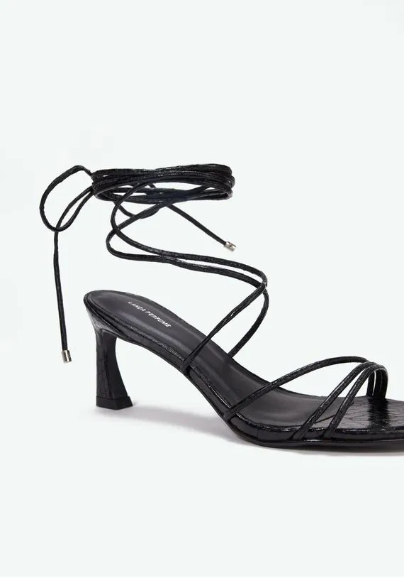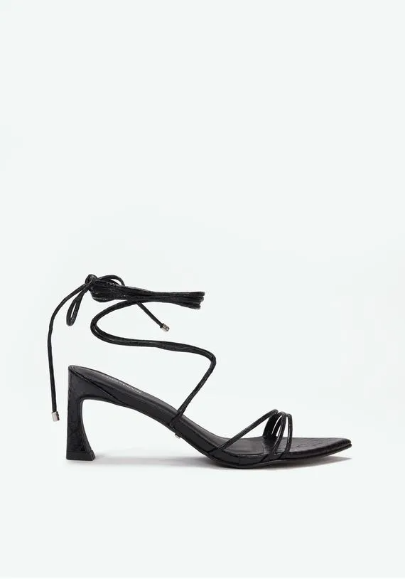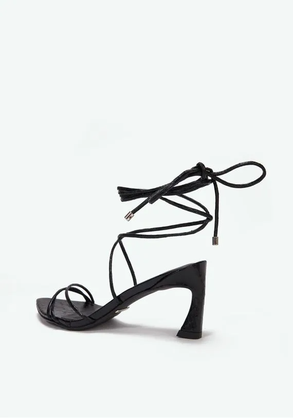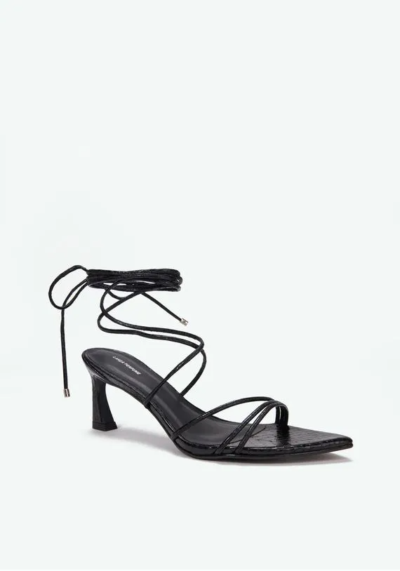 Sandália apresenta bico em formato de folha, salto e tiras para amarração. Aposte!