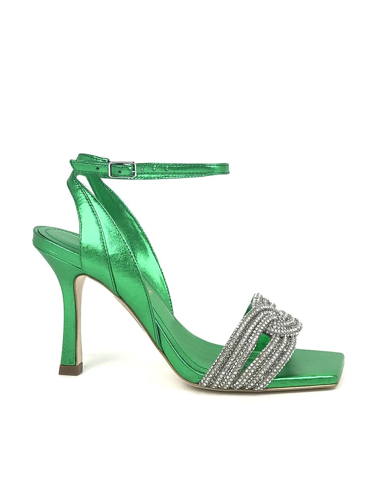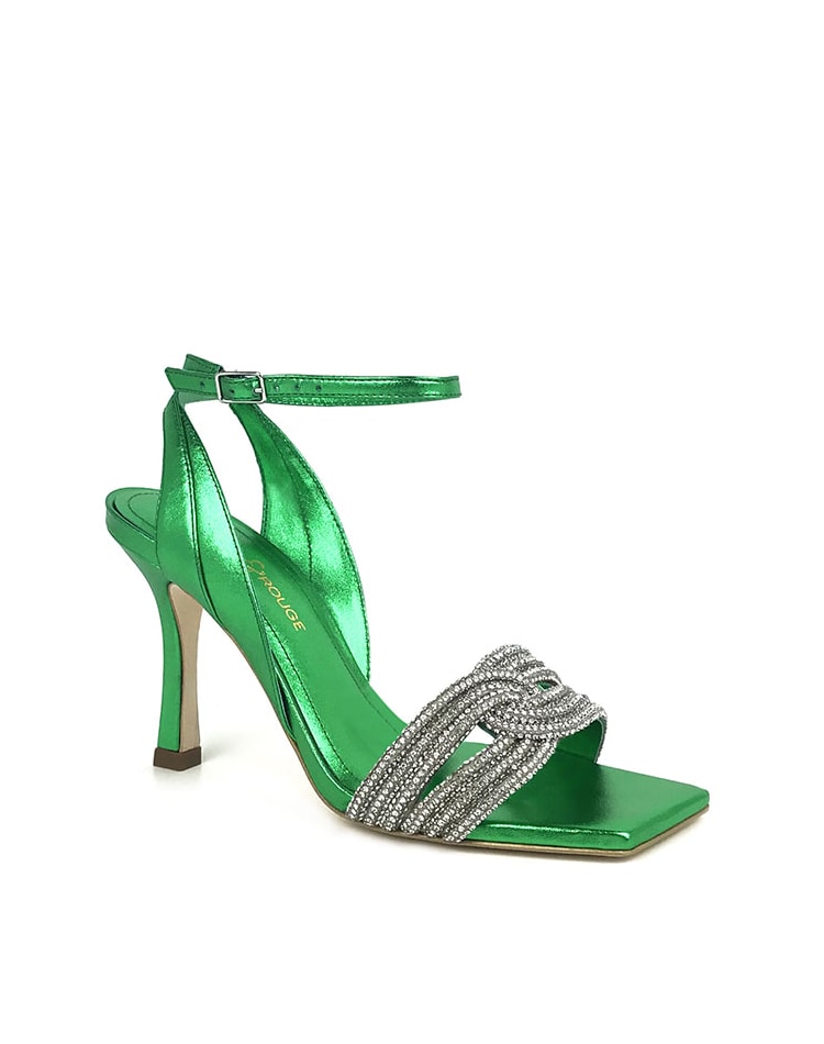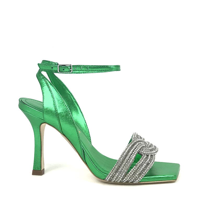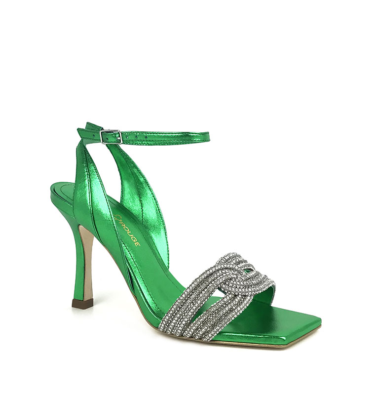 Uma glamorosa sandália com detalhes em strass, com cabedal liso metálico ou até mesmo em couro de cor sólida.