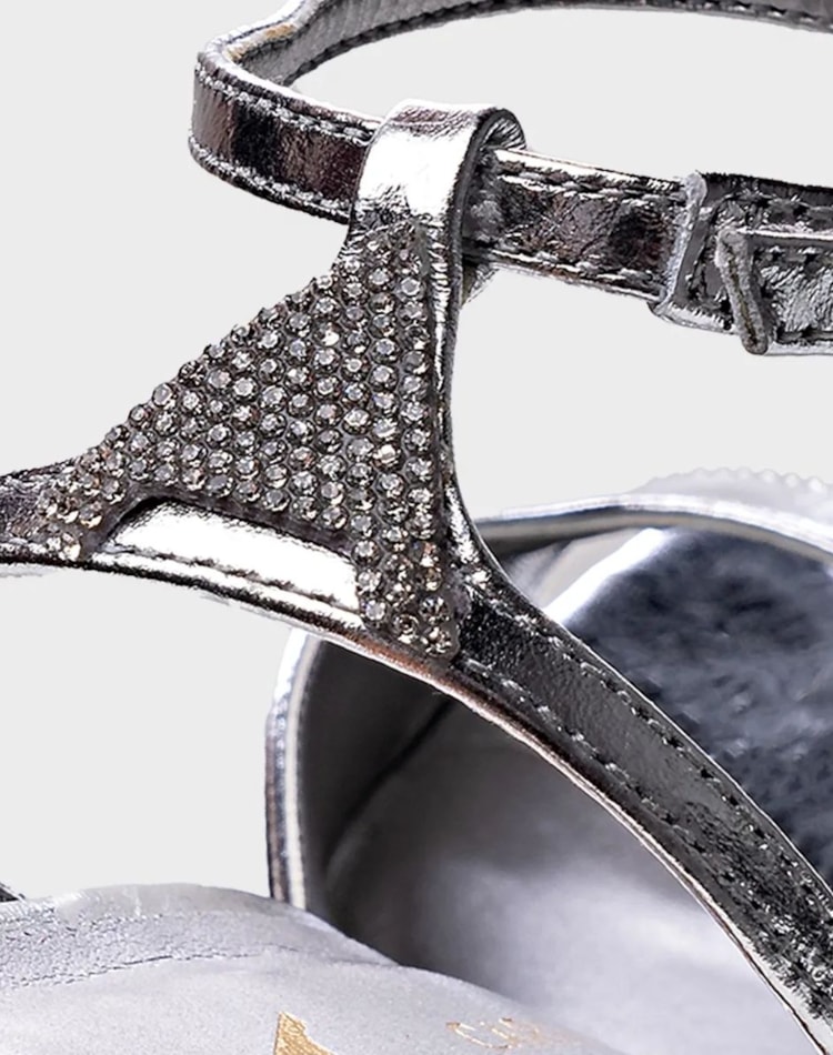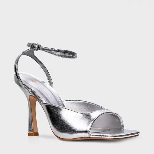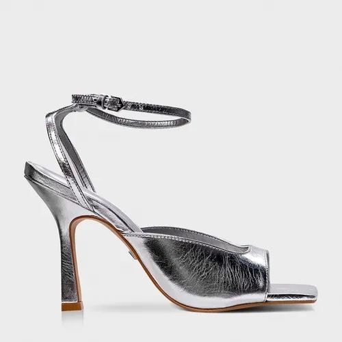 Sandália em couro spechio. A peça possui bico quadrado, tira com efeito de recorte no peito do pé e no tornozelo com fechamento em fivela. Salto fino alto e parte traseira aberta. Com palmilha da cor do modelo, possui também o ícone e a inscrição do nome da marca. FEITO EM COURO LEGÍTIM