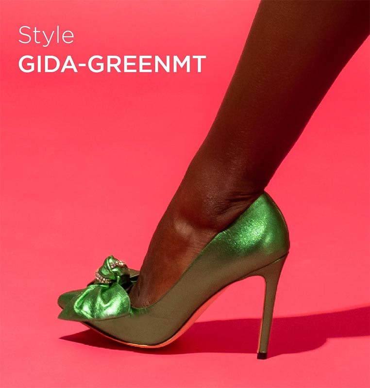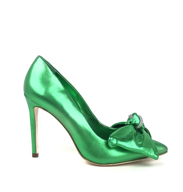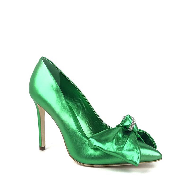 Um moderno scarpin bico fino, confeccionado em lindo couro com acabamento metalizado e laço frontal artesanal com detalhes em strass. Altura do Salto: 10cm