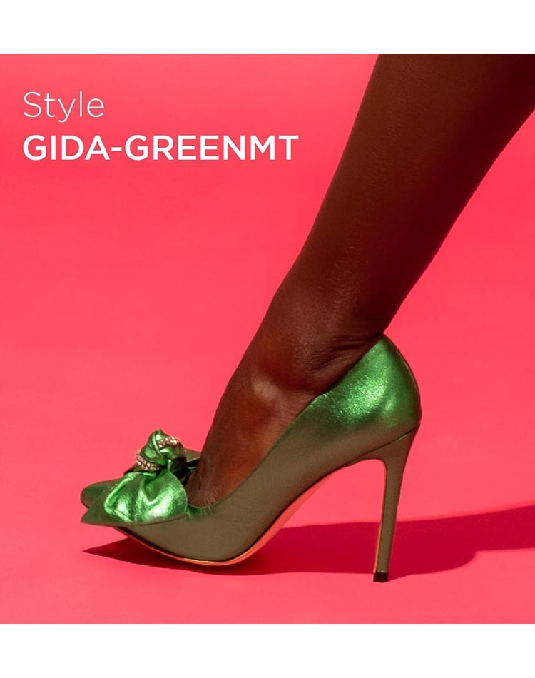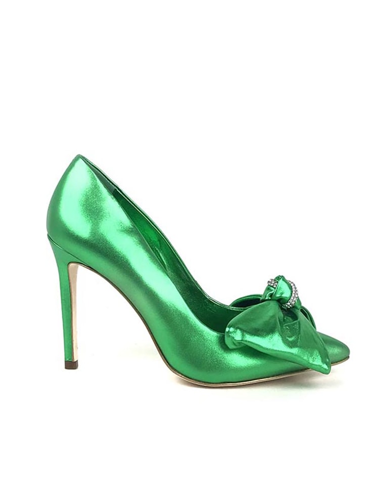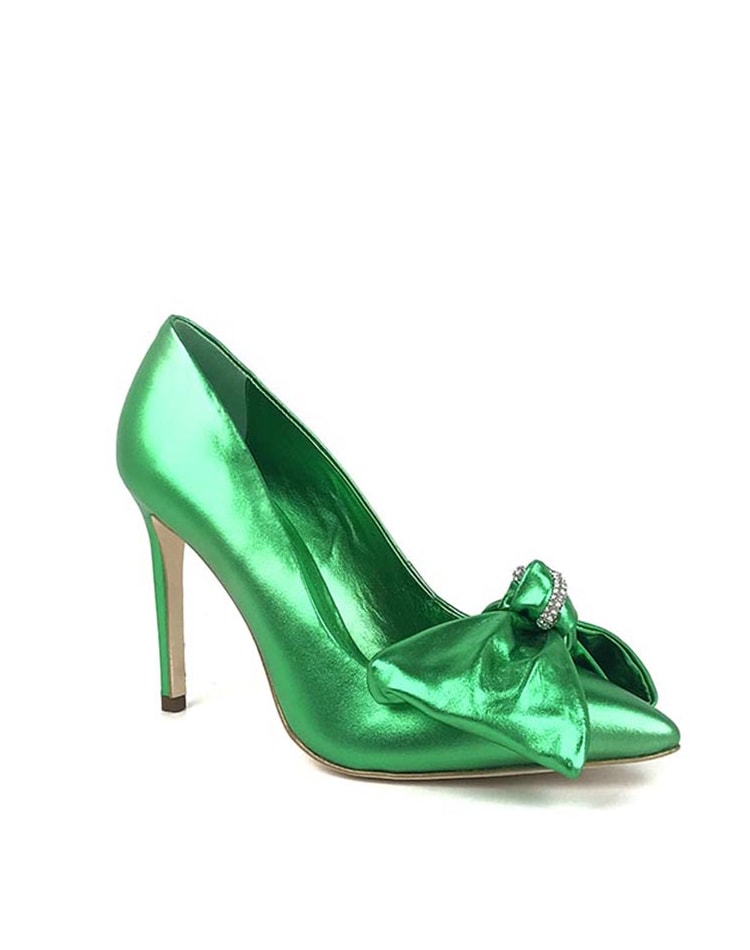 Um moderno scarpin bico fino, confeccionado em lindo couro com acabamento metalizado e laço frontal artesanal com detalhes em strass. Altura do Salto: 10cm