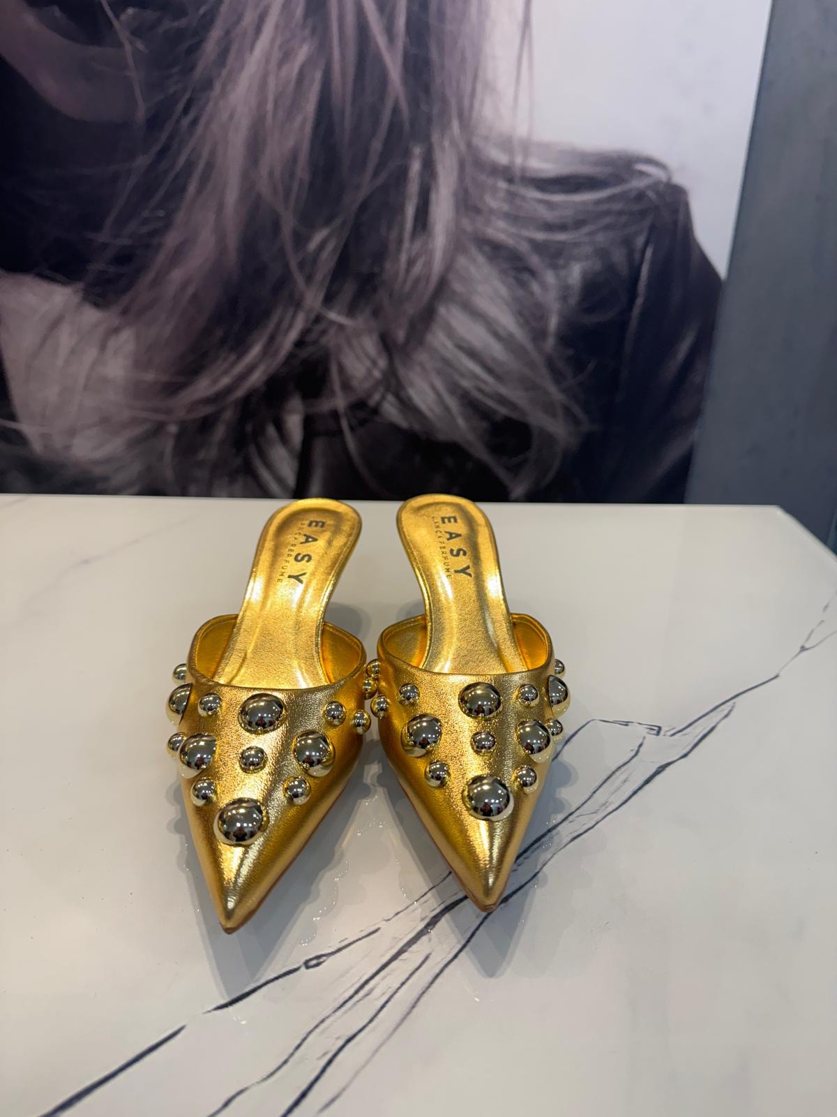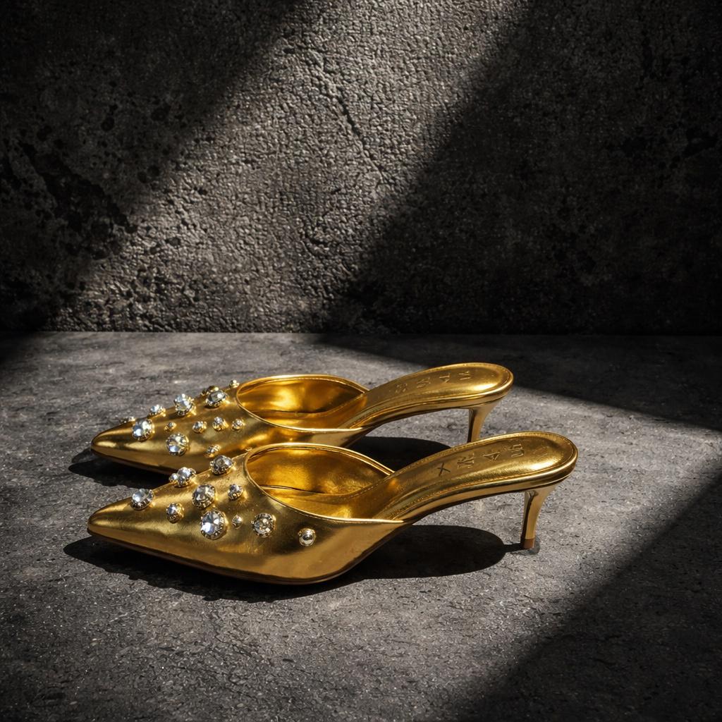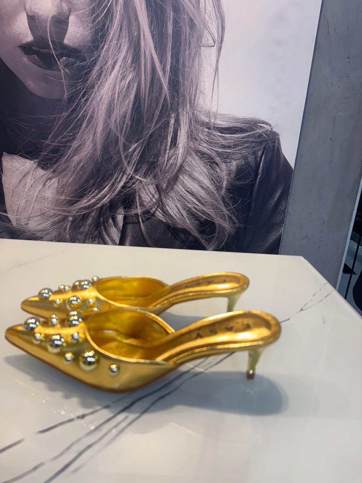 A sandália feminina em couro com salto fino e design flip flop traz sofisticação ao visual com pedras exuberântes e metais dourados. A palmilha macia e o bico quadrado atualizam a proposta. aposte para um look poderoso e elegant
