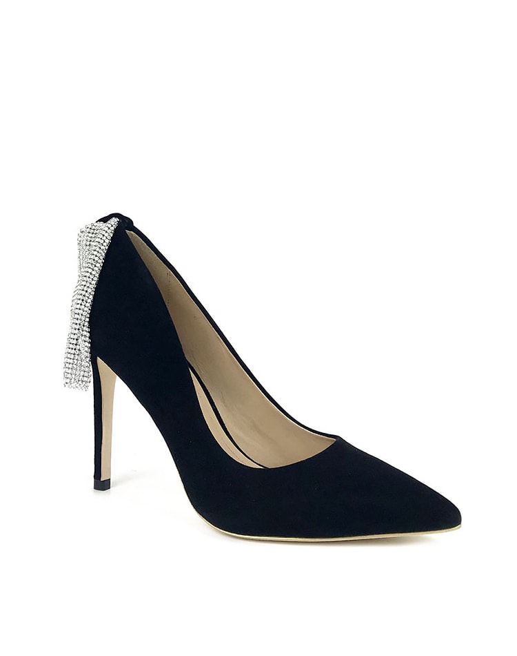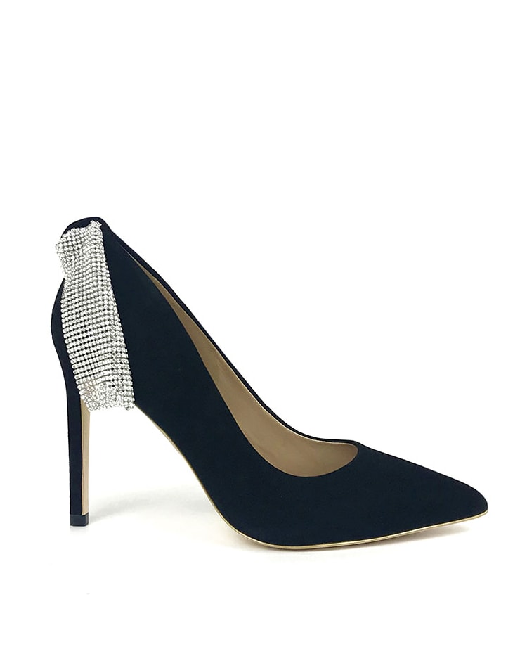 A camurça perfeita ou até mesmo a bomba de couro liso, para o seu humor elegante. O salto esvoaçante com babados de strass favorece a feminilidade e a elegância.