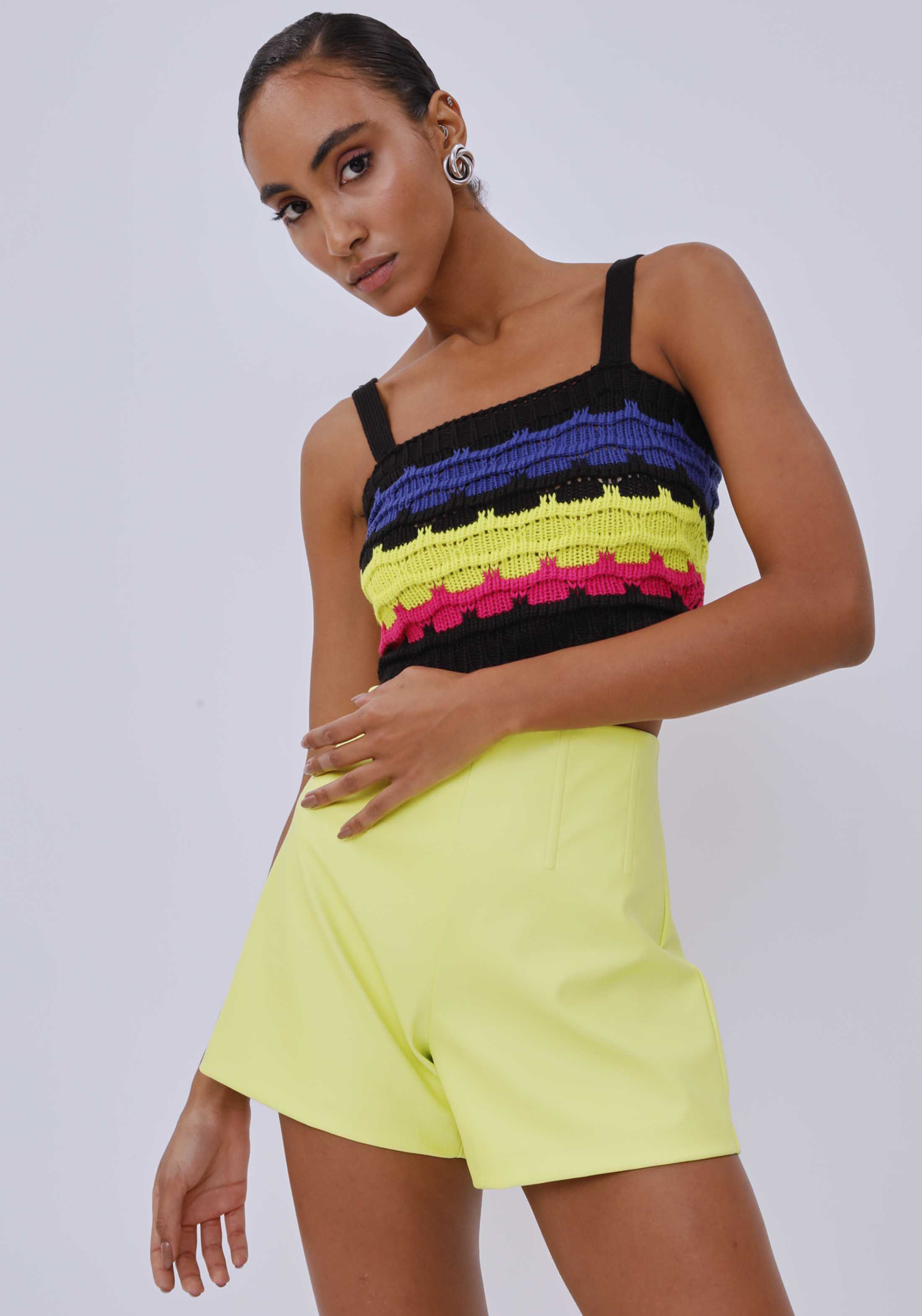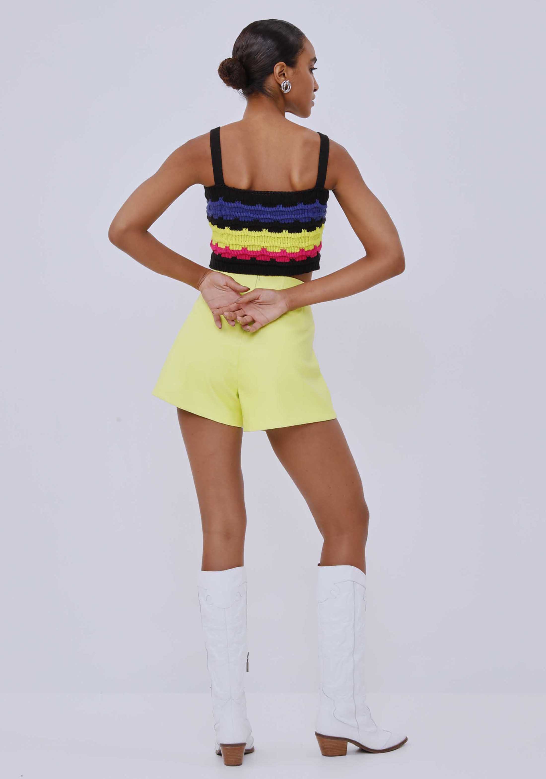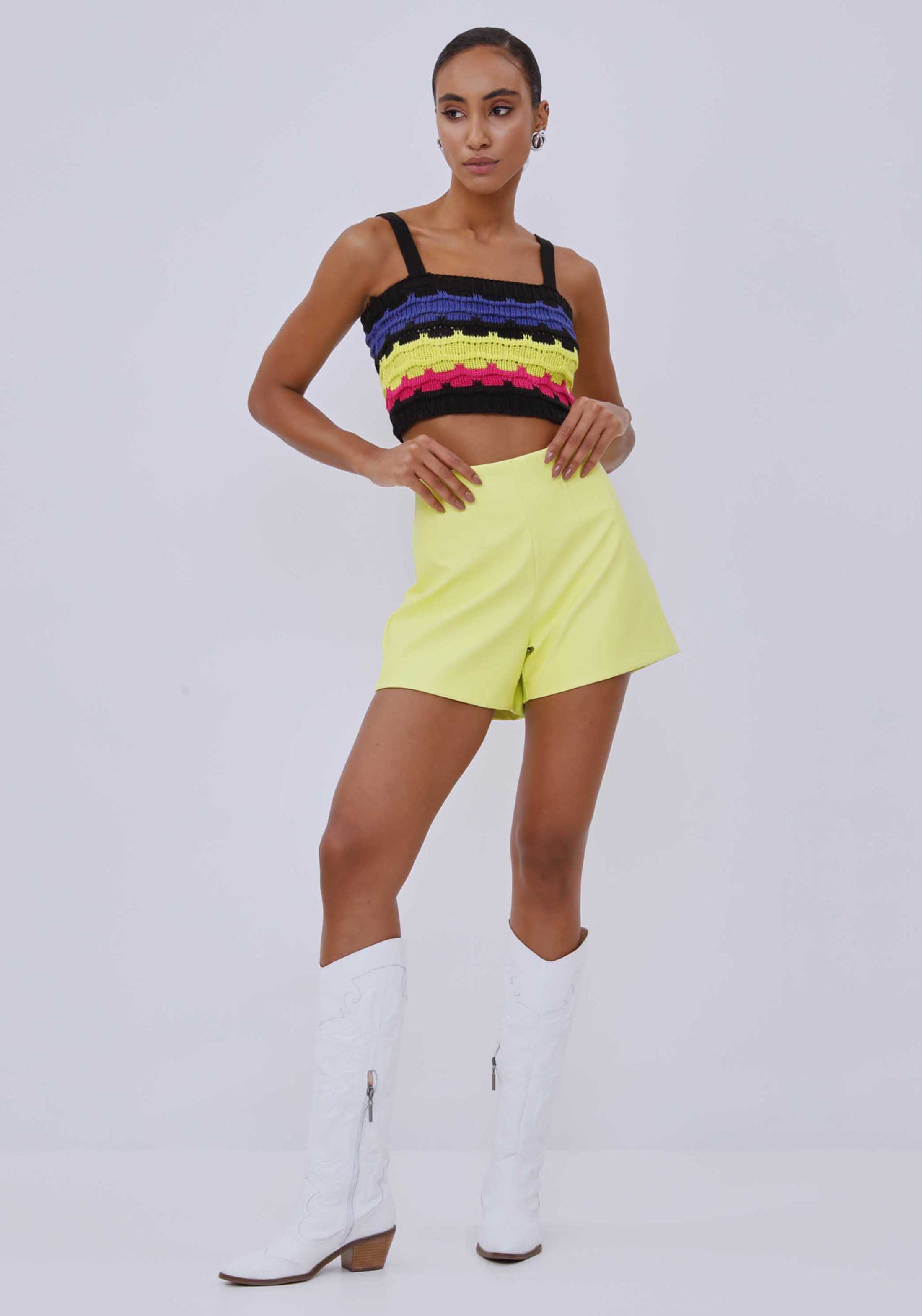 CALÇOES CURTOS, SILHUETA CORSET E FECHAMENTO POSTERIOR POR ZÍPER. APOSTE COM TOP E BOTA PARA UM VISUAL COMFY.