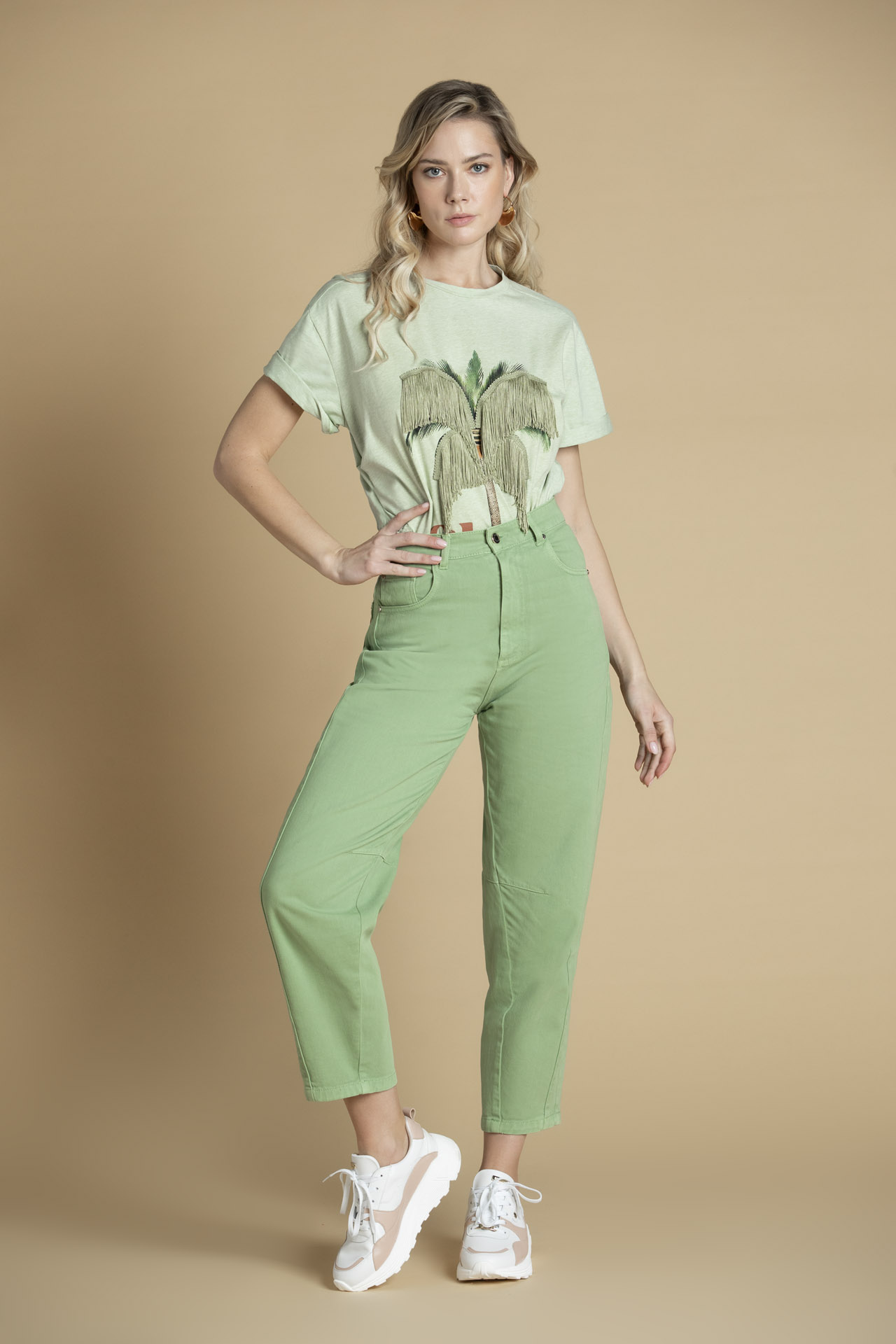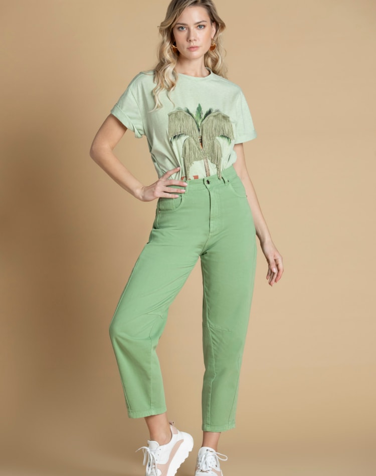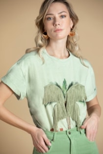 Esta t-shirt, em fio de algodão macio, transporta-nos para o espírito descontraído e elegante do verão. A estampa de palmeira, com as suas folhas em franjas, é um convite a momentos de liberdade e estilo. A mensagem "Oh darling" completa a peça com um toque de charme e ousadia.