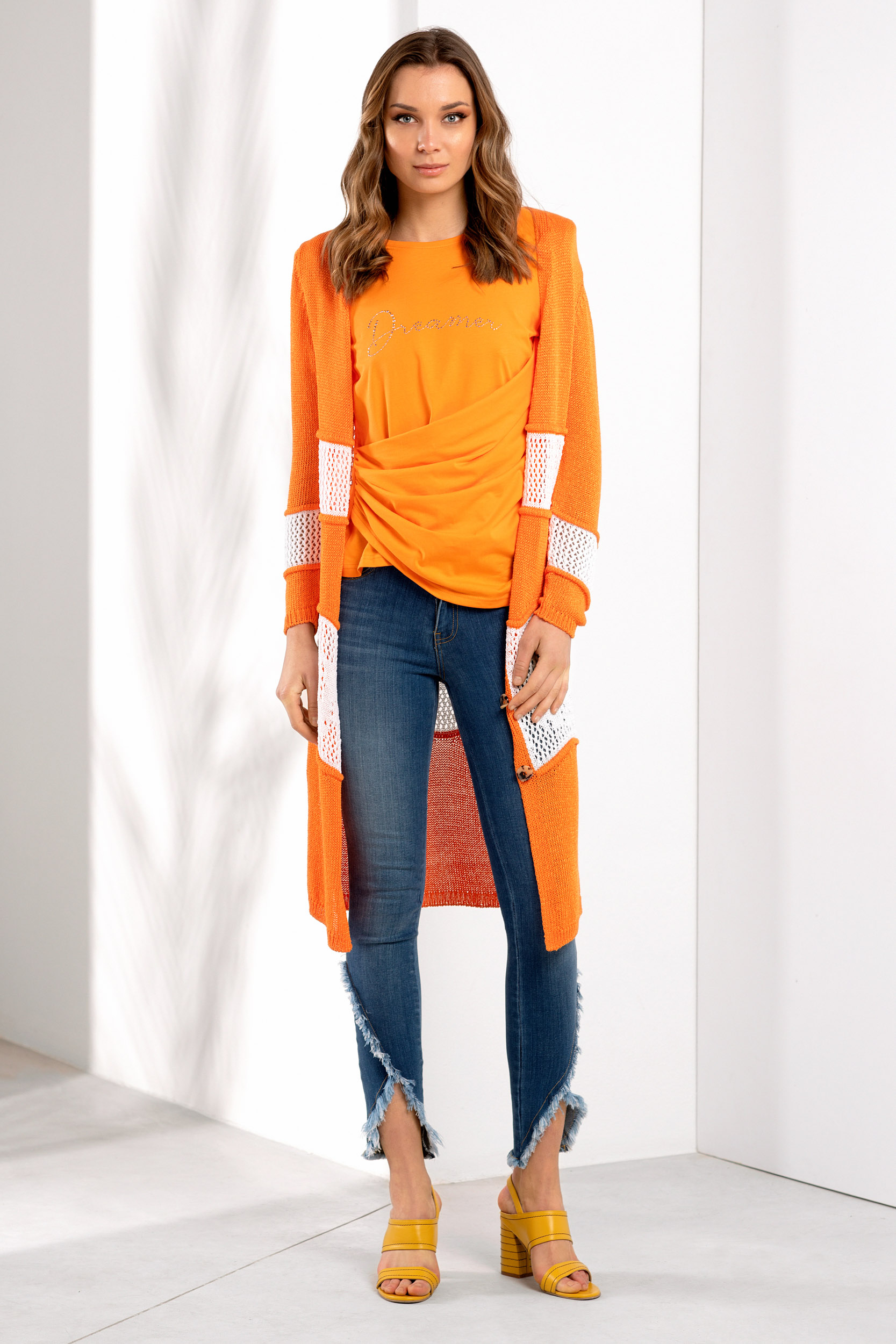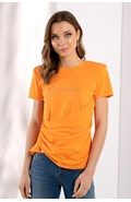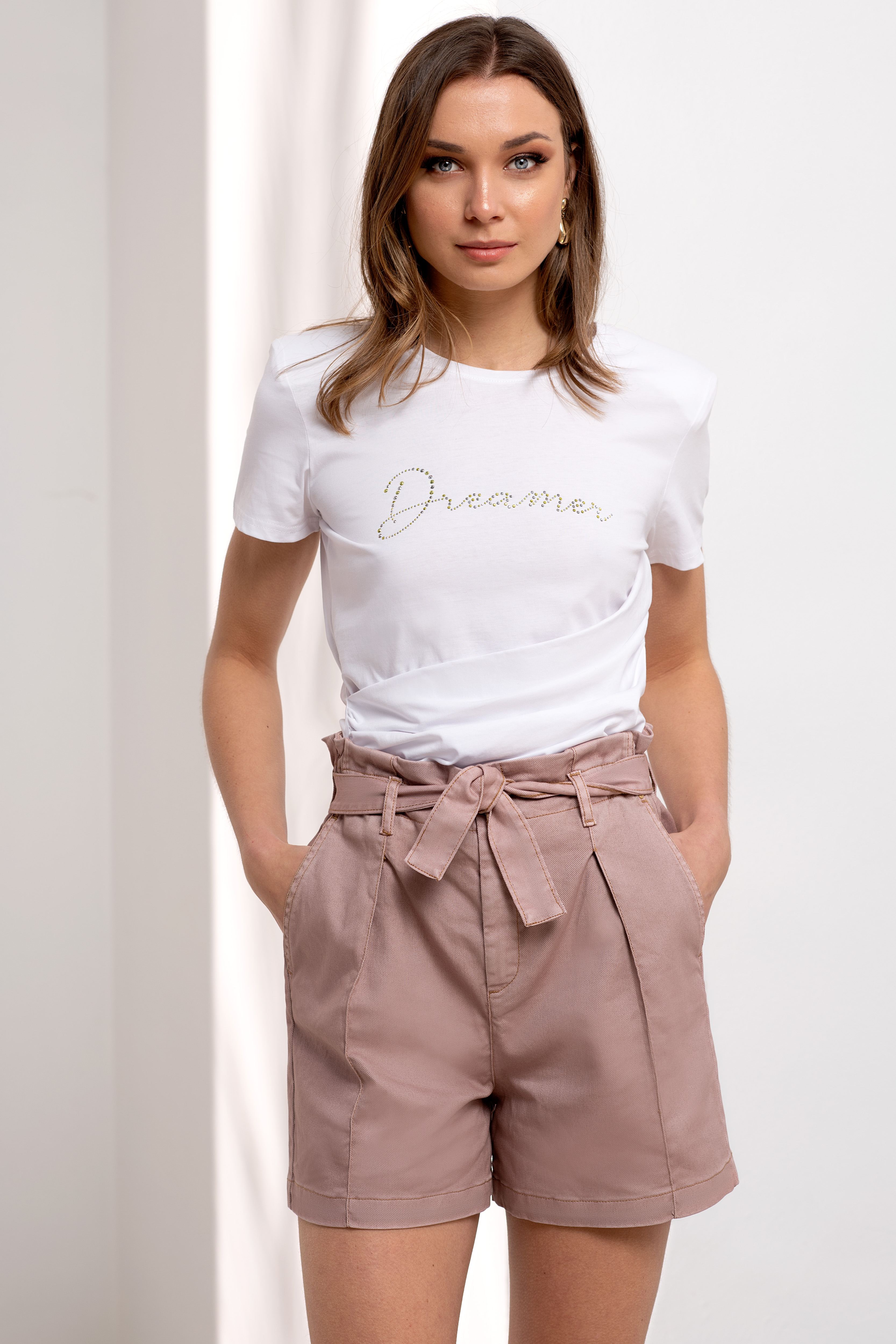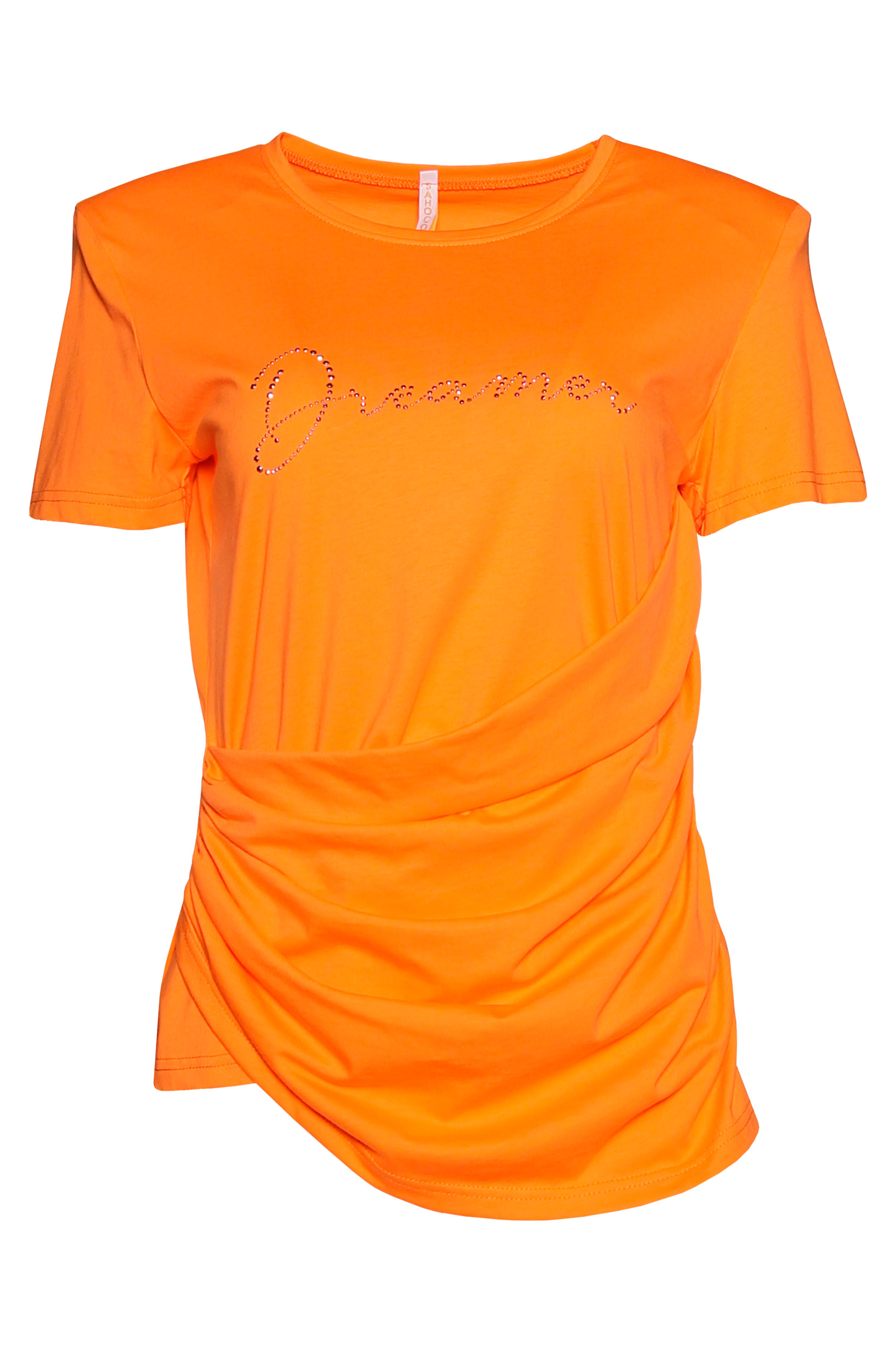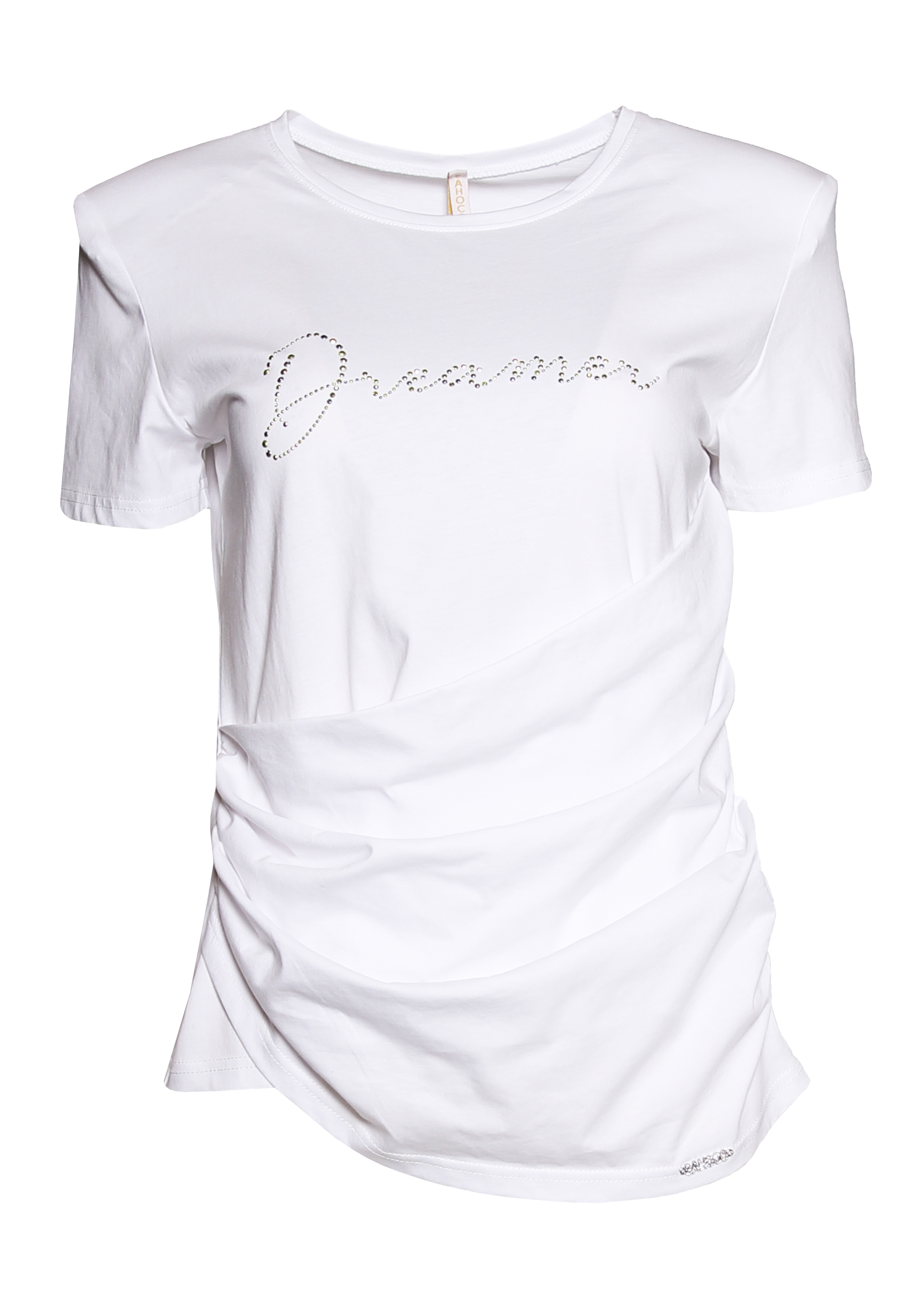 T-shirt gola redonda e manga curta. Detalhe de pregas na lateral e texto "Dreamer" à frente.