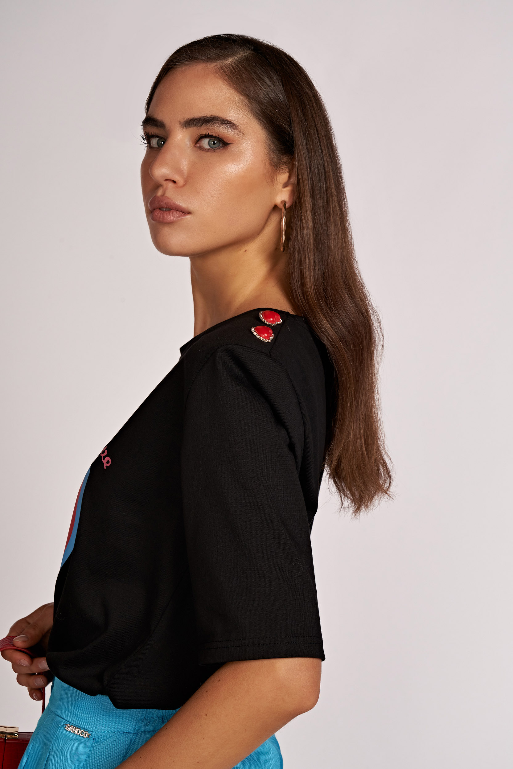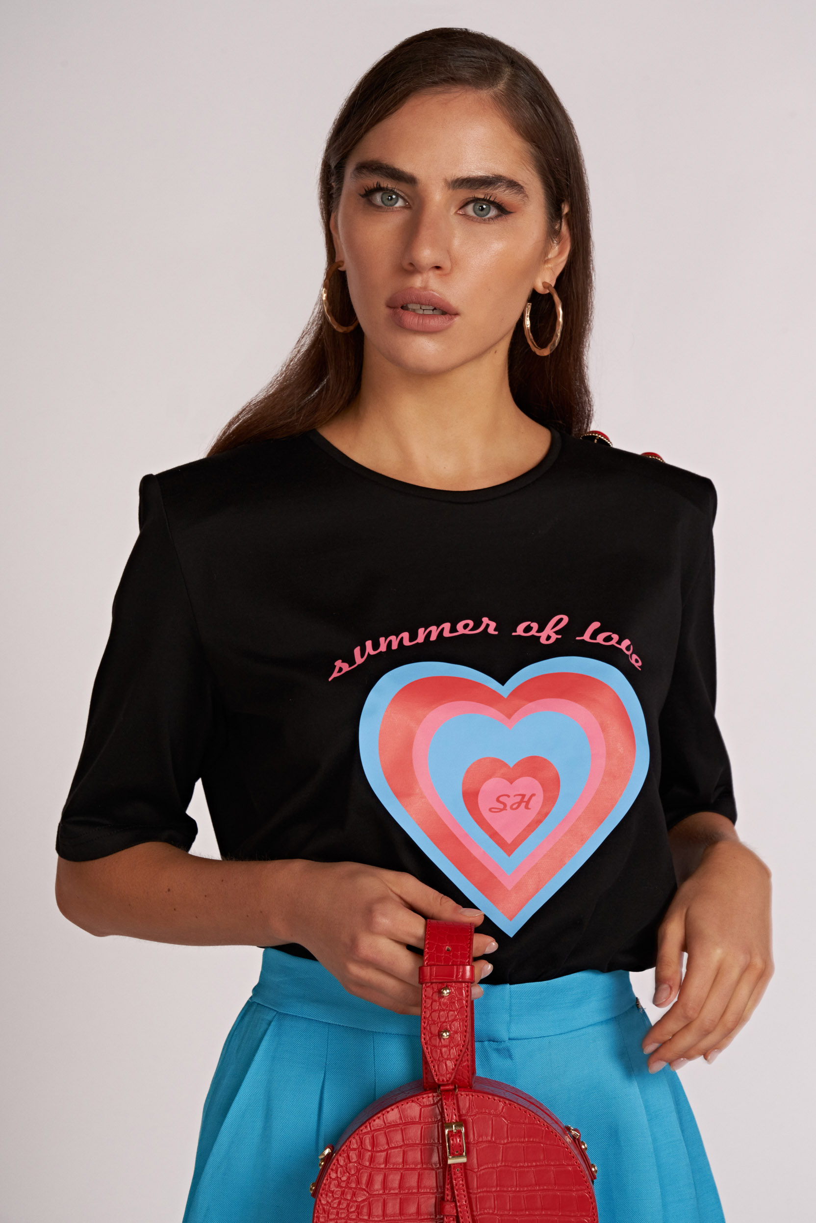T-shirt de manga curta e decote redondo com chumaços e apliques nos ombros. Pormenor de estampa à frente.